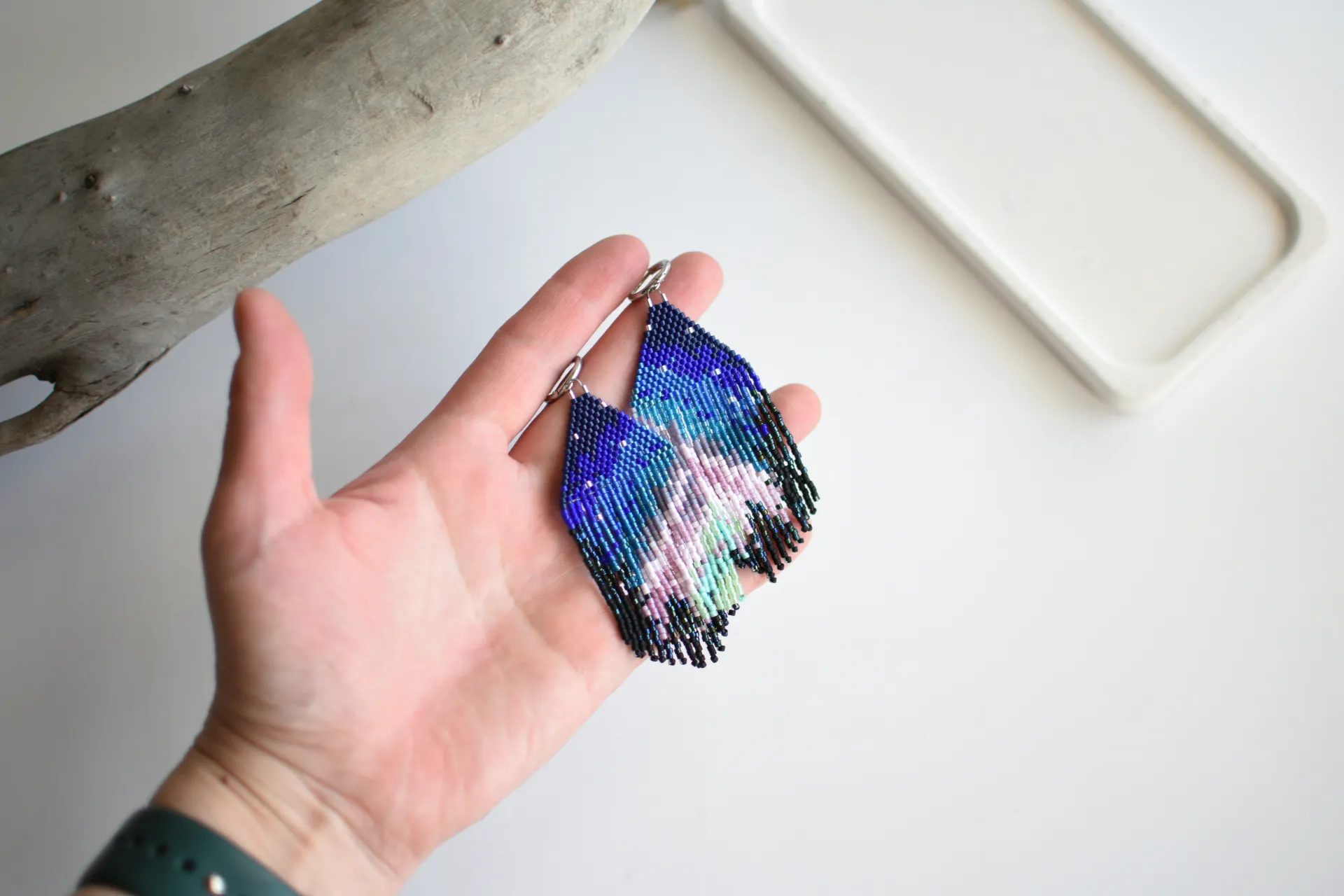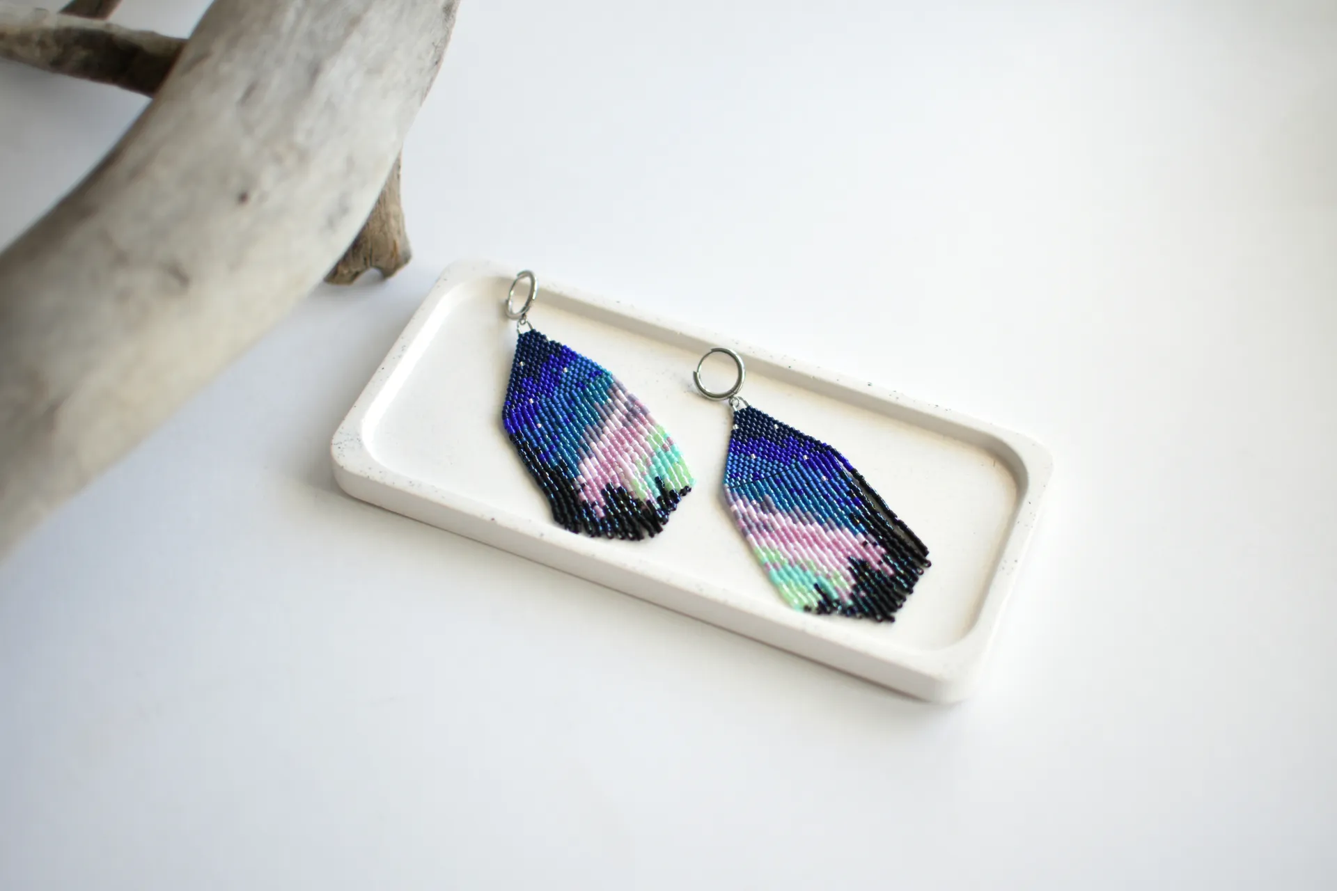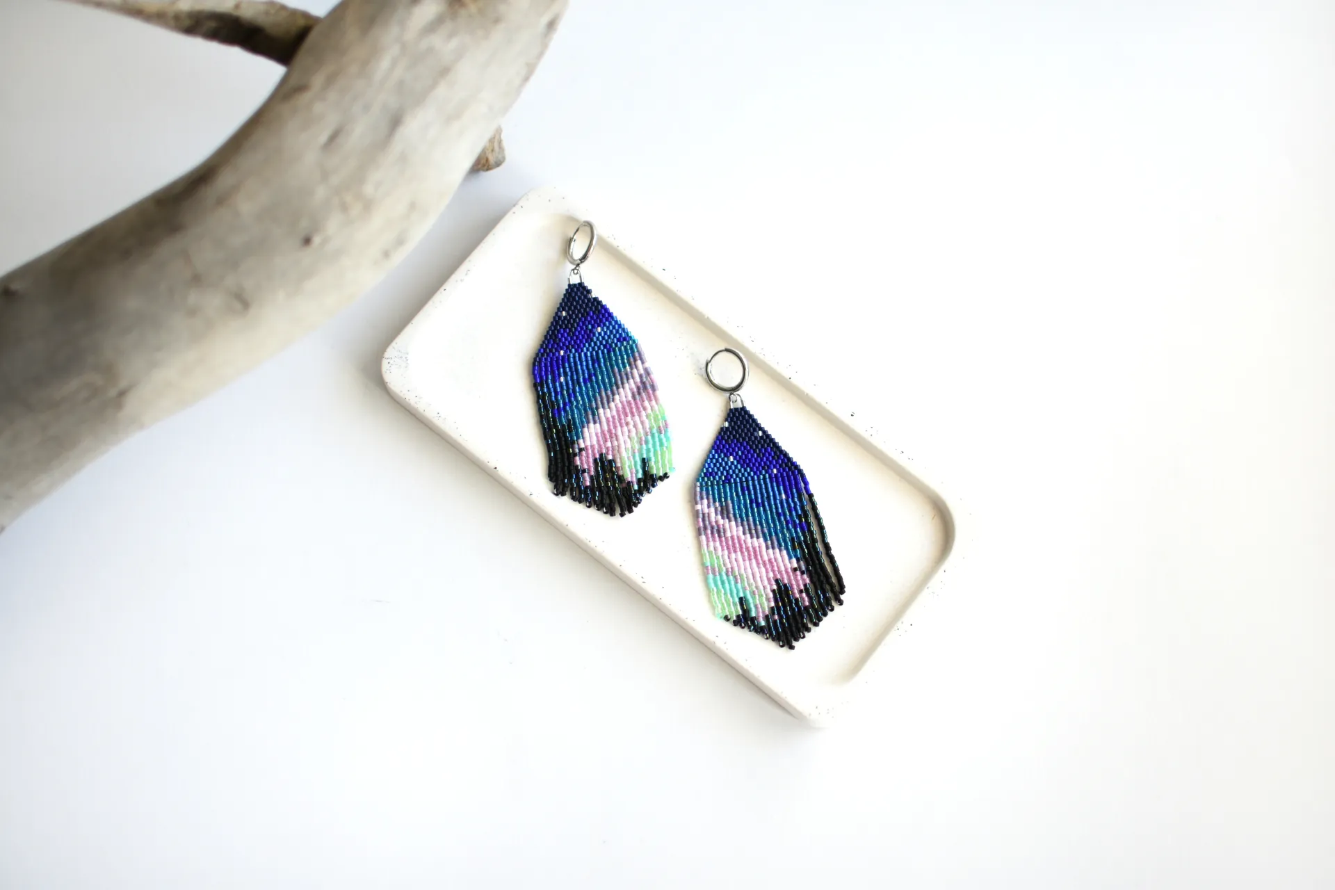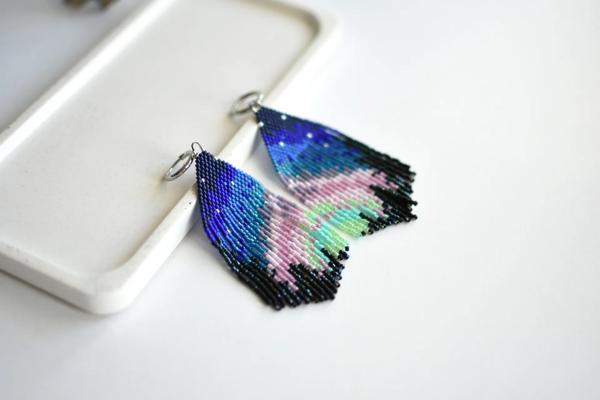Серьги с бахромой по авторской схеме. Полярное сияние на фоне ночного неба и макушек деревьев.