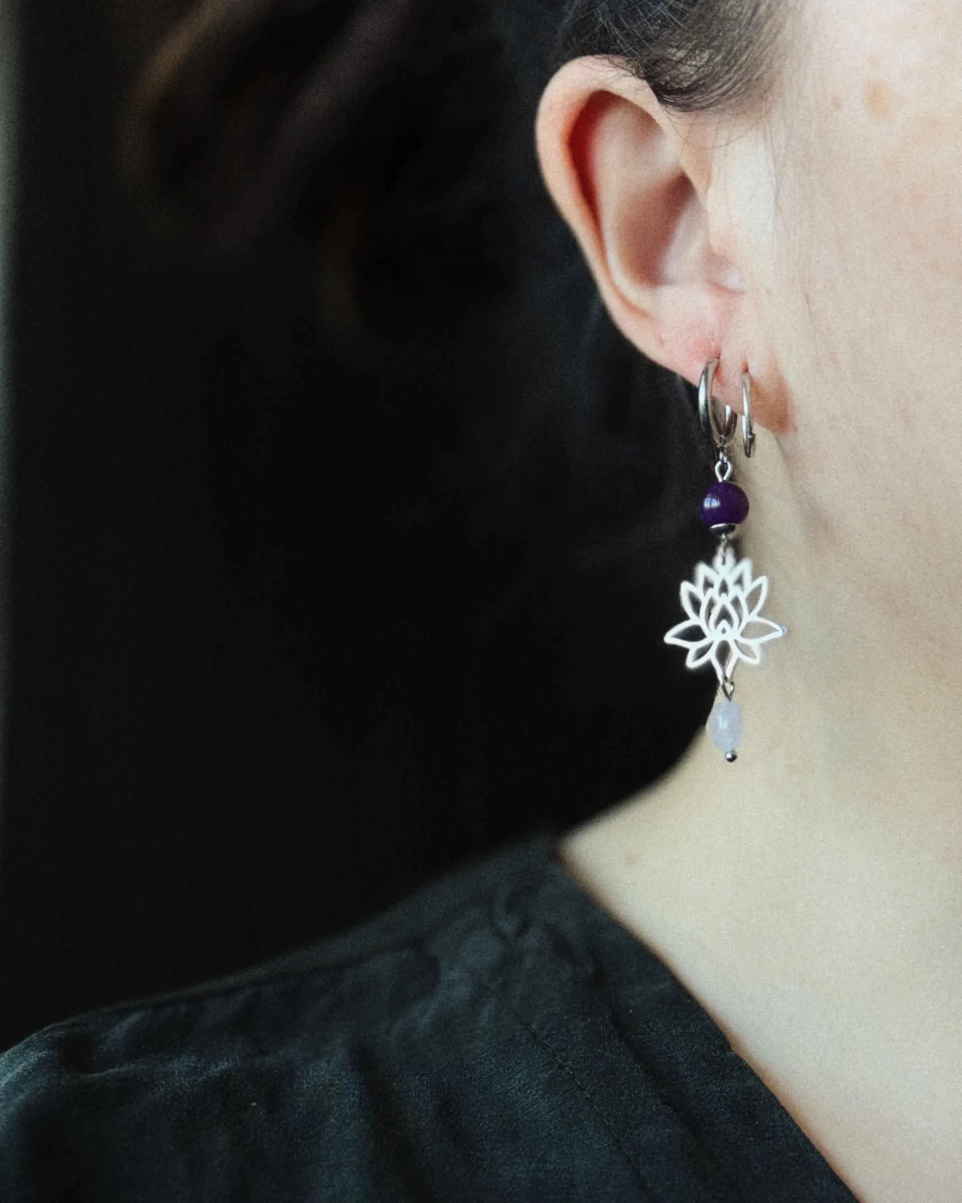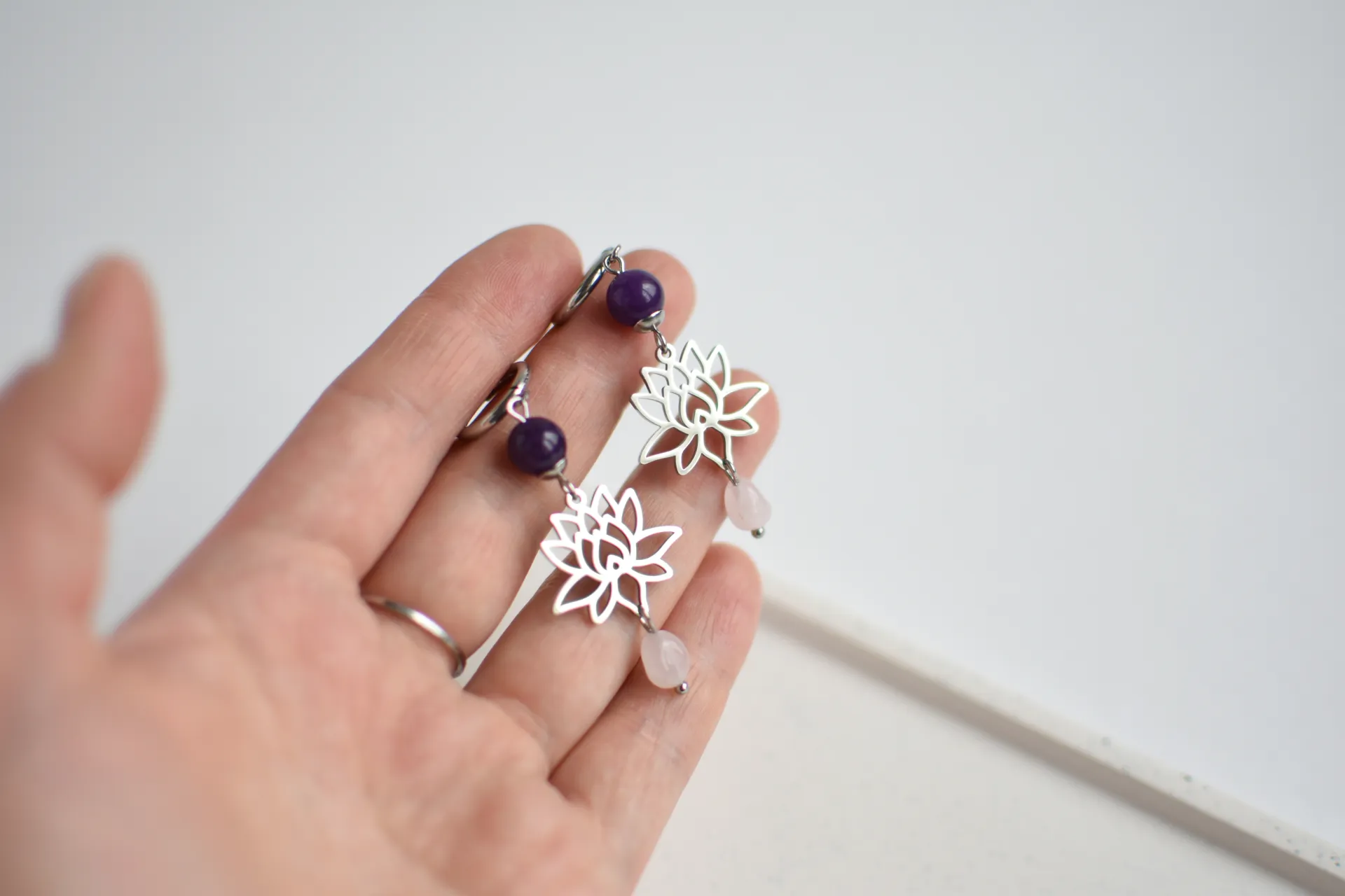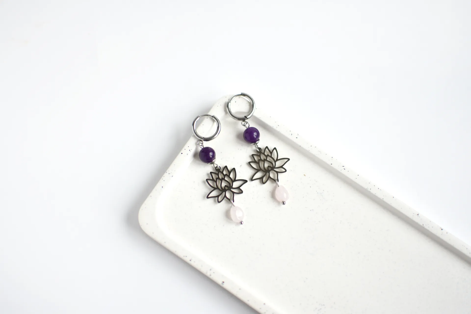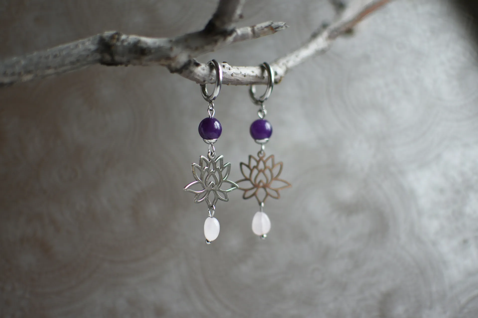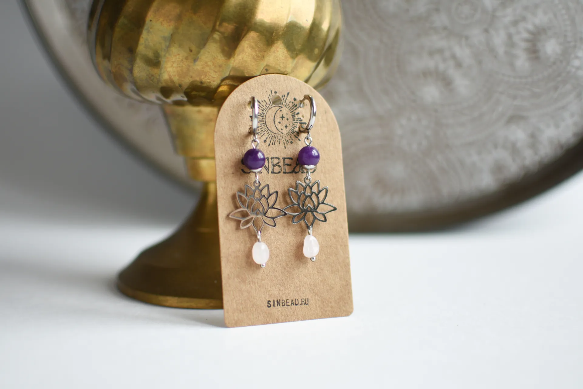 Серьги с подвесками в виде лотосов с натуральными кварцами.
