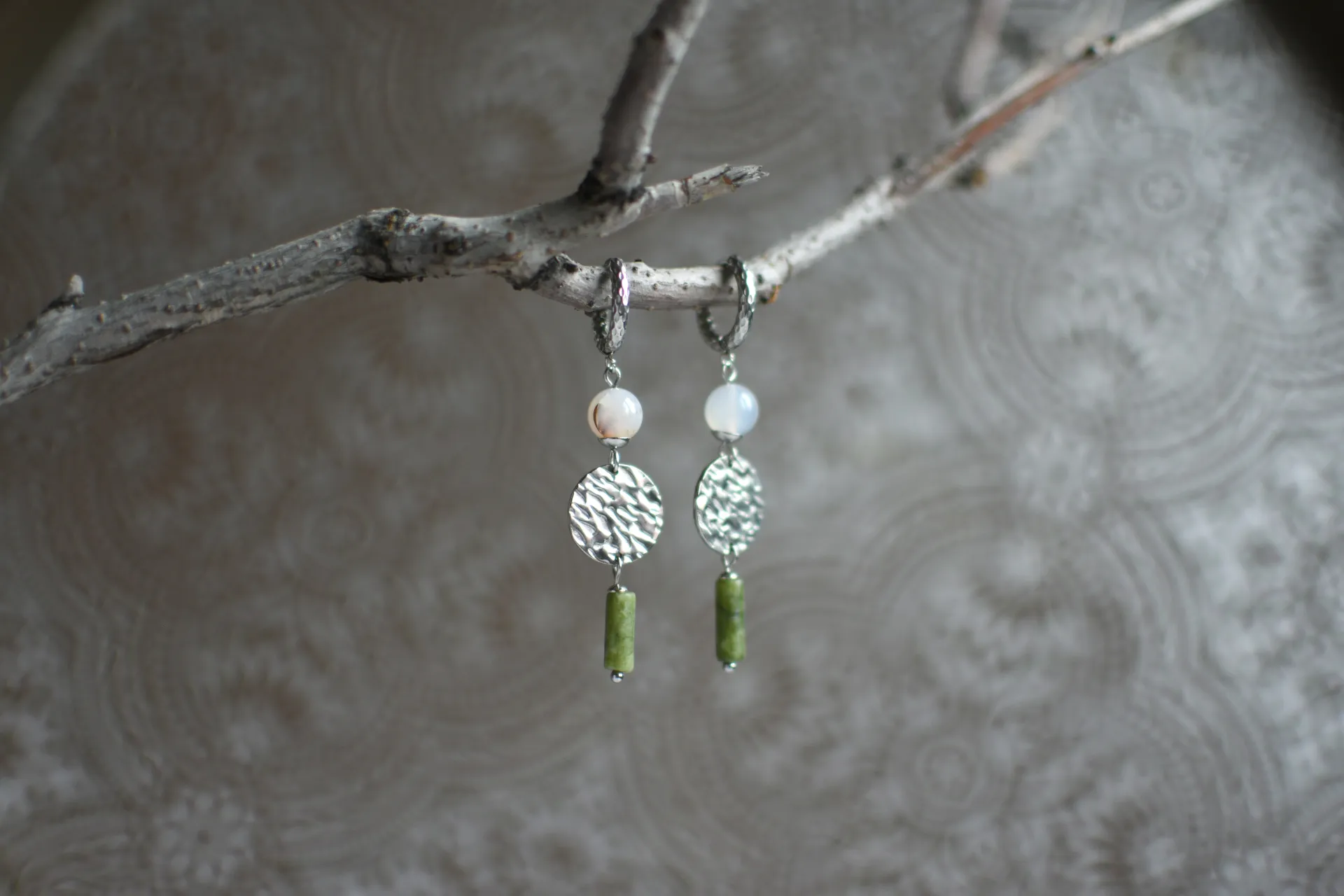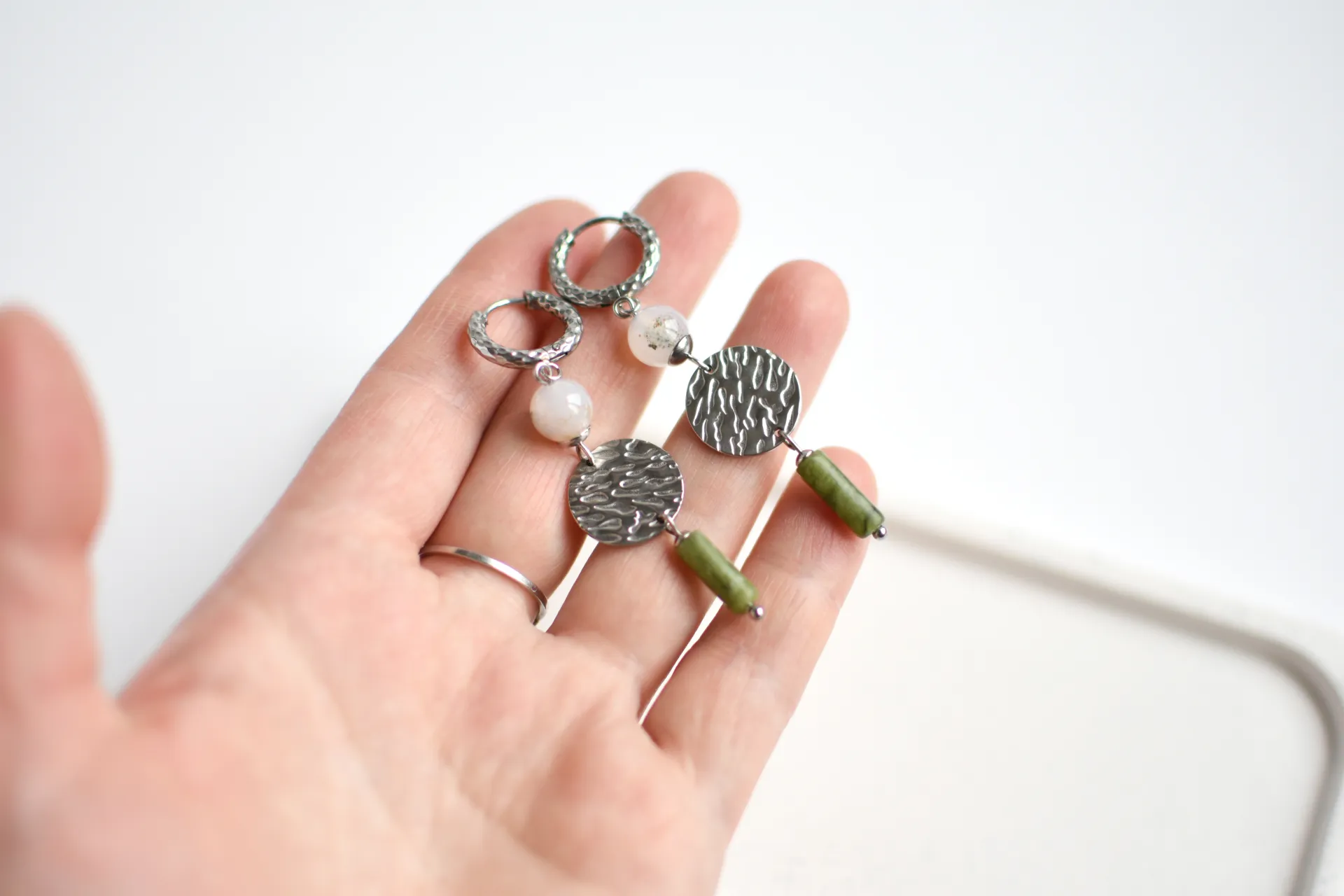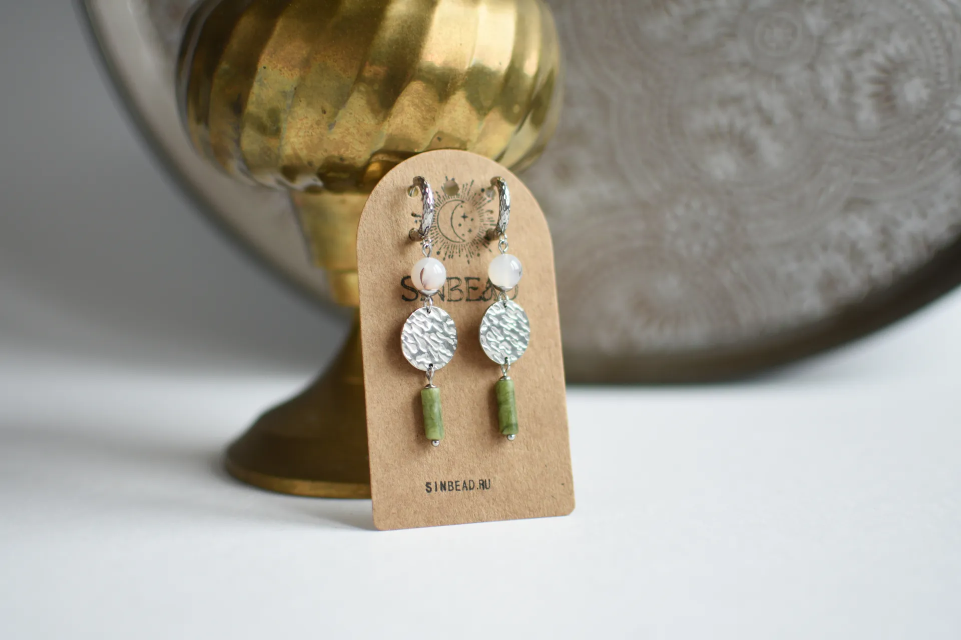 Серьги с натуральными камнями на фактурных швензах-колечках.