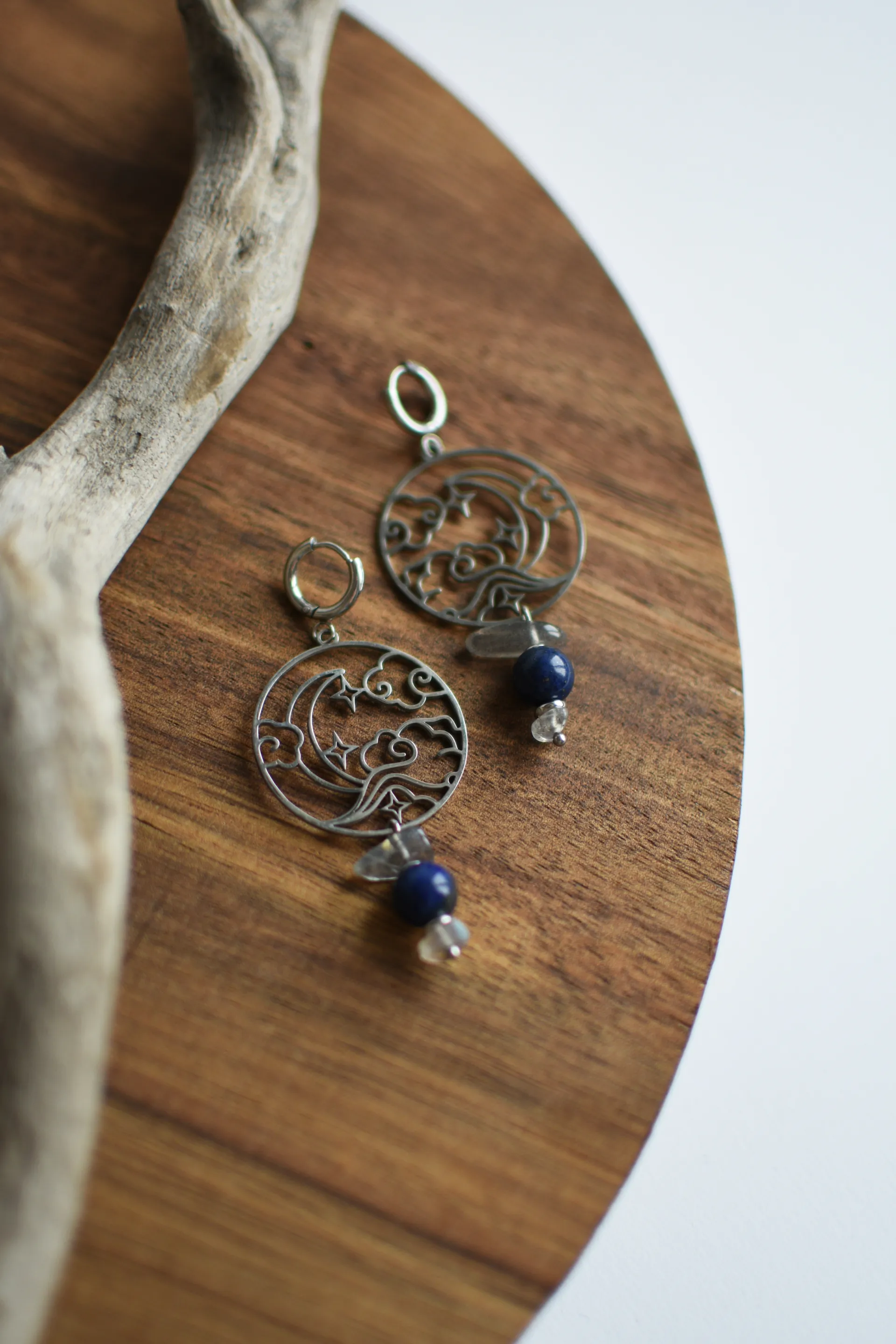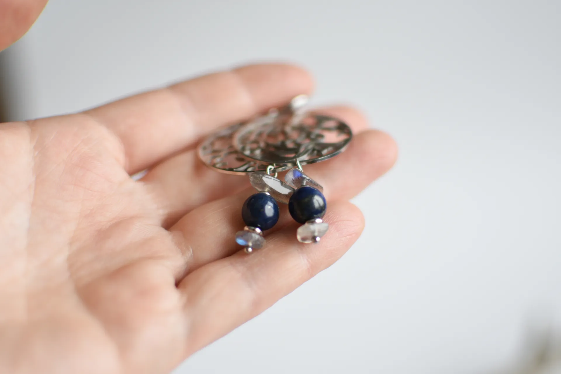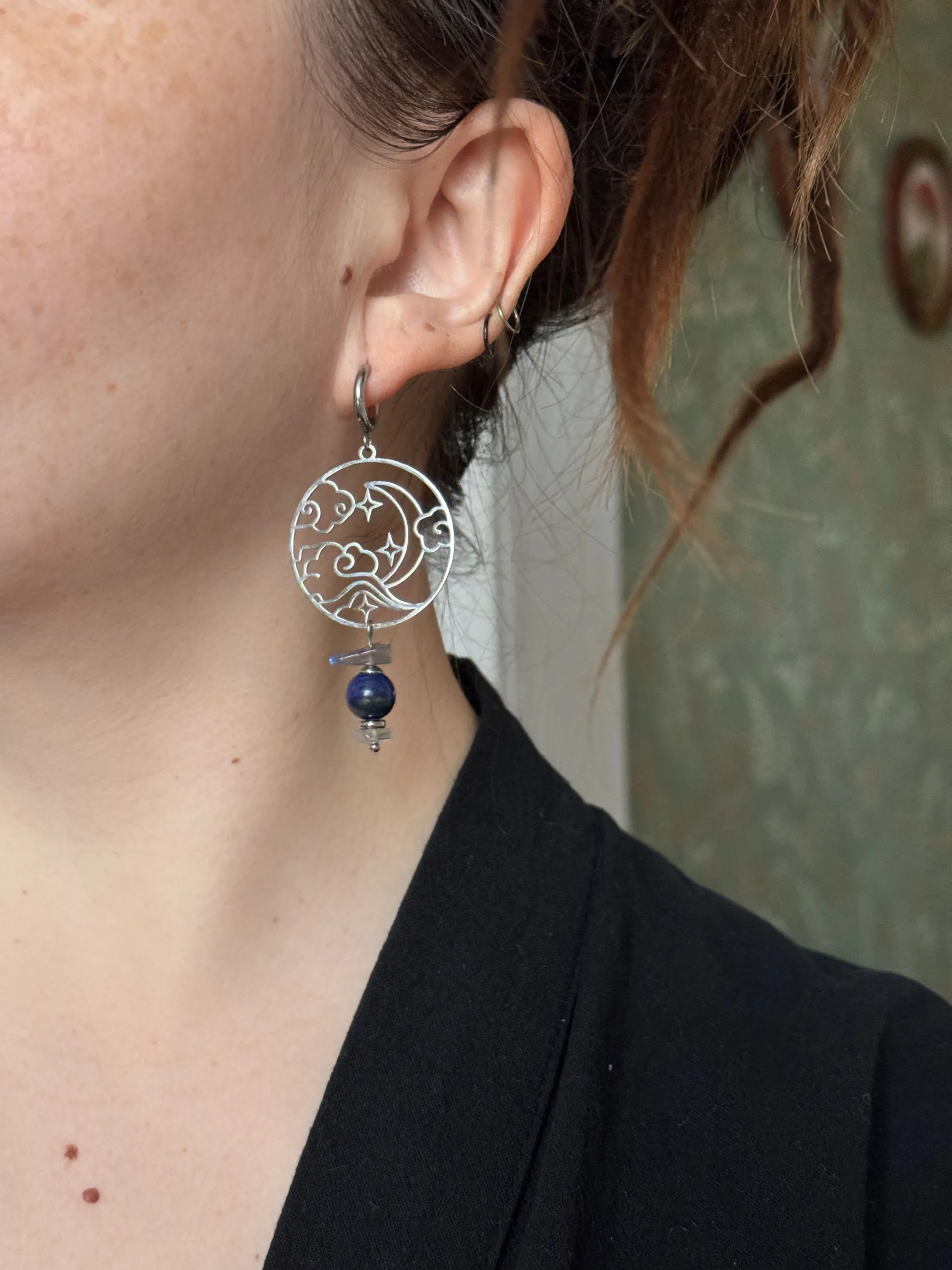 Серьги с крупными стальными подвесками, бусинами лазурита и лабрадора.