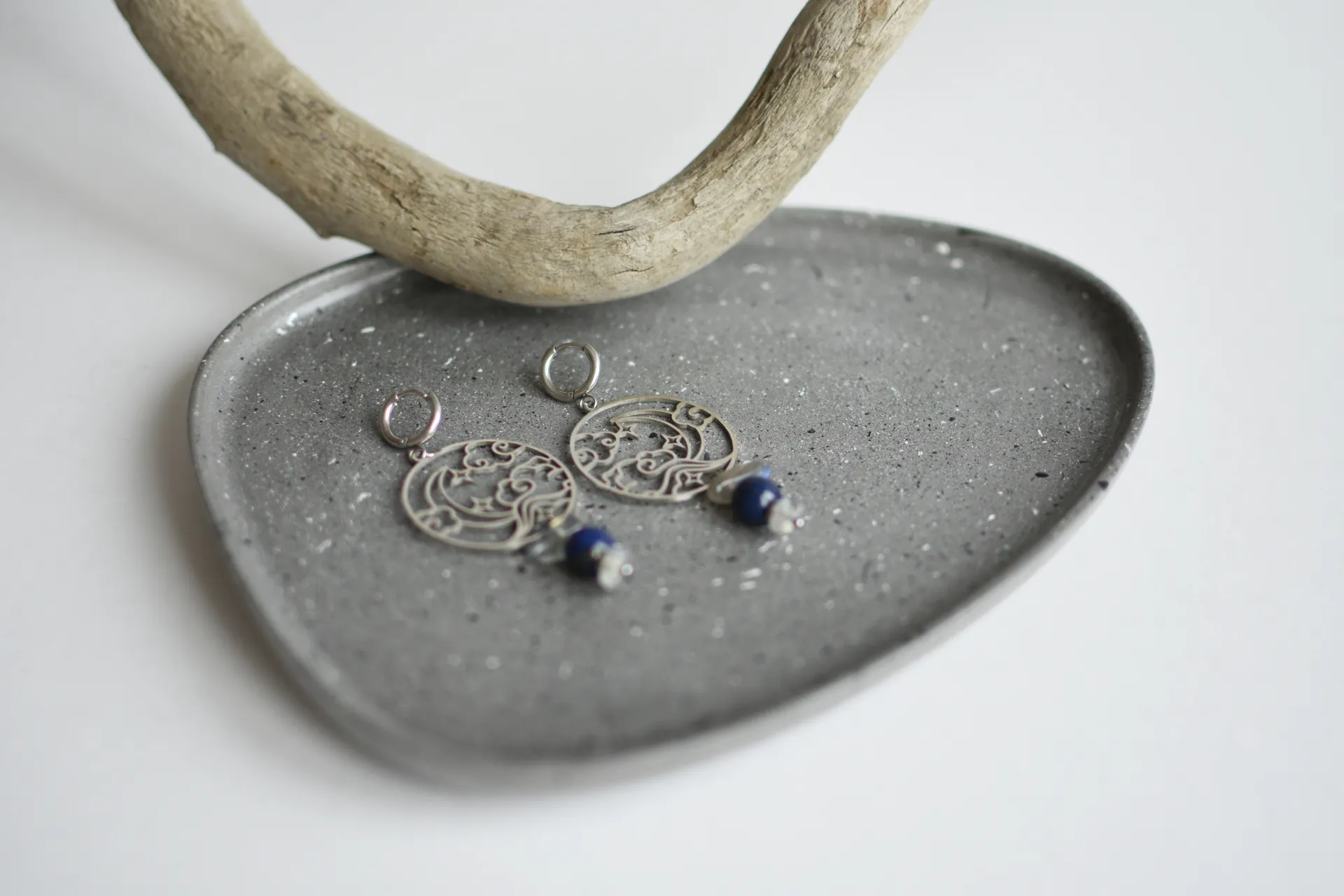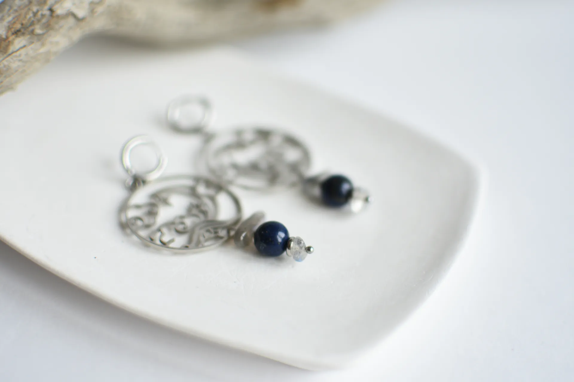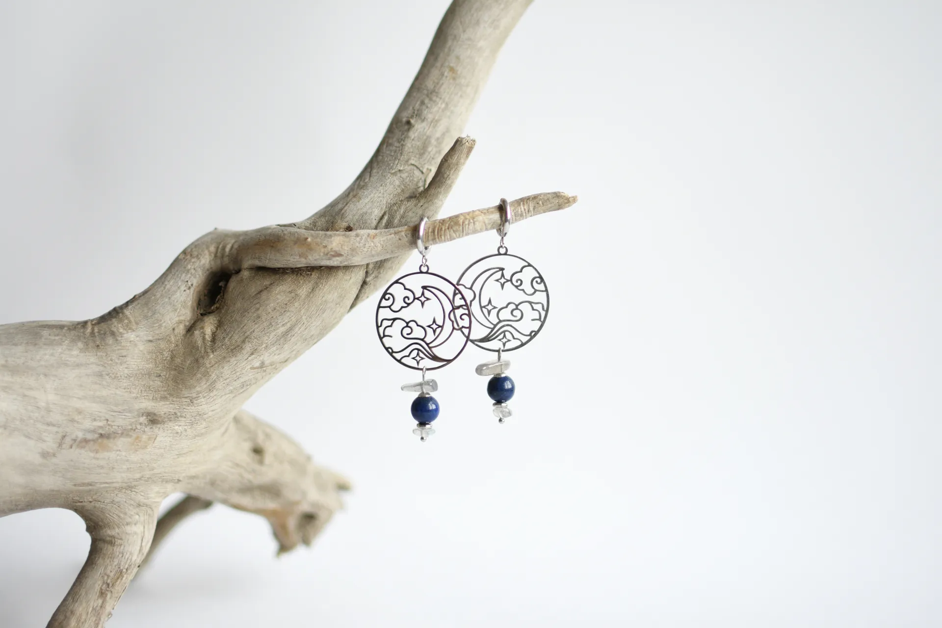Серьги с крупными стальными подвесками, бусинами лазурита и лабрадора.