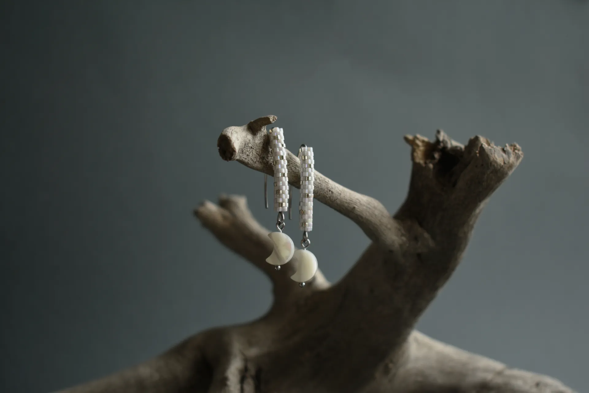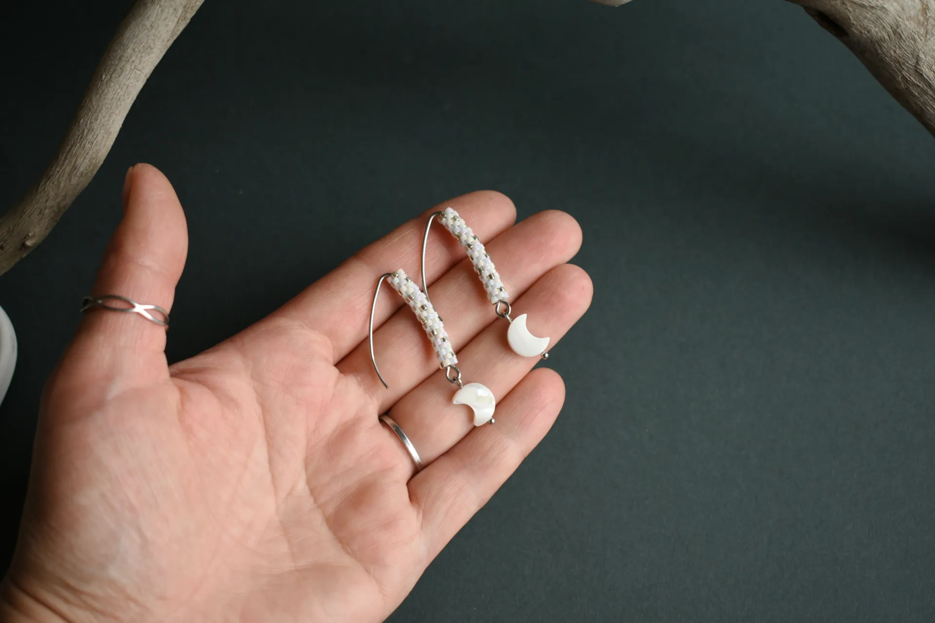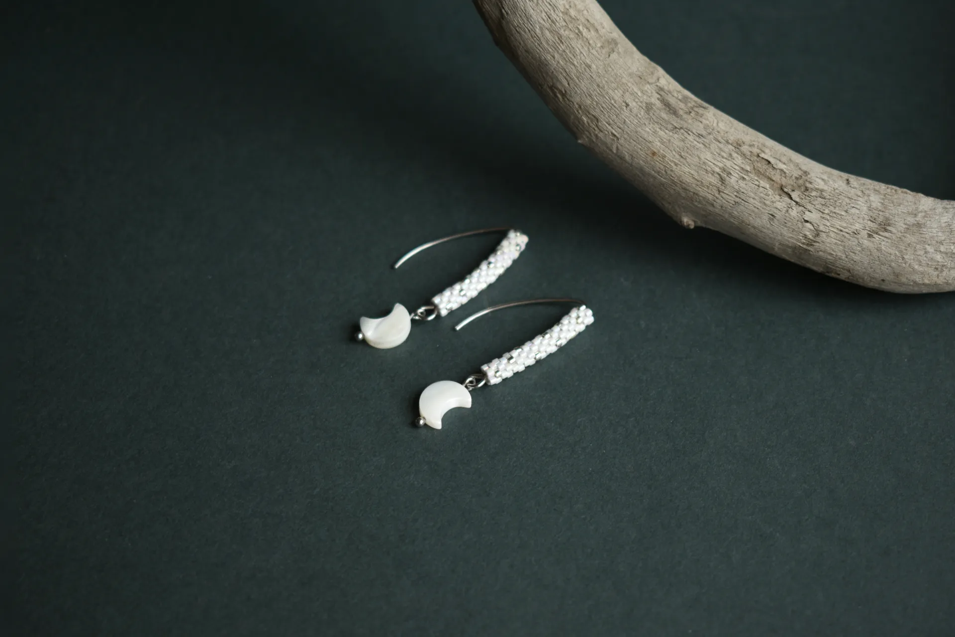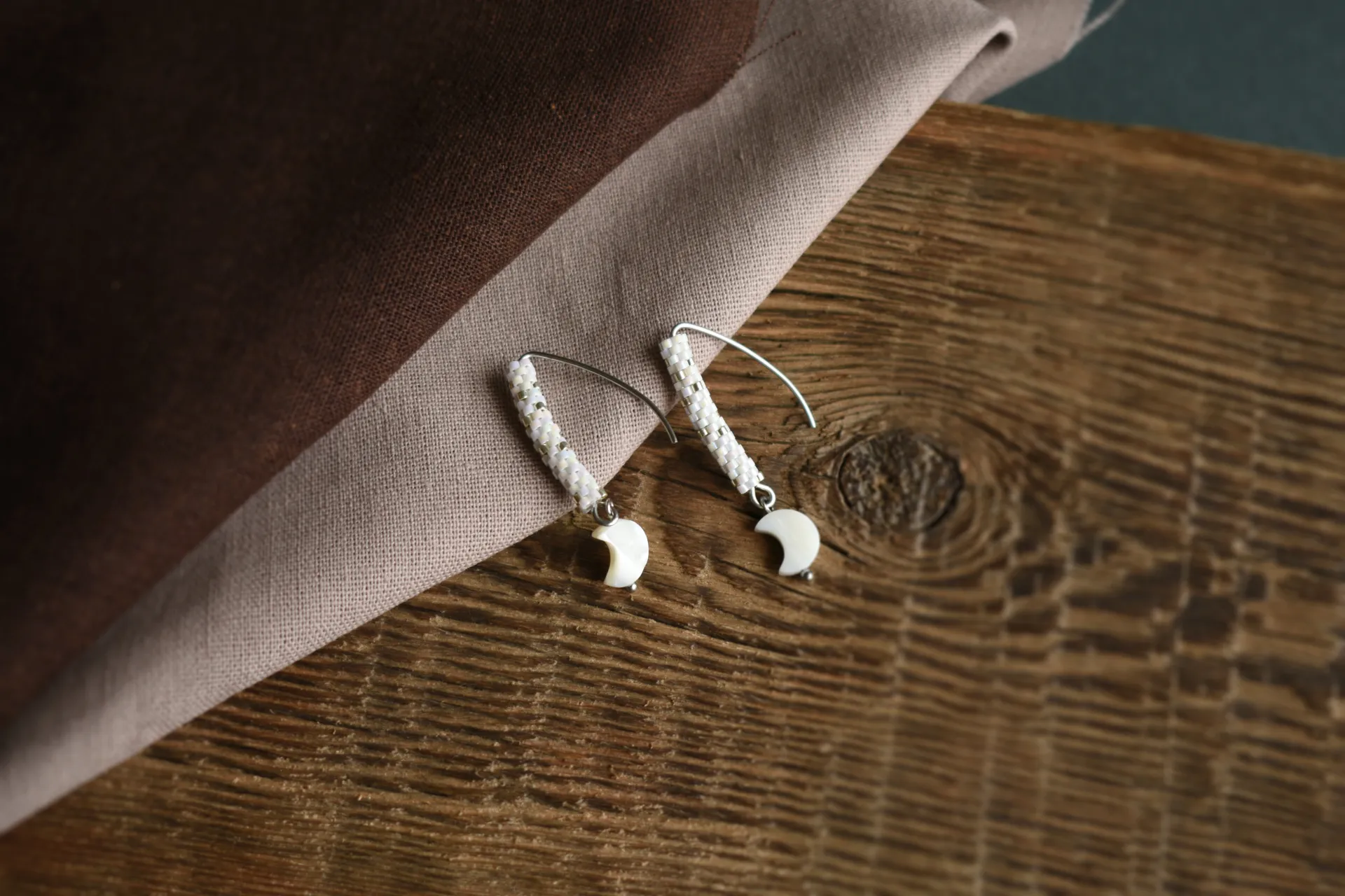 Серьги из белого бисера с перламутровыми переливами и вкраплениями серебристого бисера. Подвески в виде лун из перламутра.