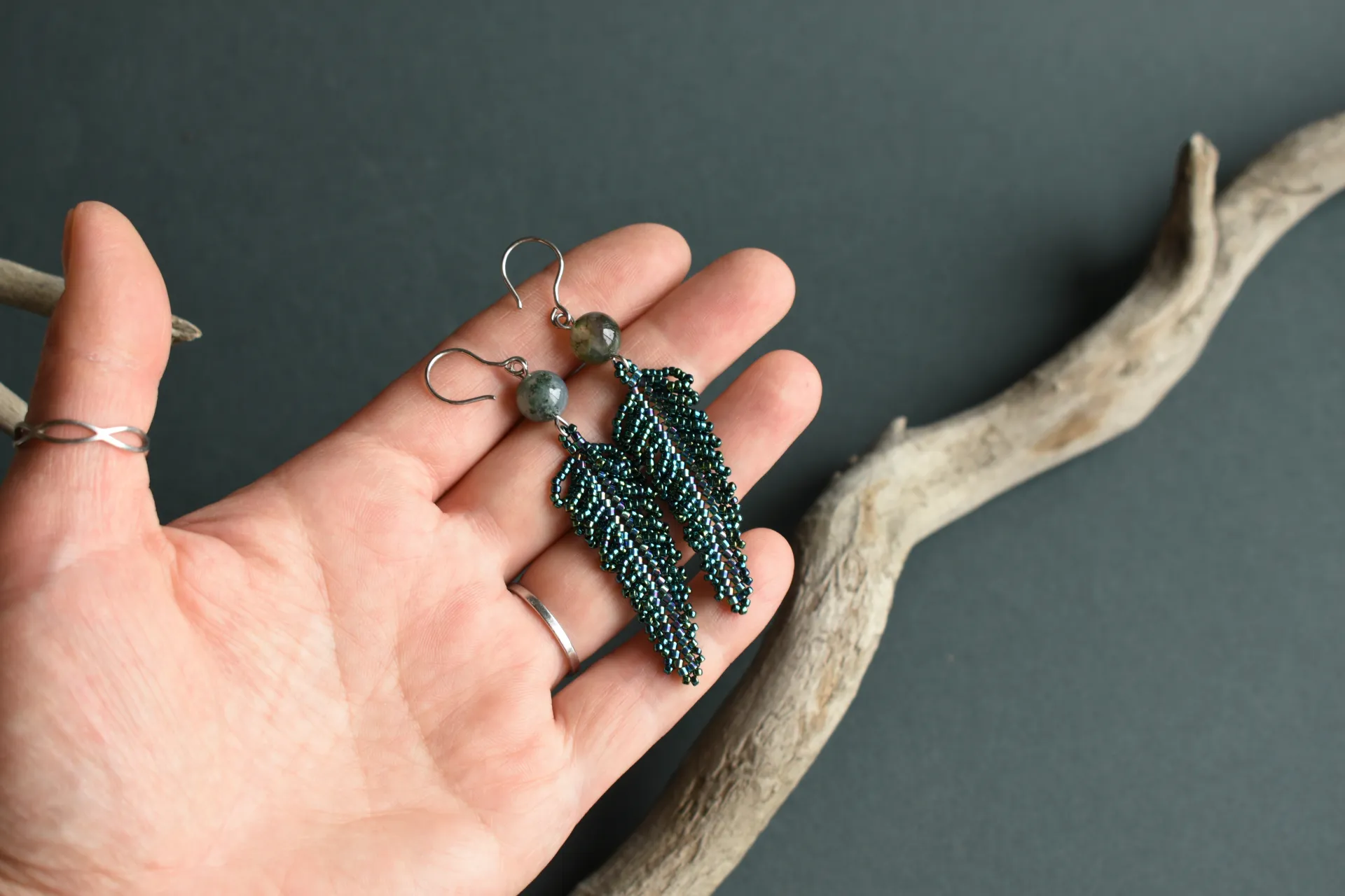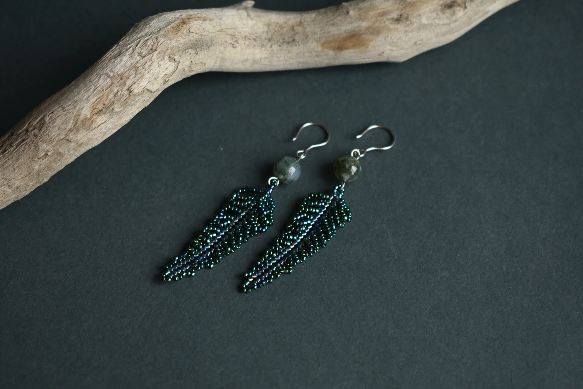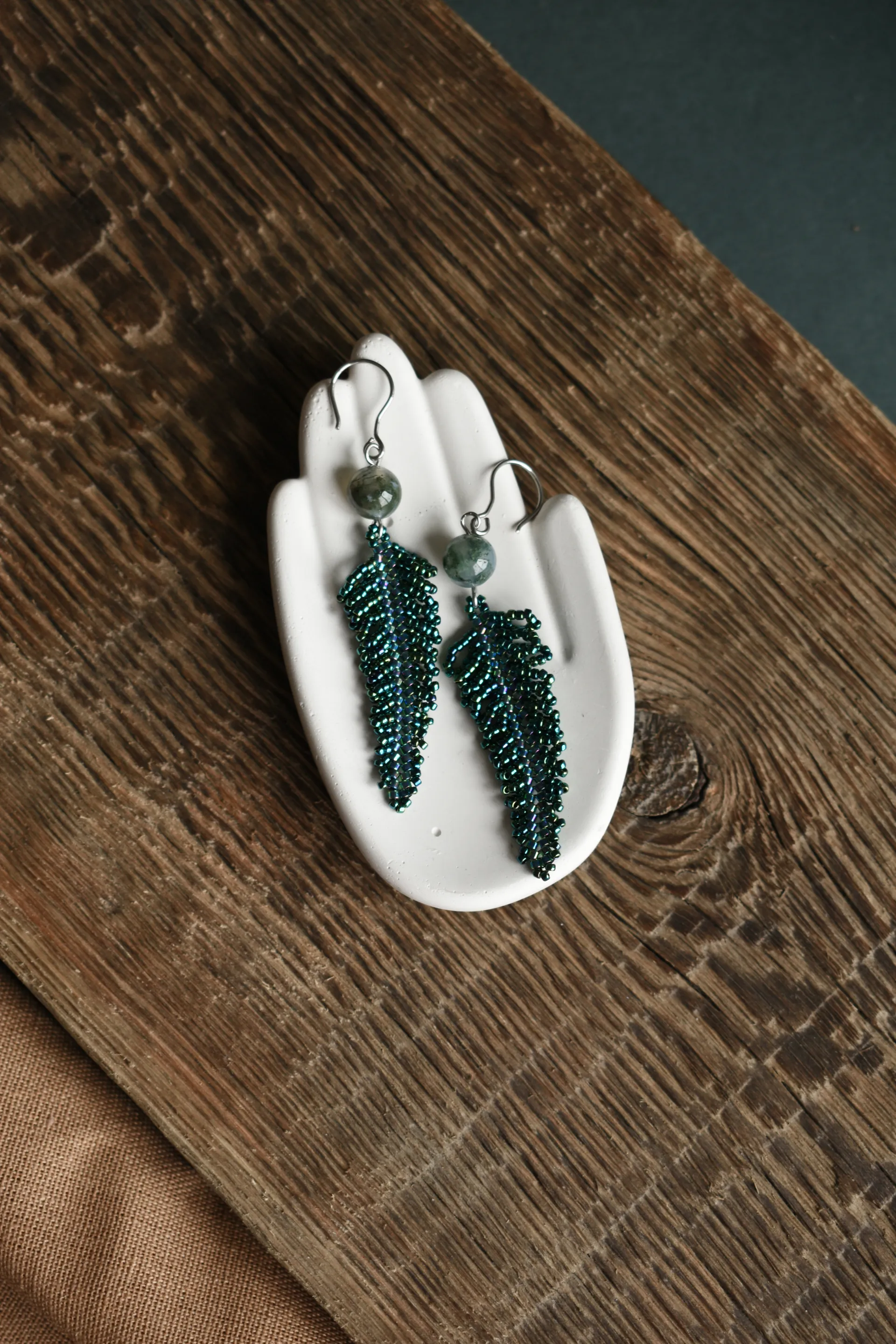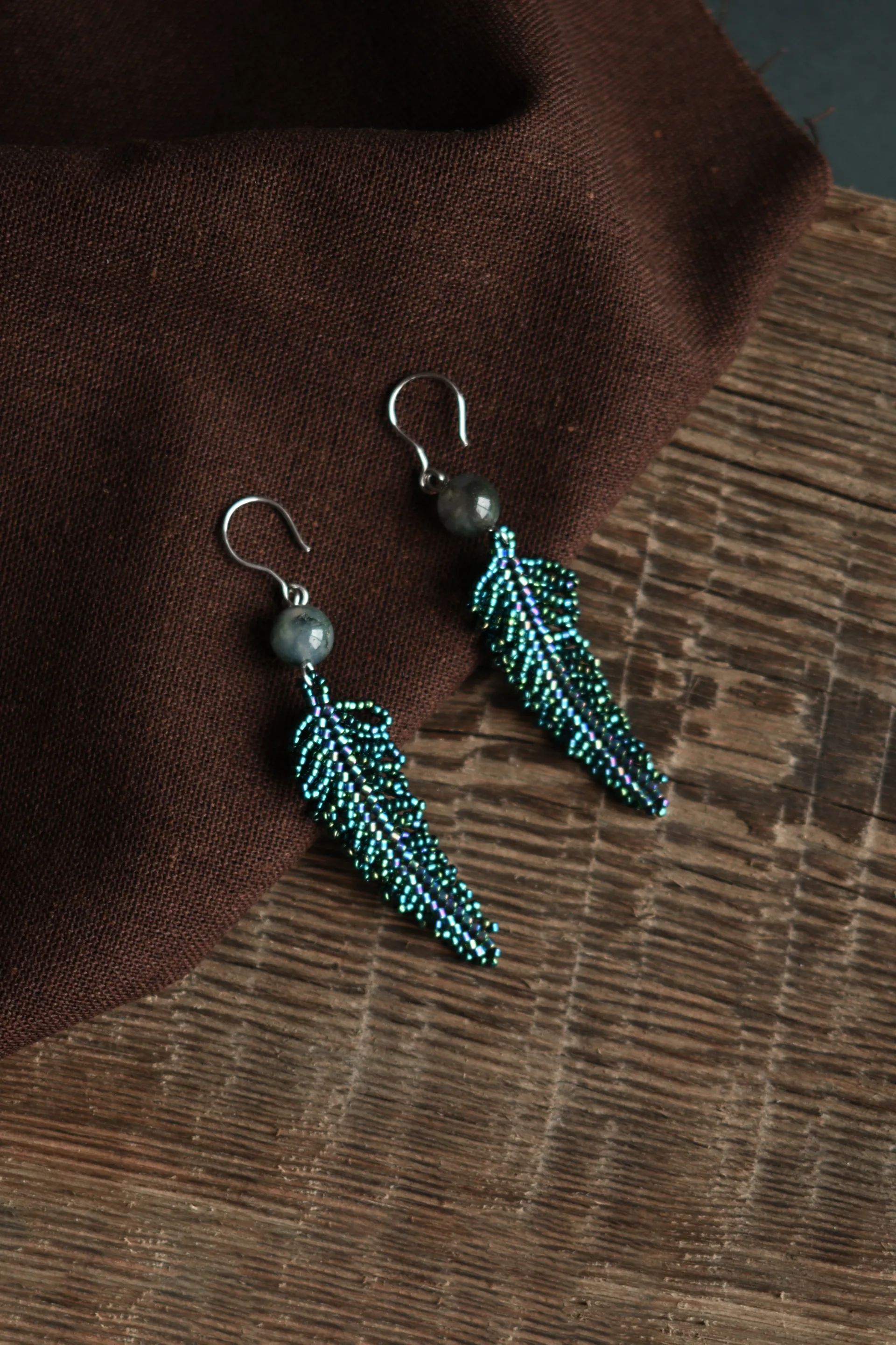 Серьги в виде листьев папоротника с бусинами халцедона.