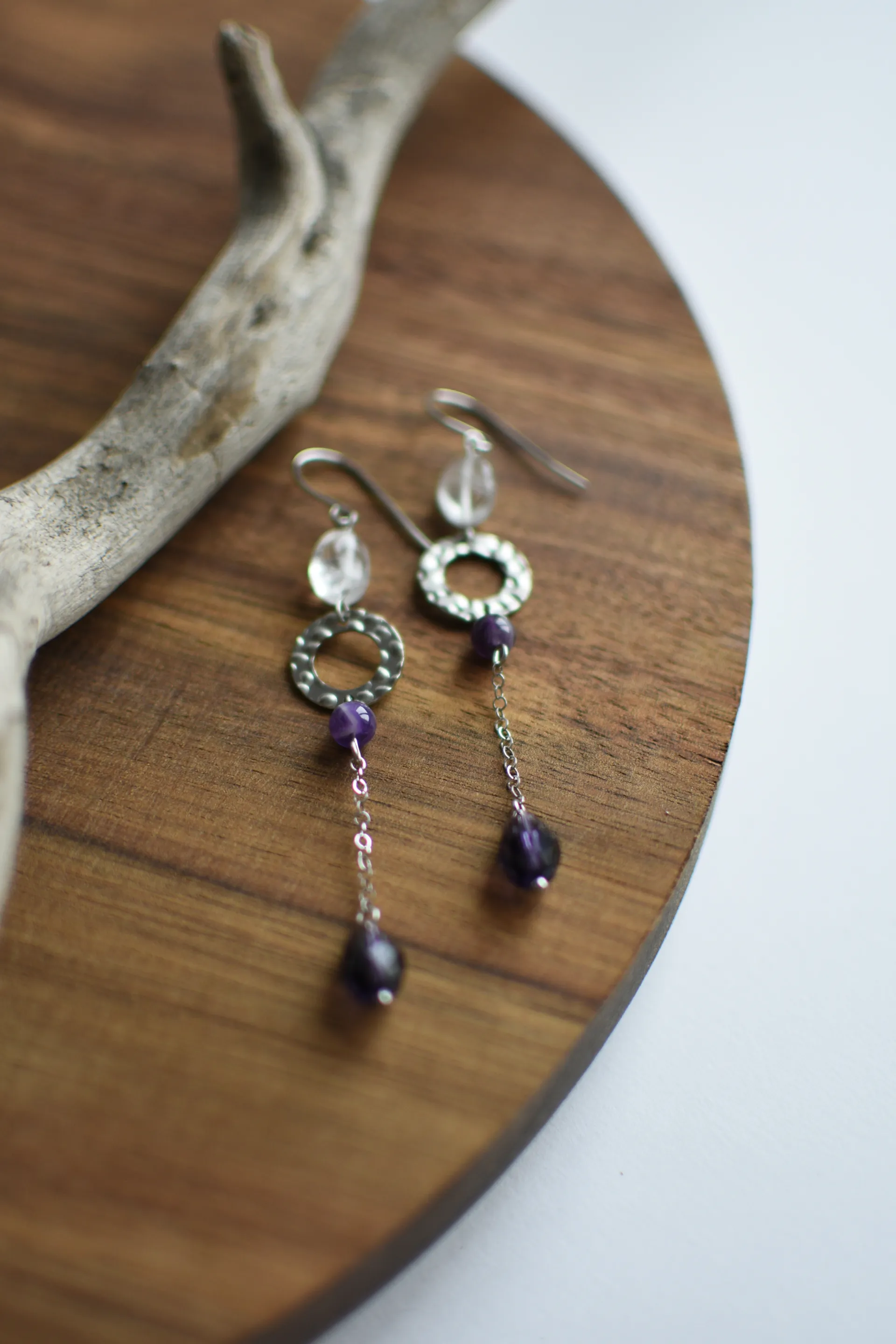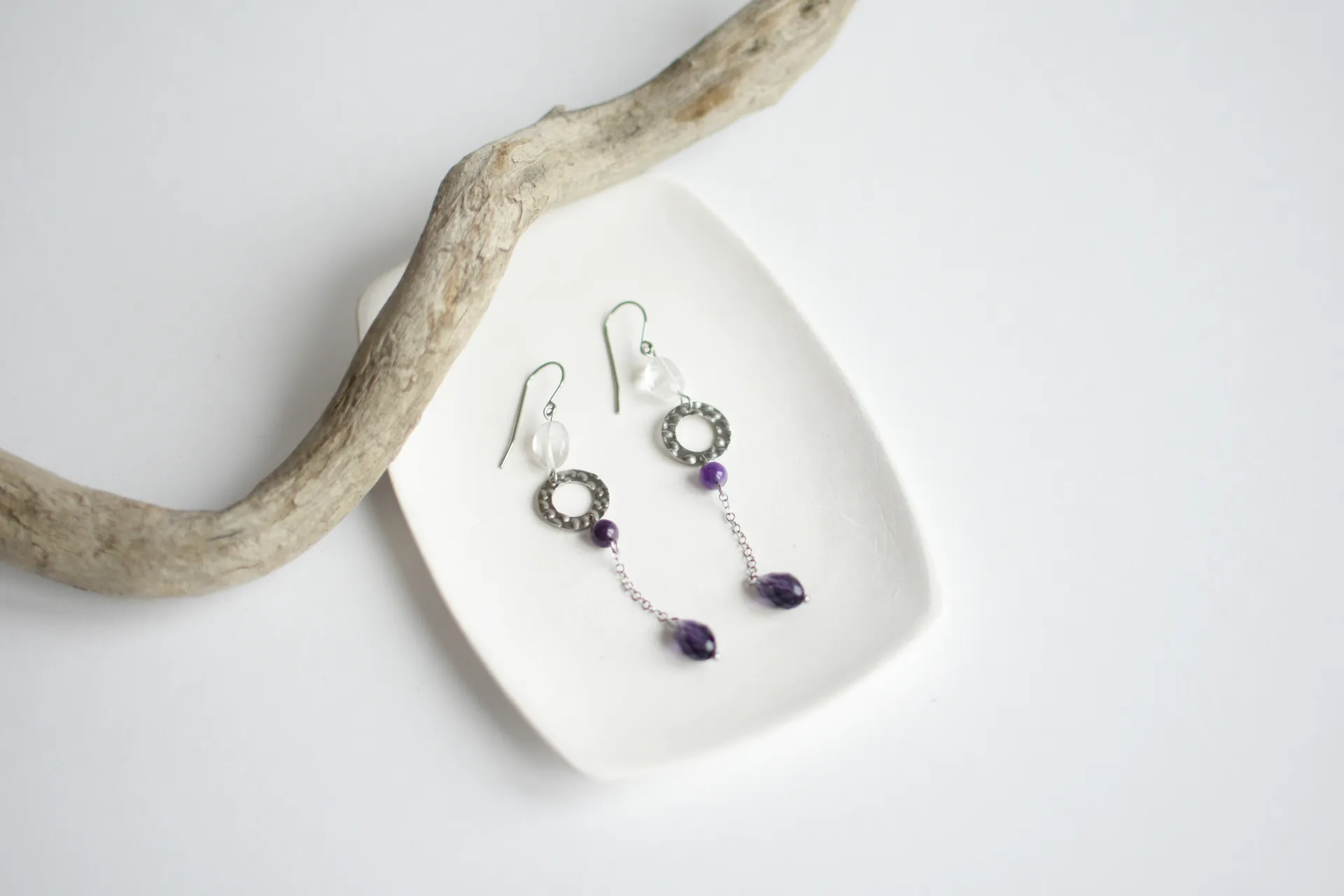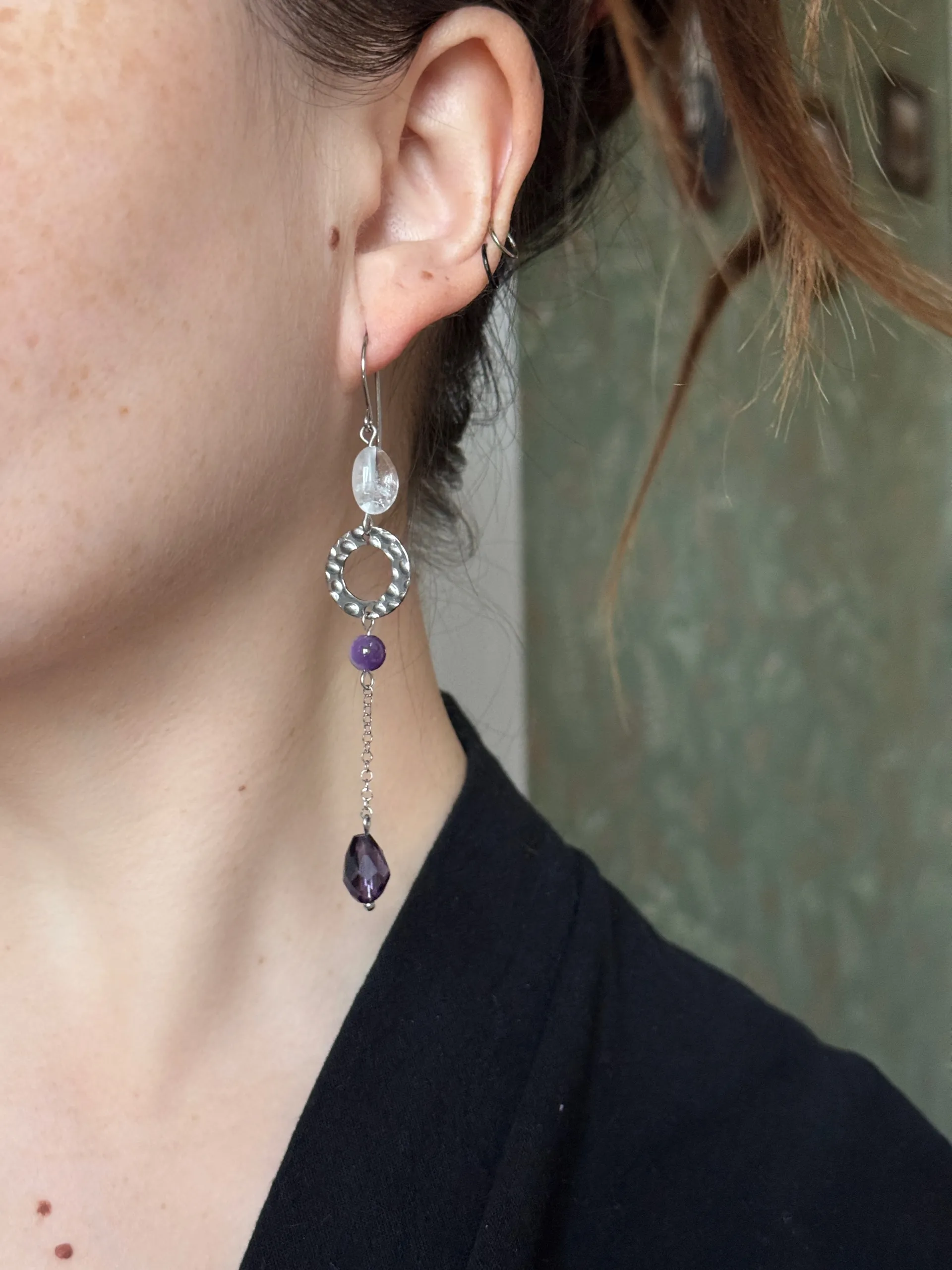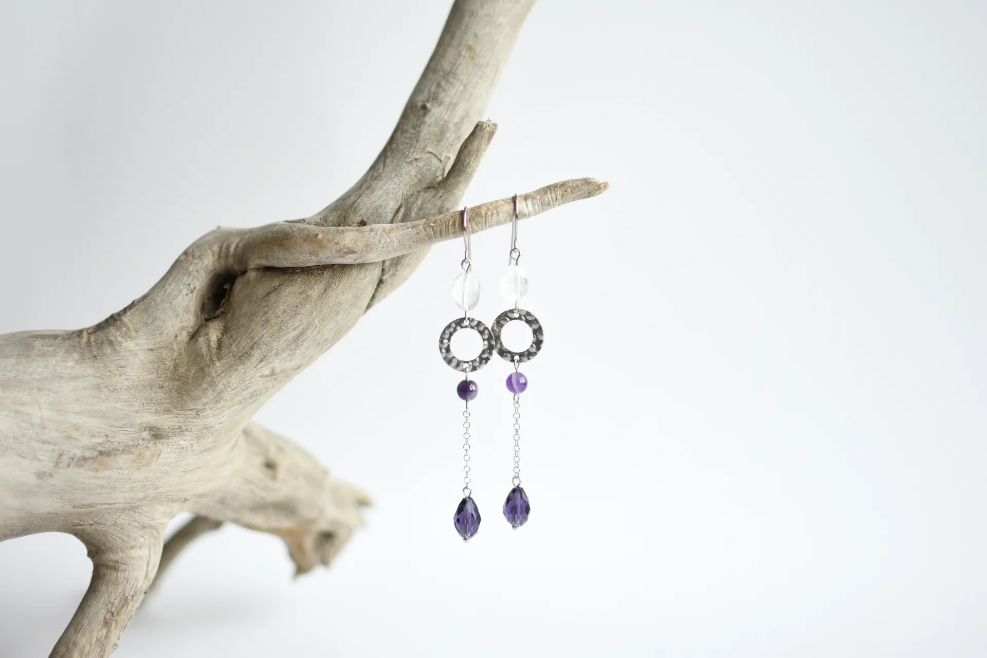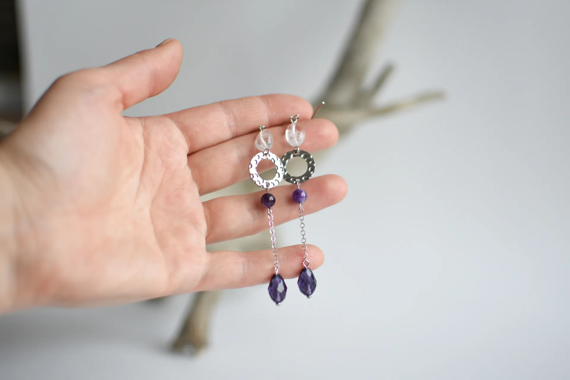 Длинные серьги с цепочками, аметистами и горным хрусталём.