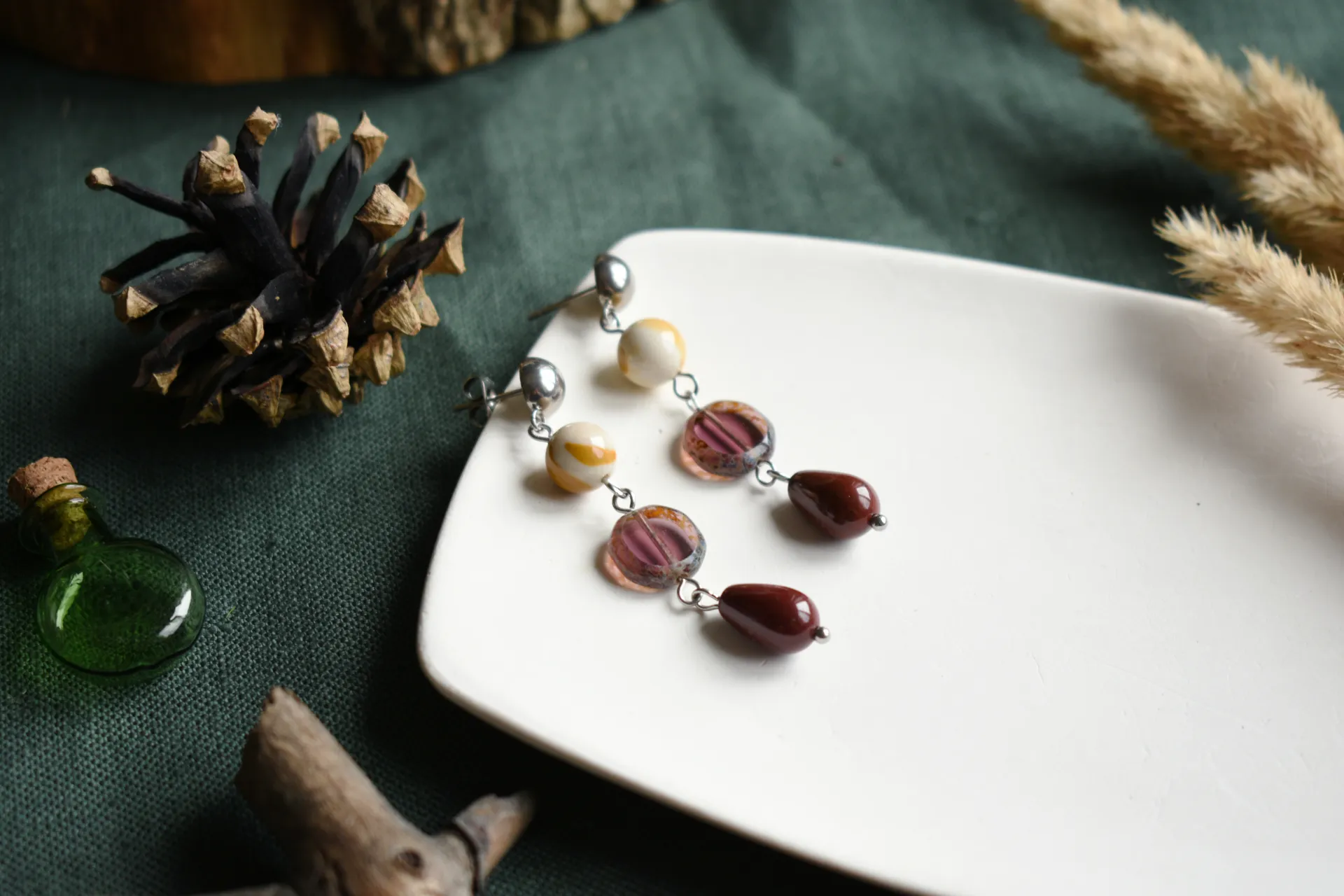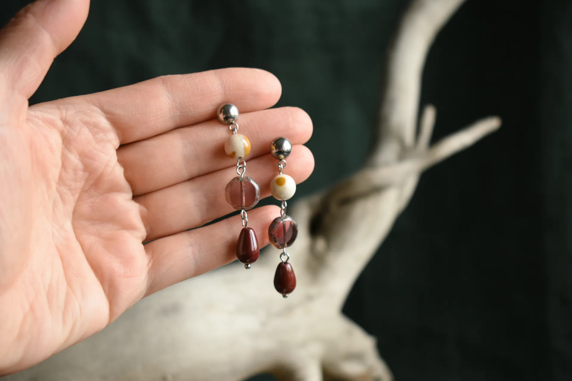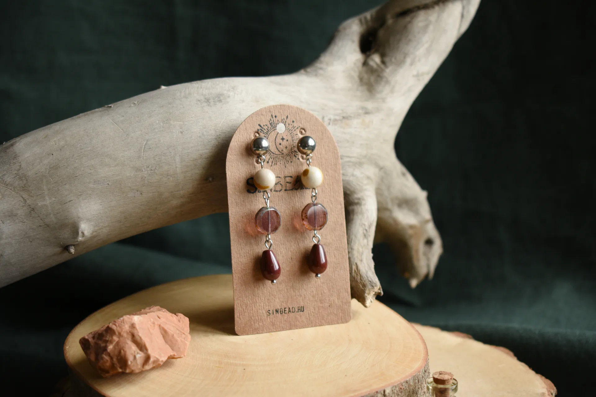 Длинные серьги-гвоздики с мукаитом, красной яшмой и чешским стеклом.
