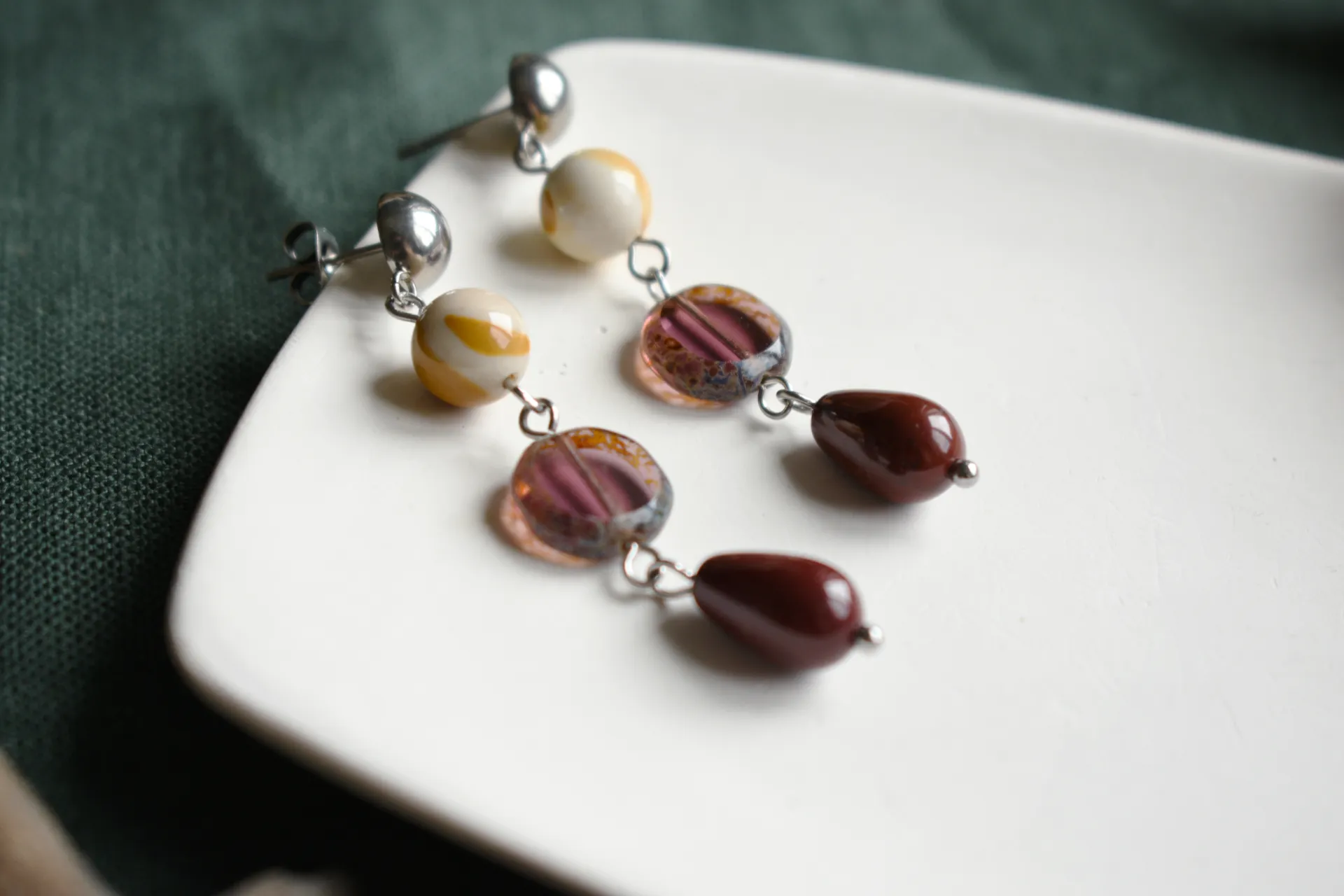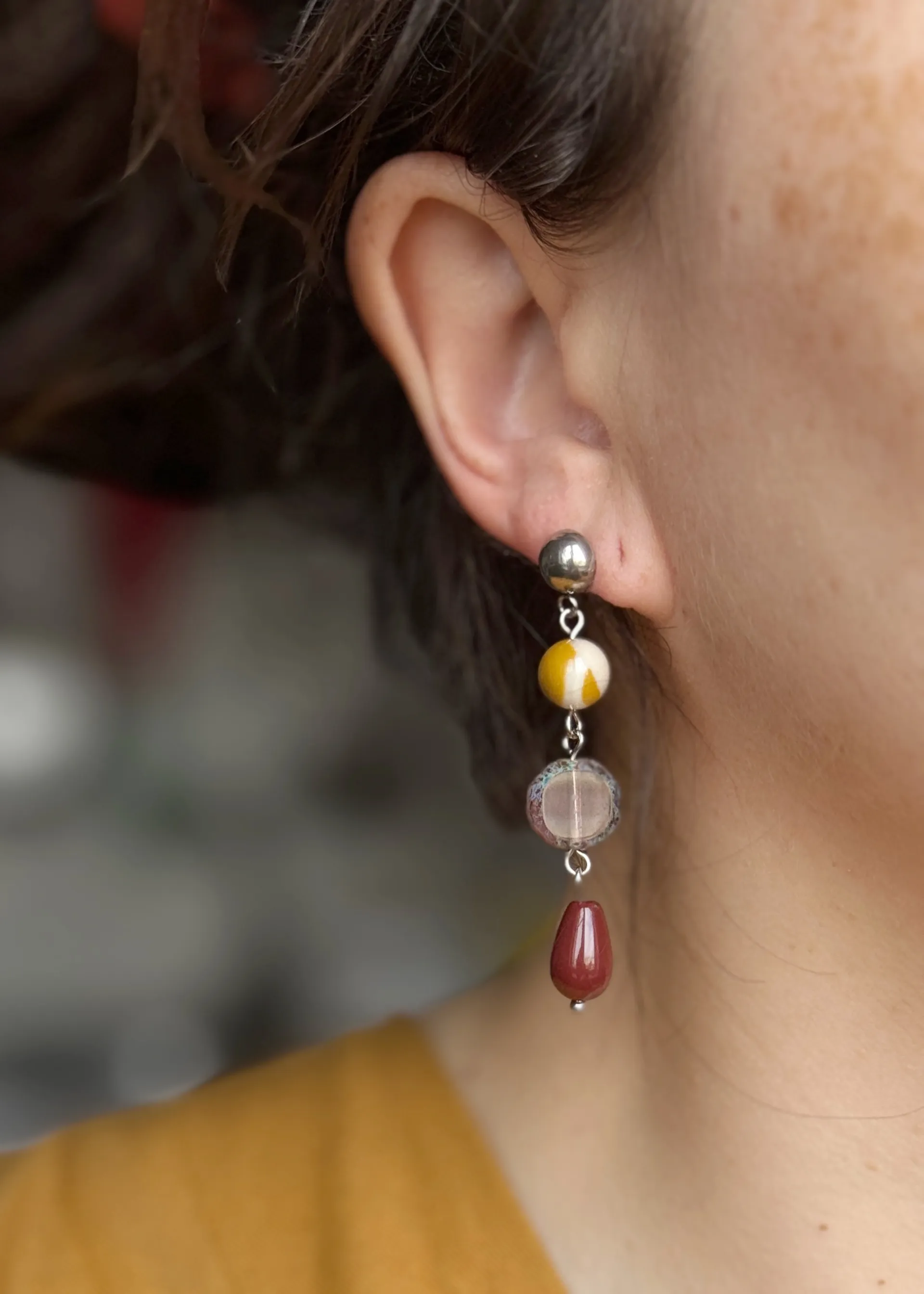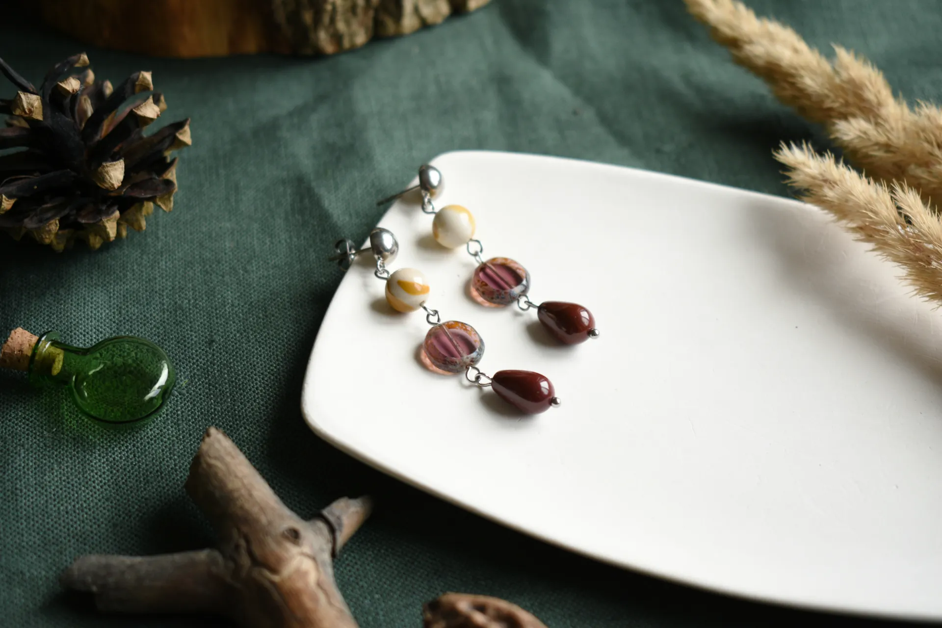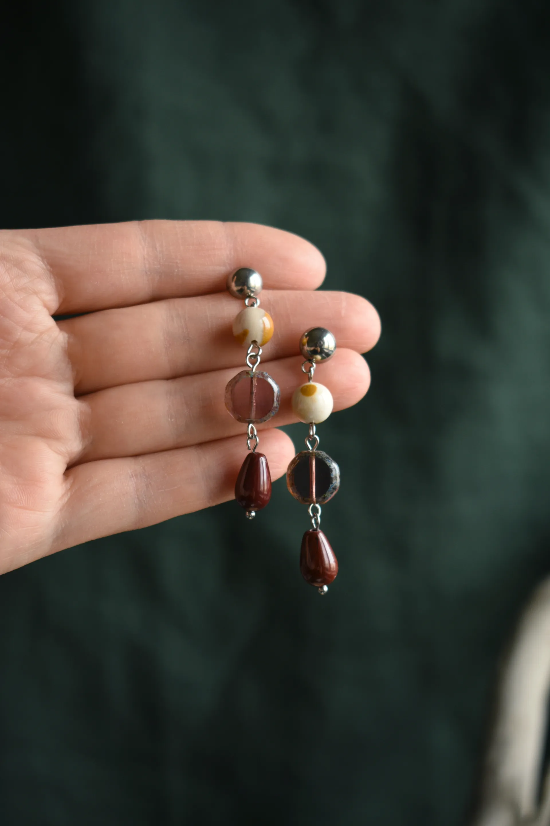 Длинные серьги-гвоздики с мукаитом, красной яшмой и чешским стеклом.