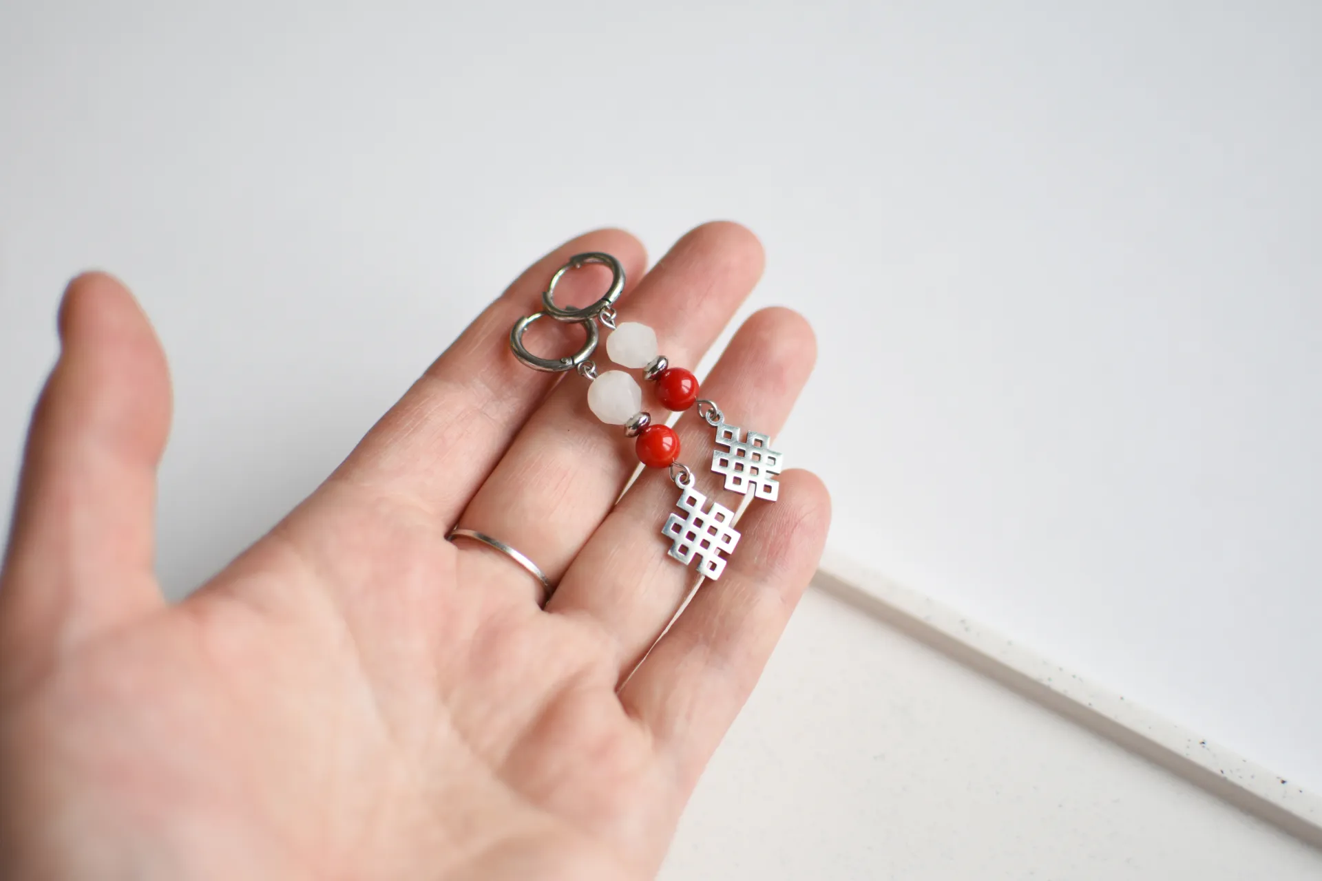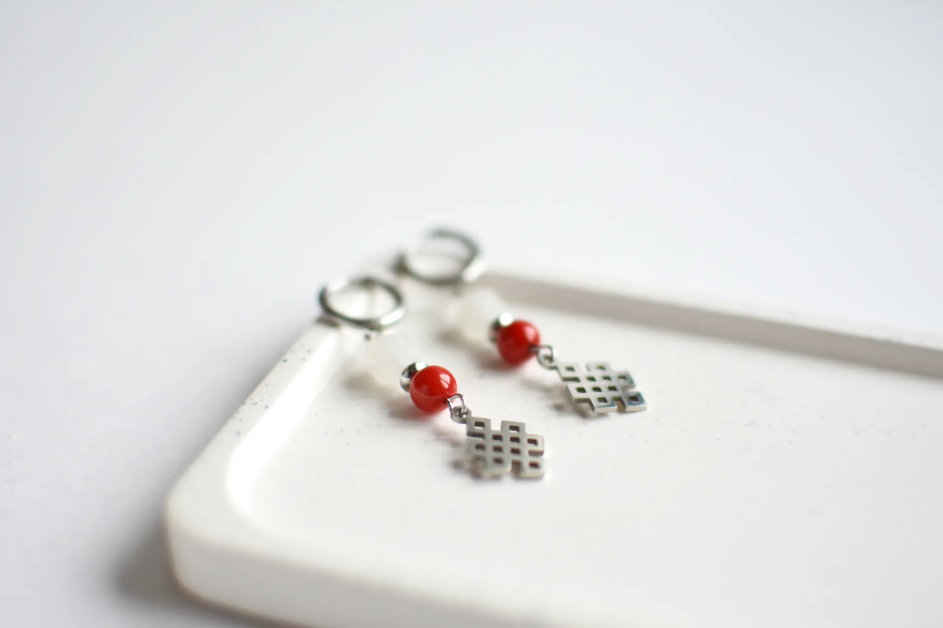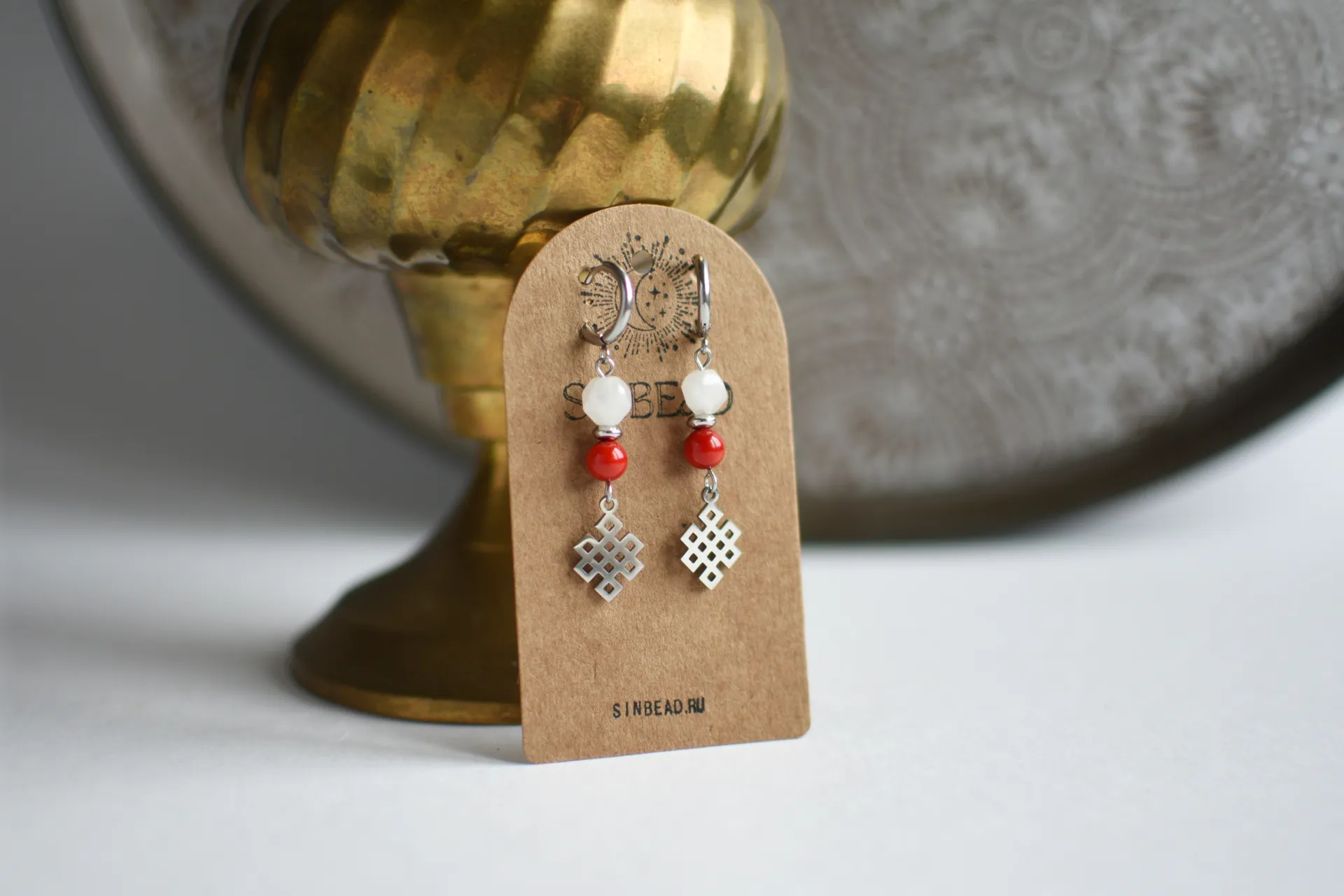 Небольшие серьги с натуральными камнями и символом "улзы", означающим благополучие и долголетие.