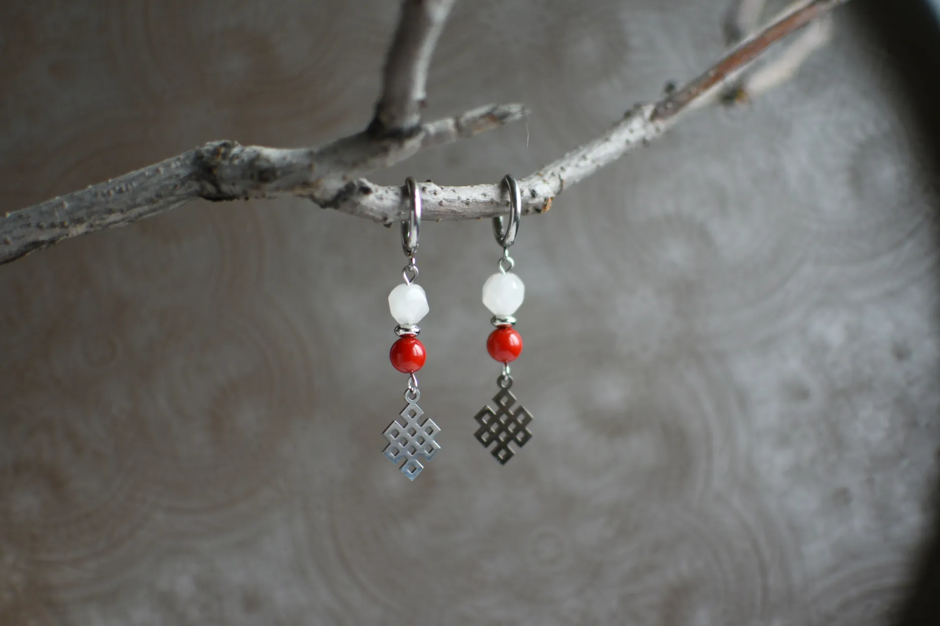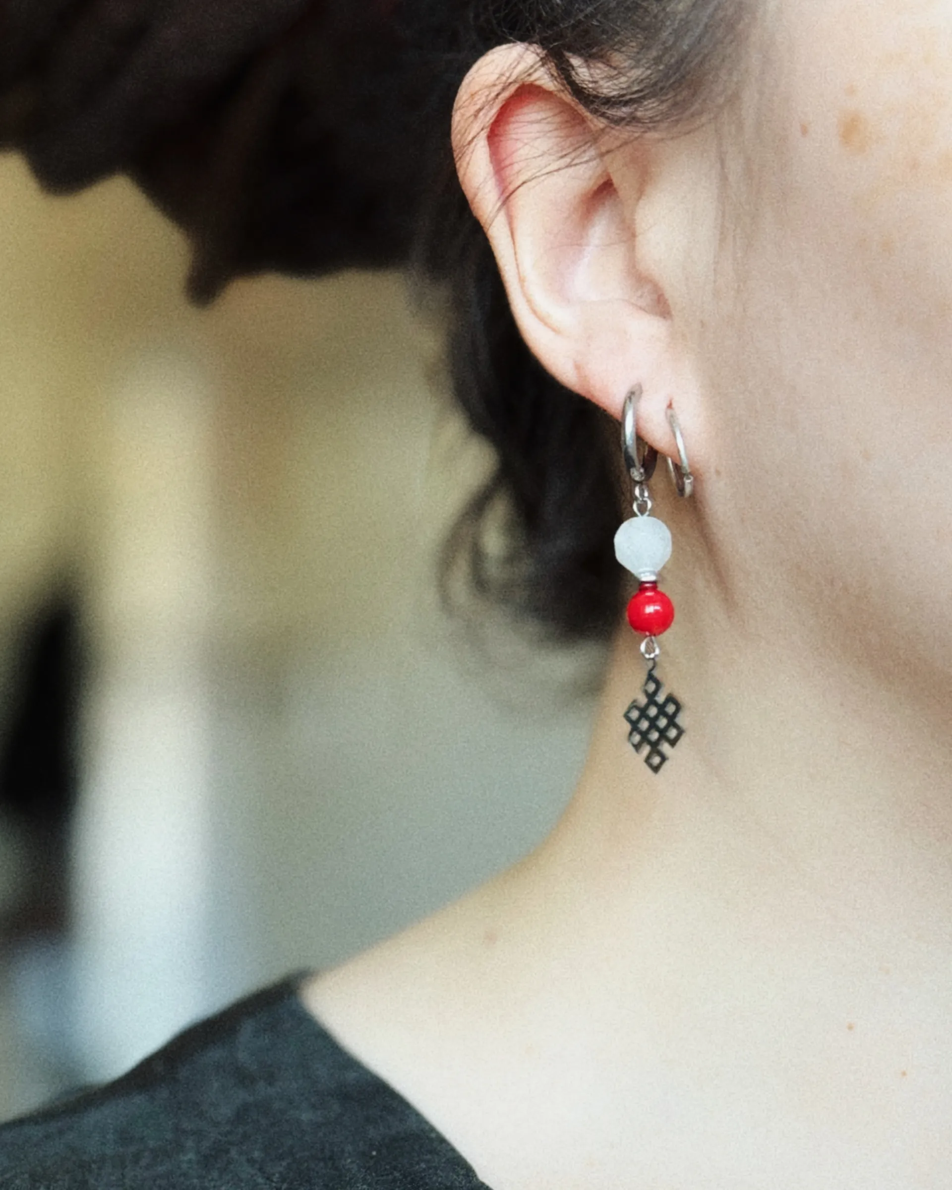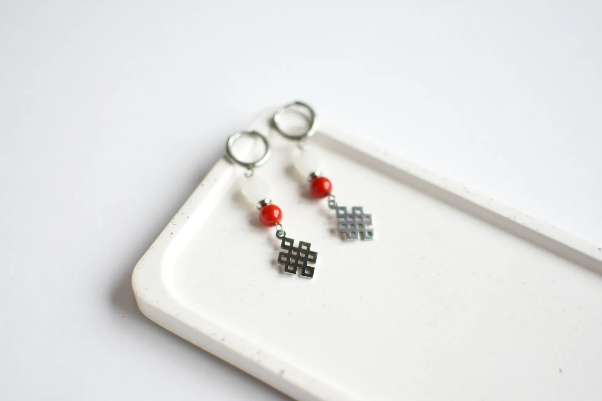 Небольшие серьги с натуральными камнями и символом "улзы", означающим благополучие и долголетие.