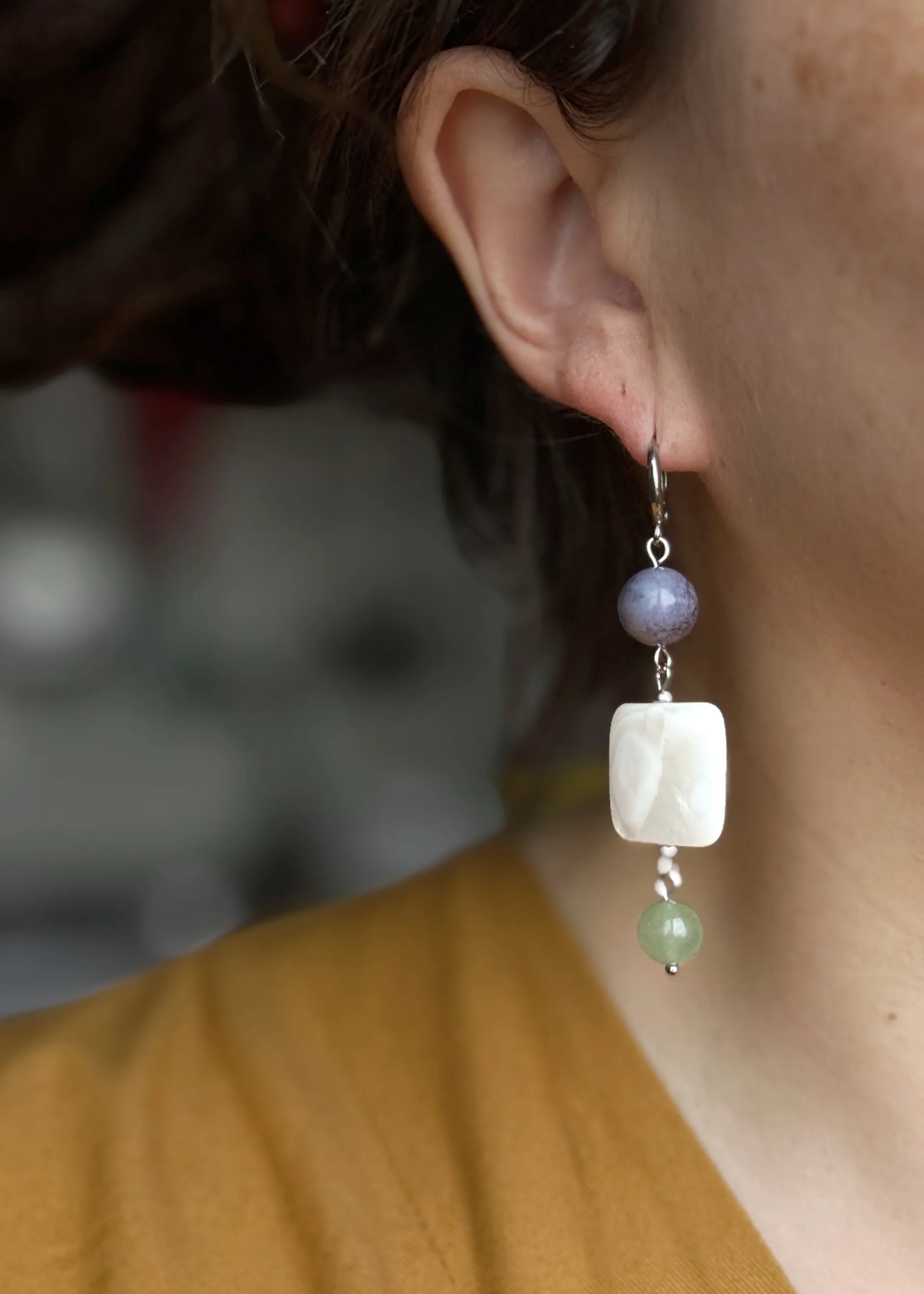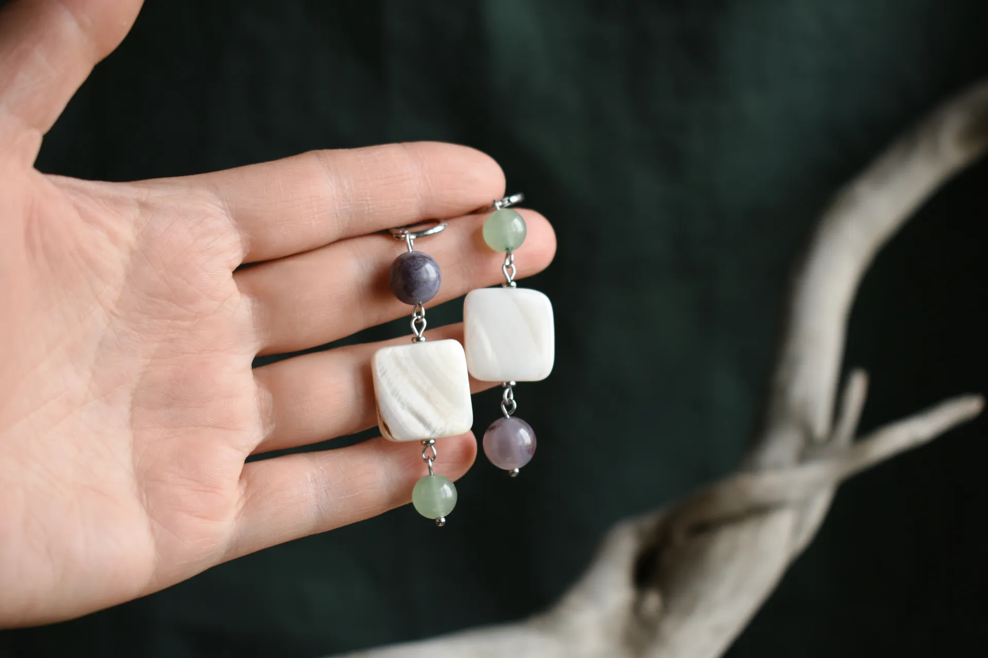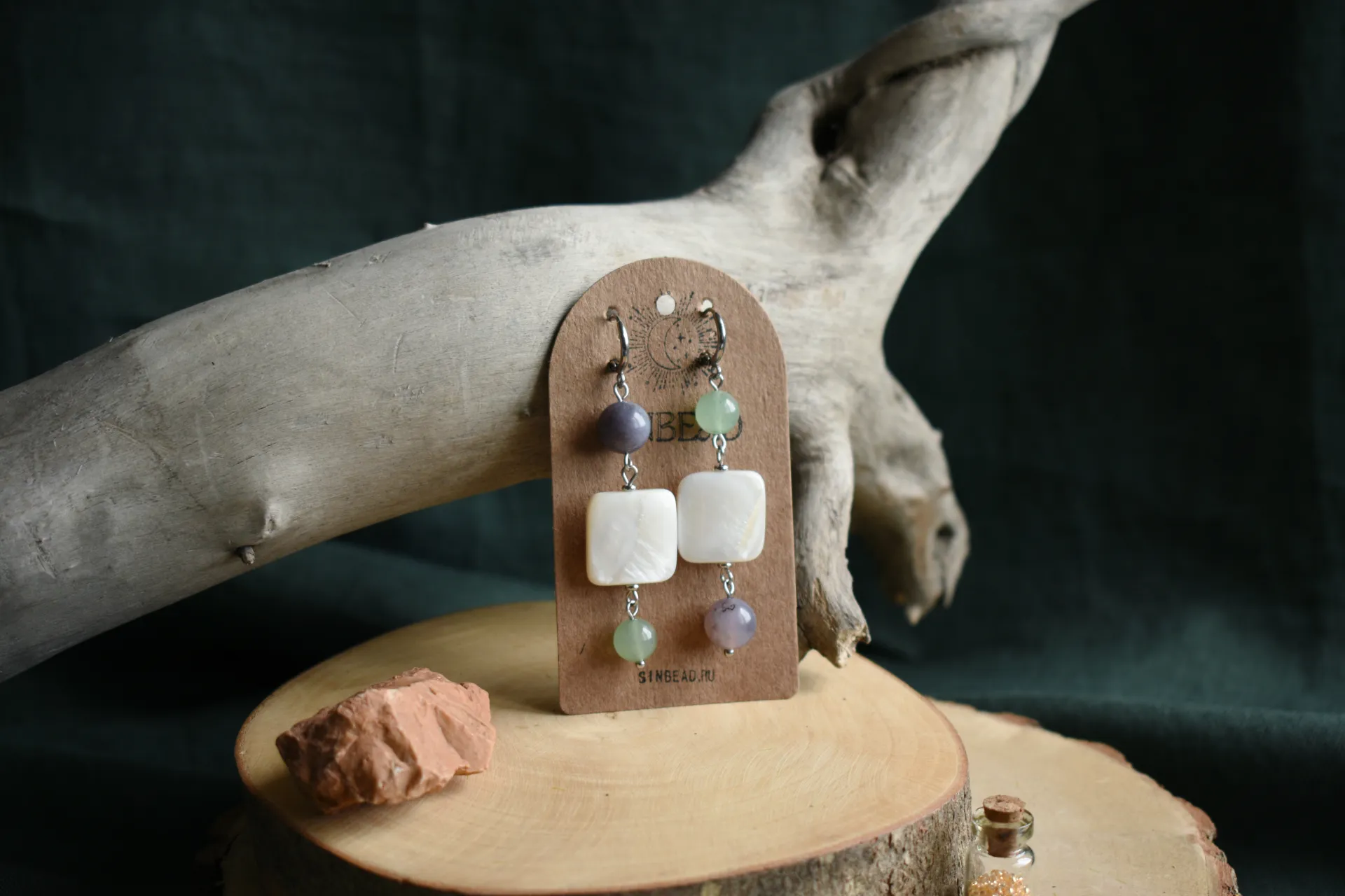 Крупные ассиметричные серьги из натуральных камней на швензах-колечках.