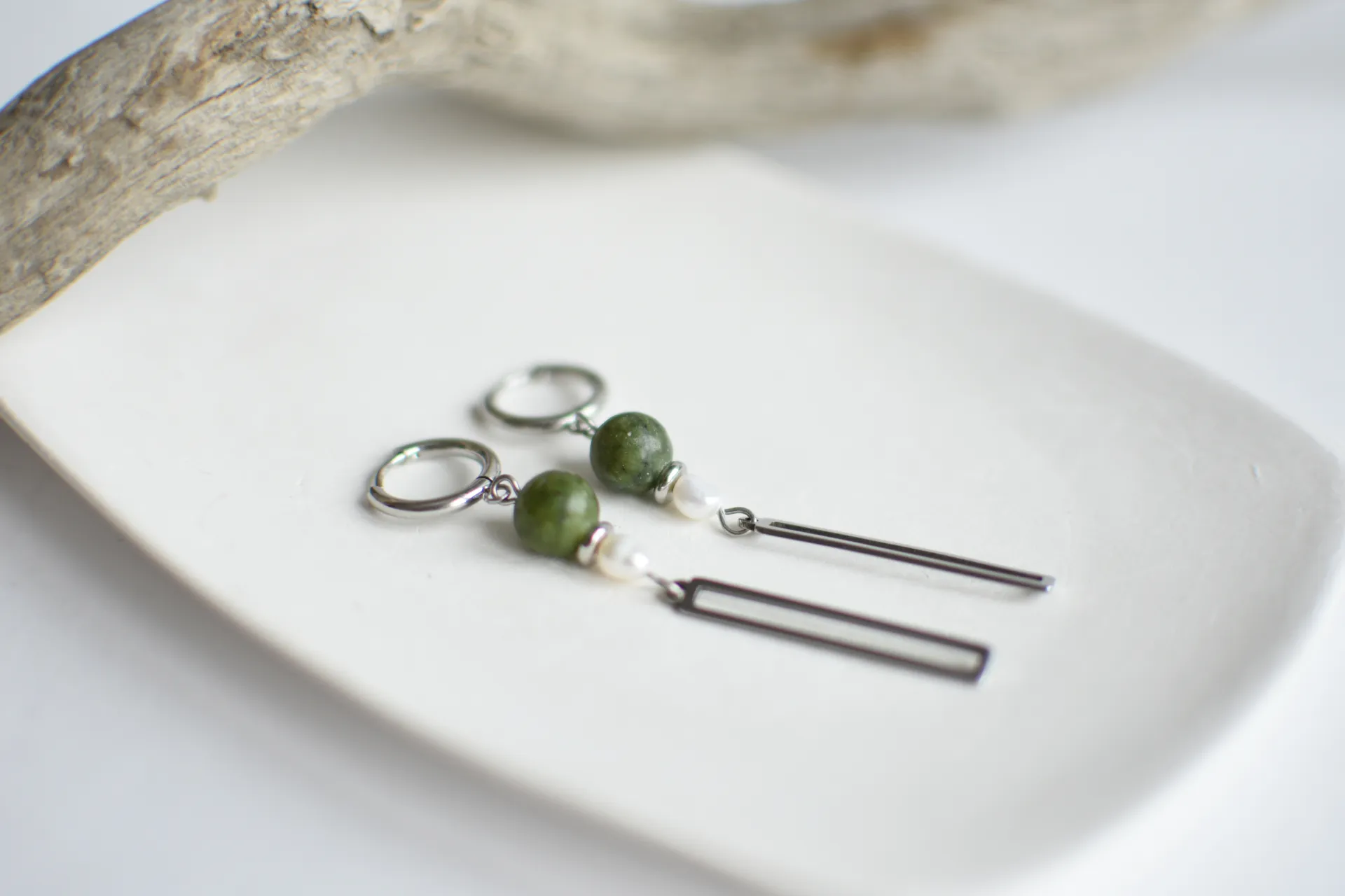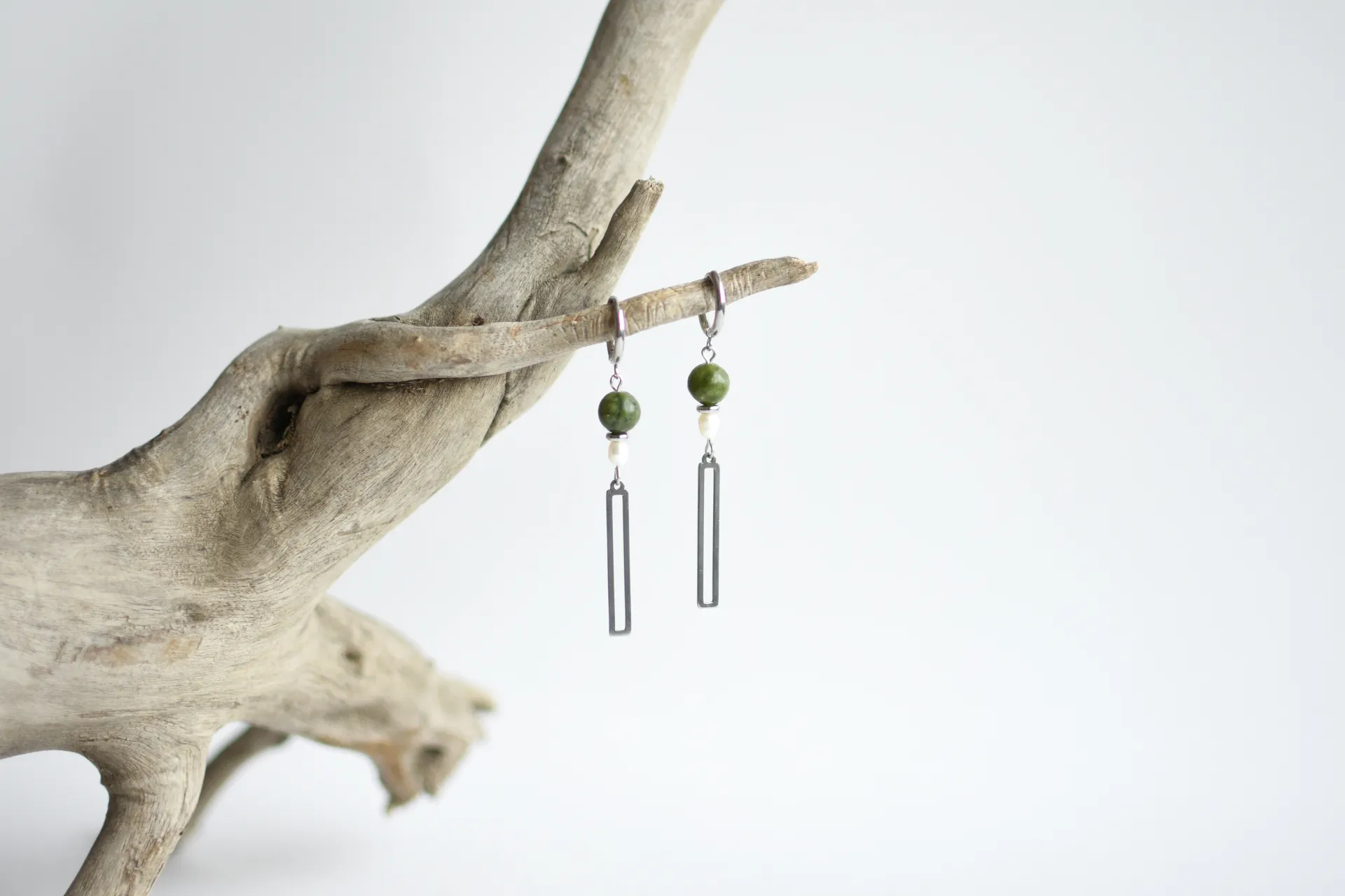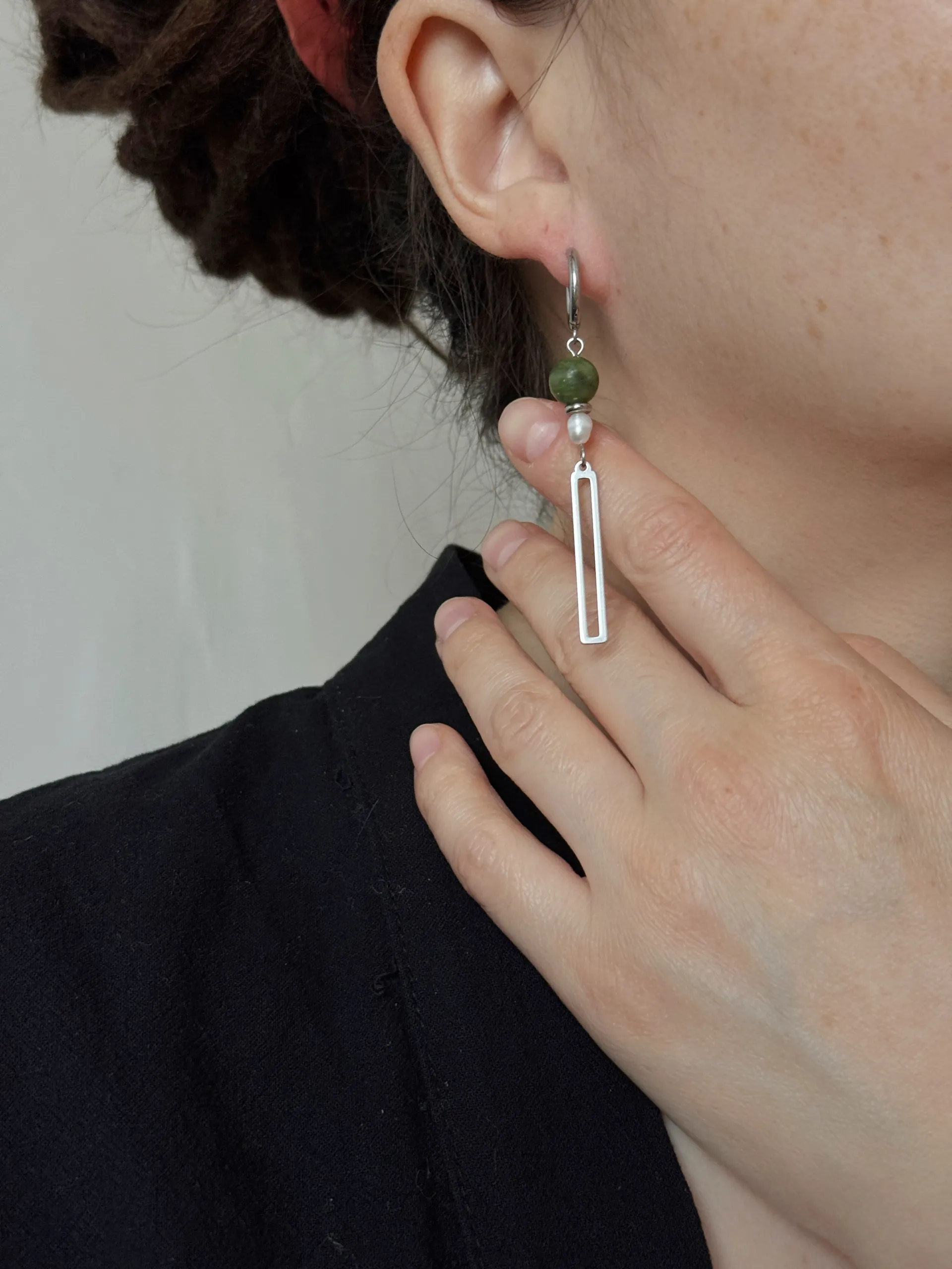 Длинные серьги с серпентином и жемчужинами.