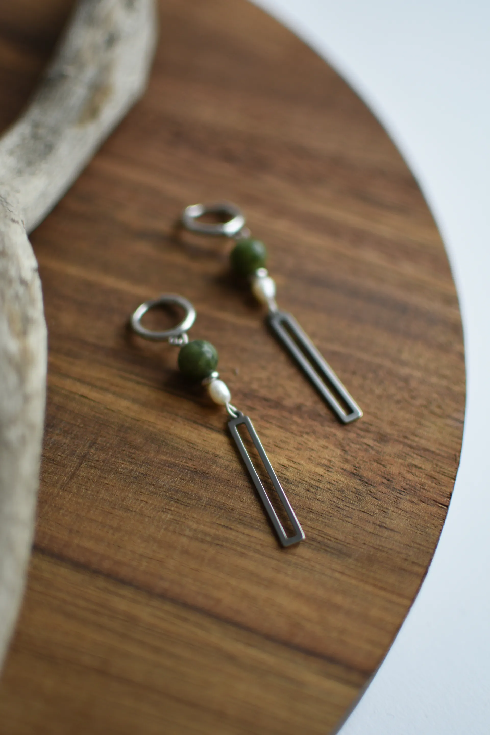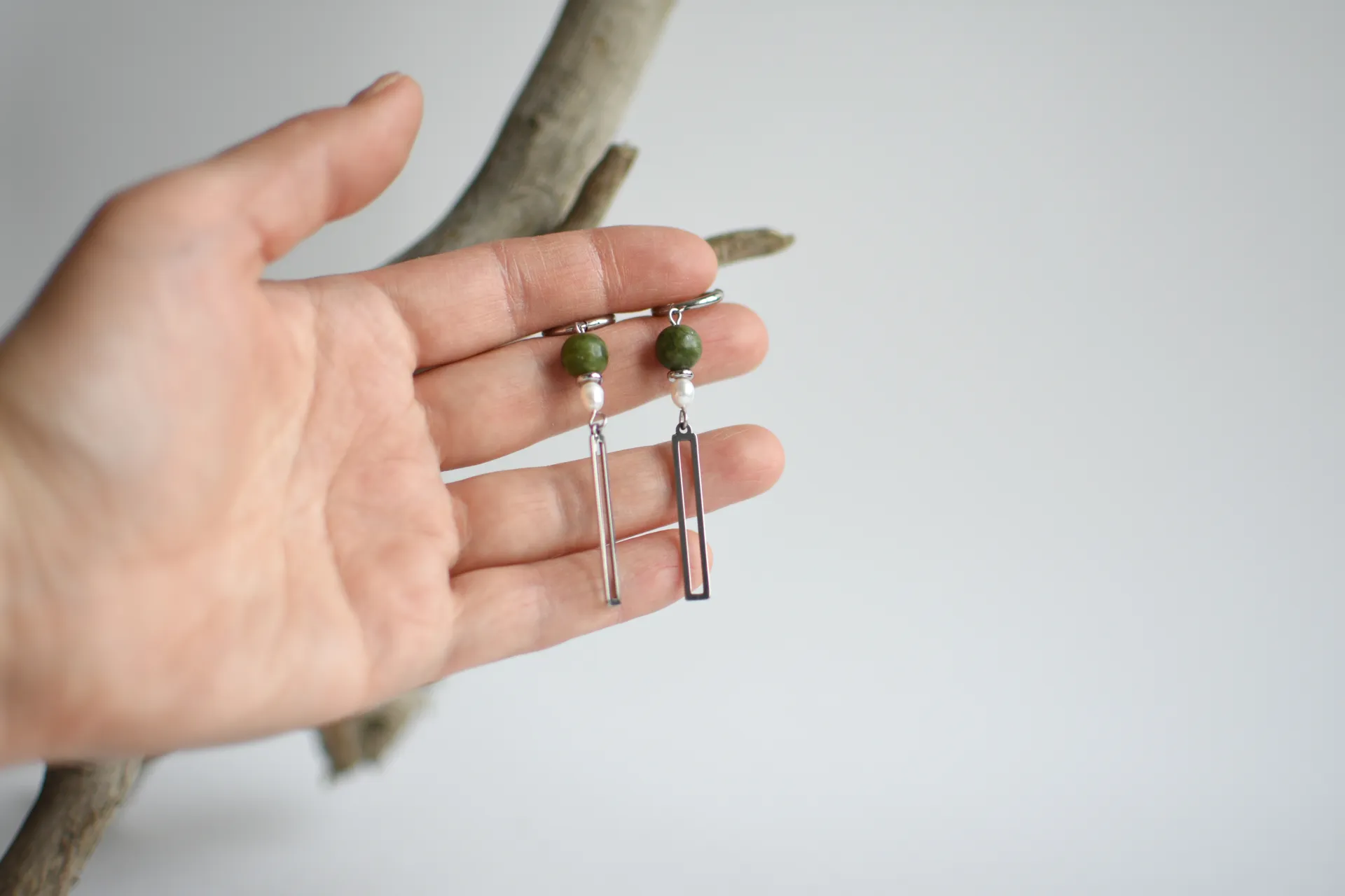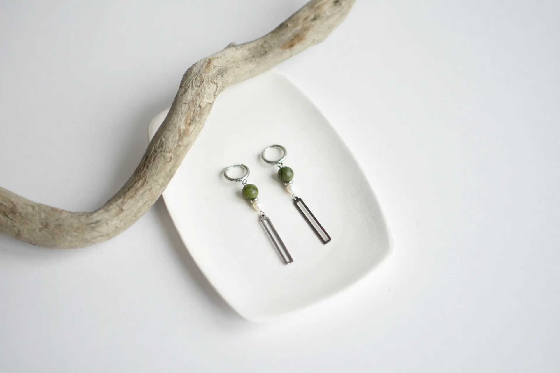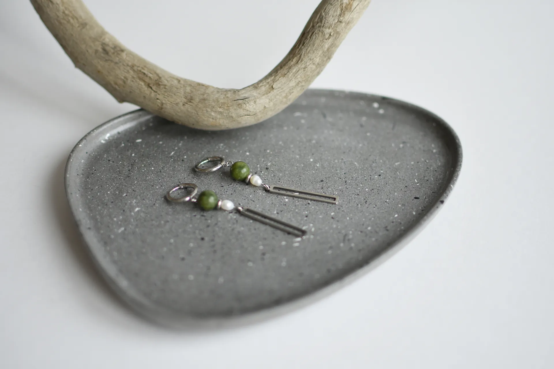 Длинные серьги с серпентином и жемчужинами.