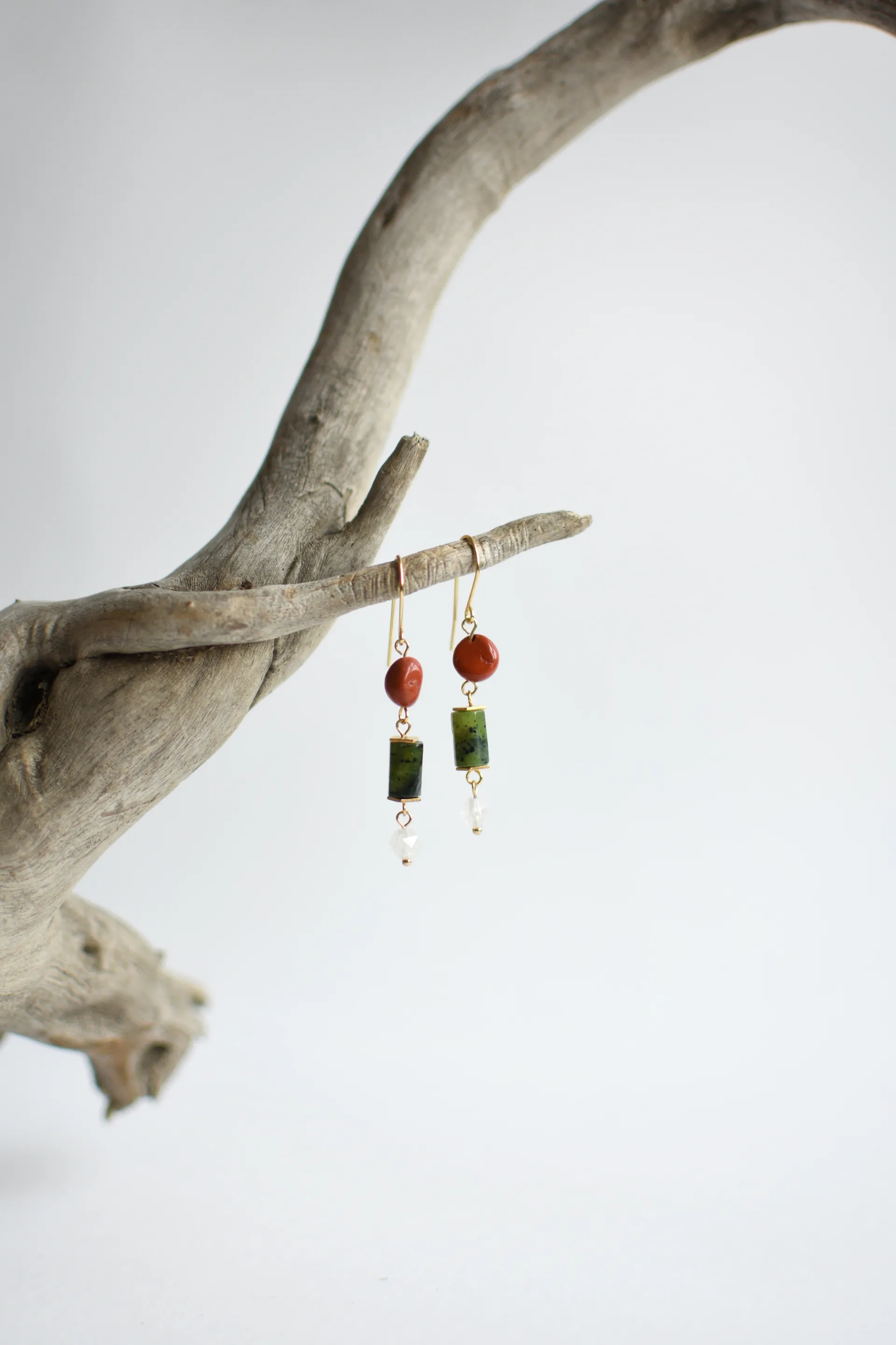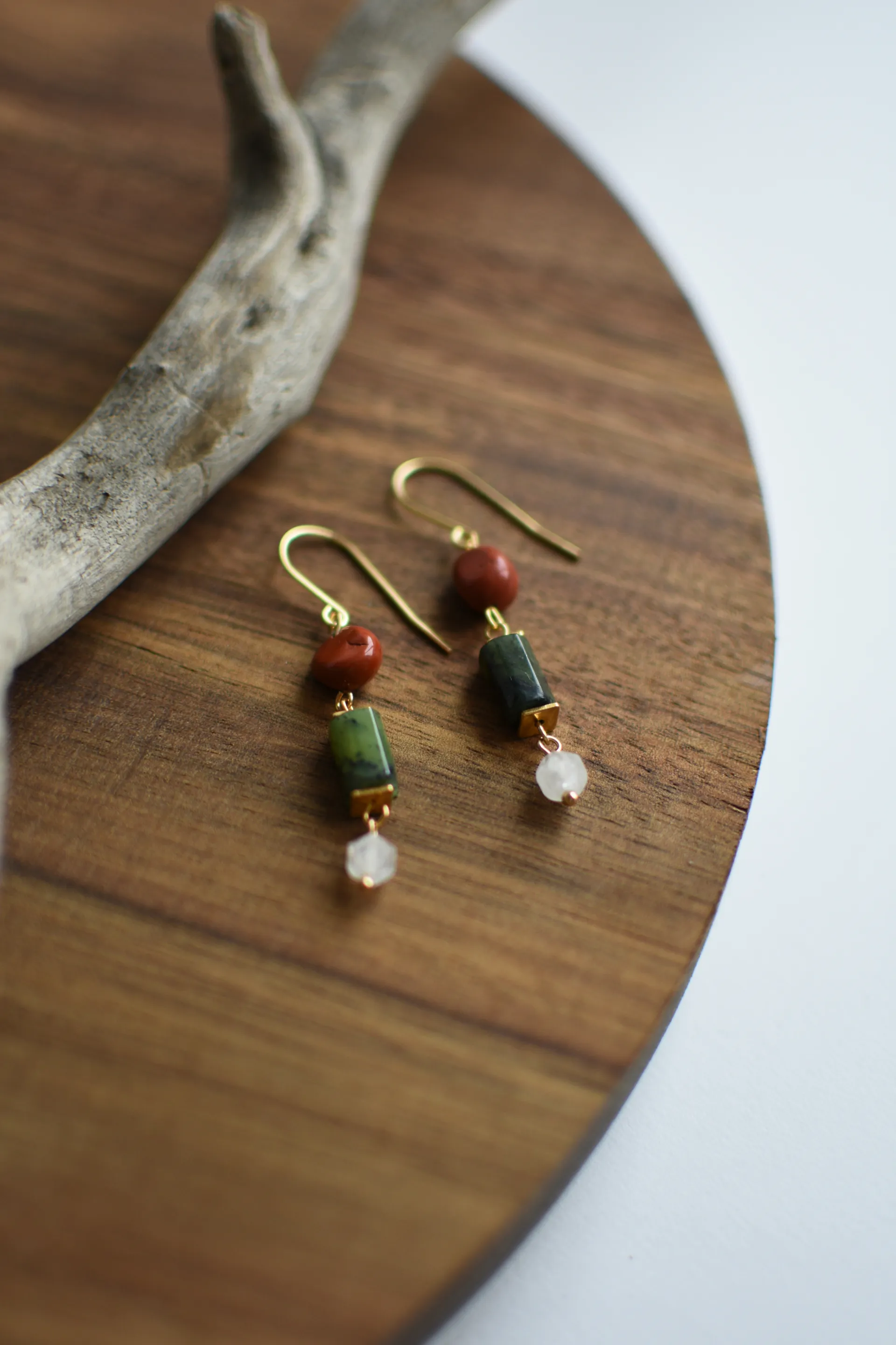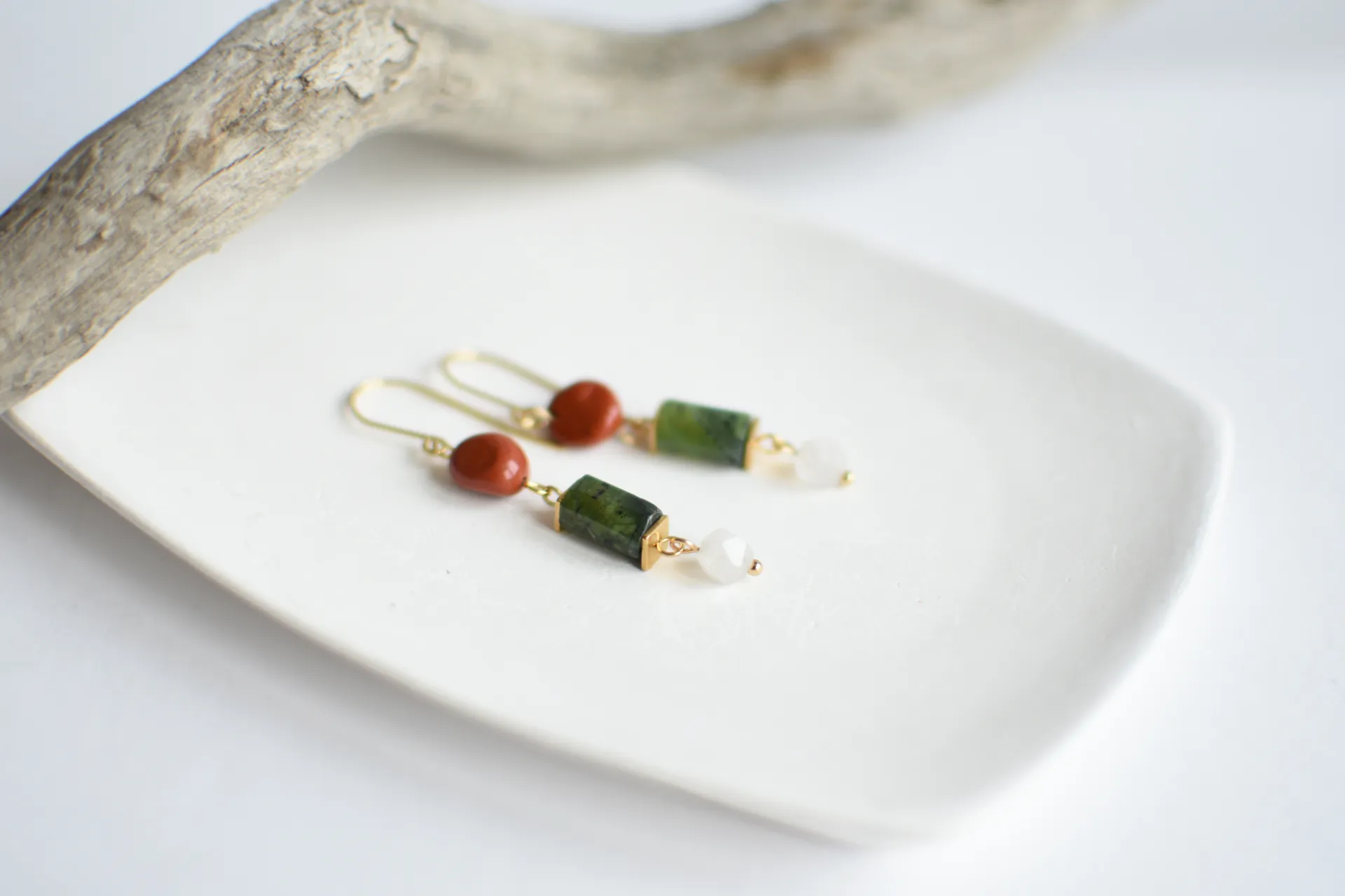 Небольшие серьги с гранёным серпентином (змеевиком), красной яшмой и белым кварцем.