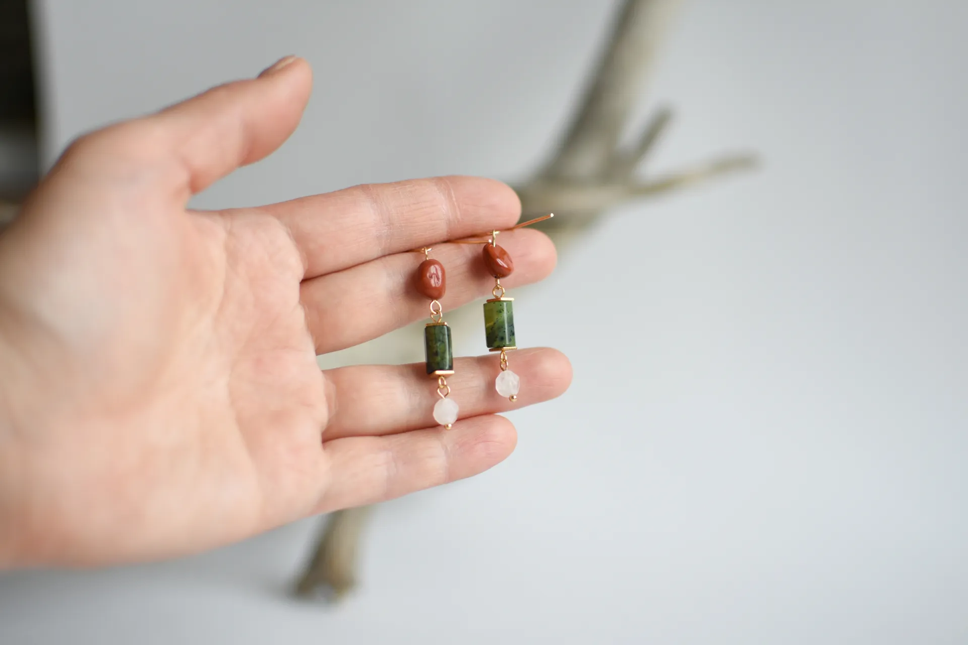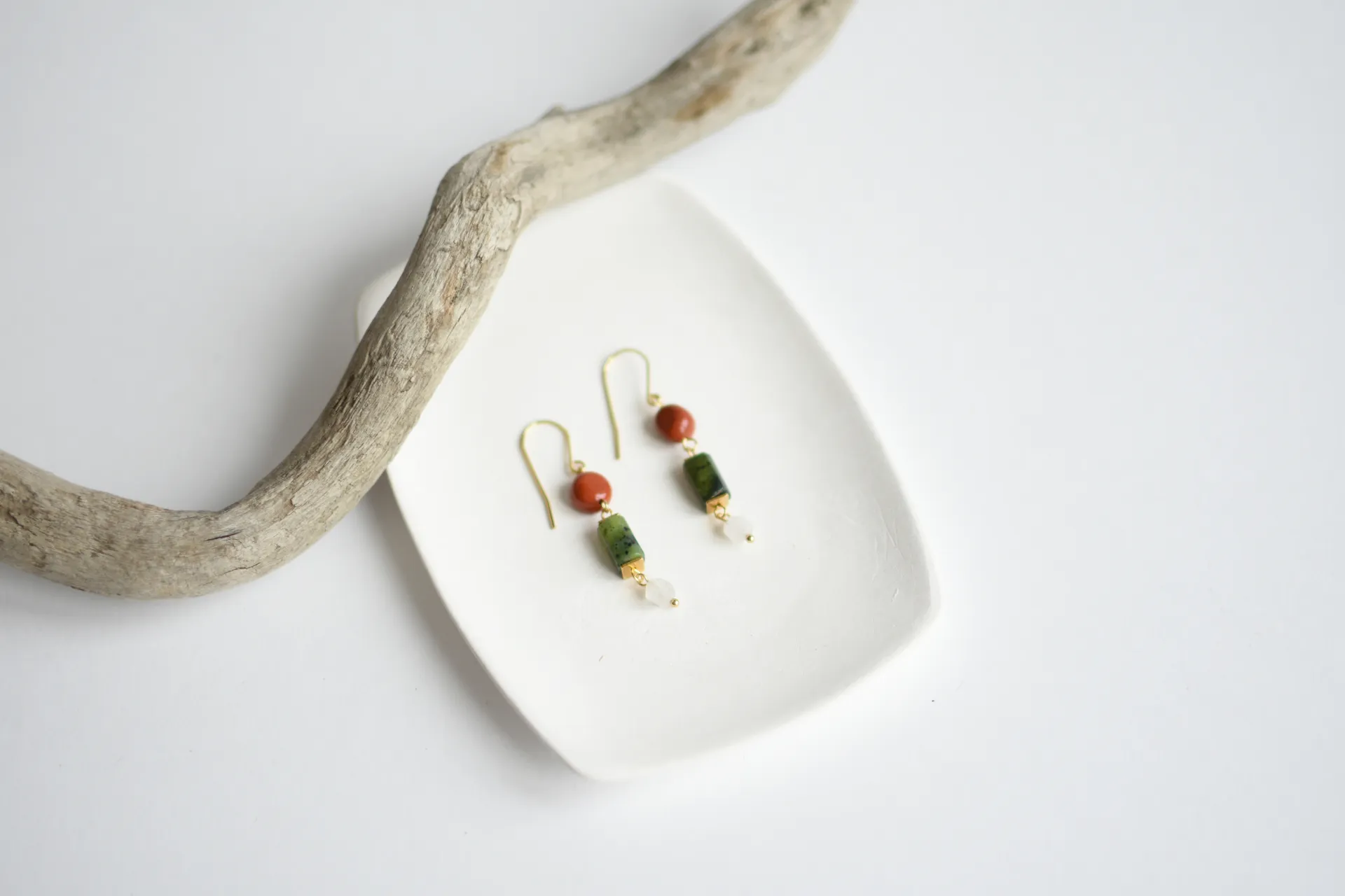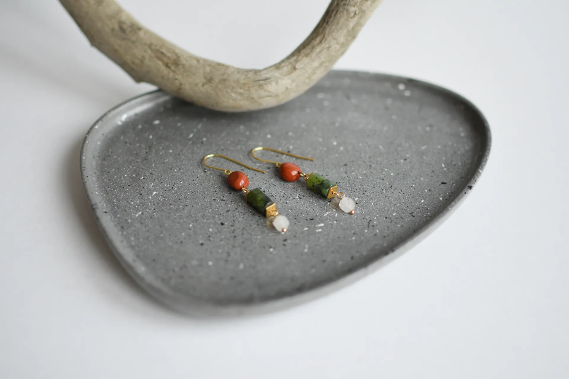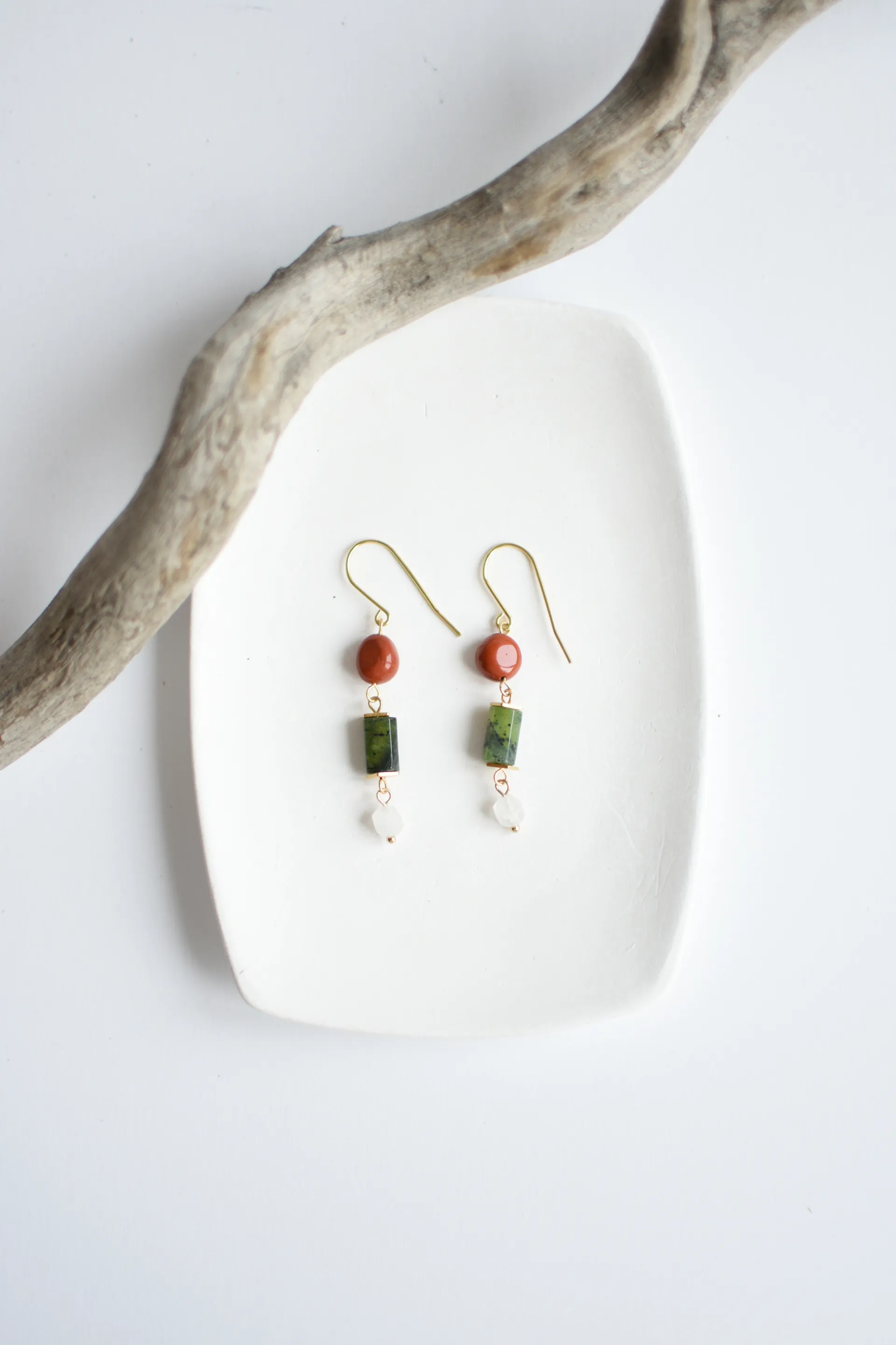 Небольшие серьги с гранёным серпентином (змеевиком), красной яшмой и белым кварцем.