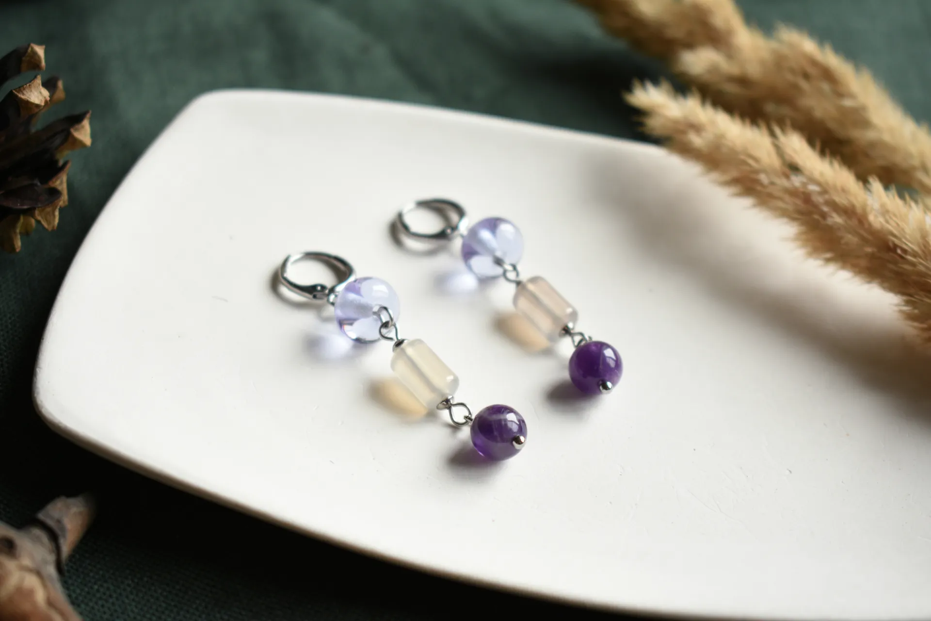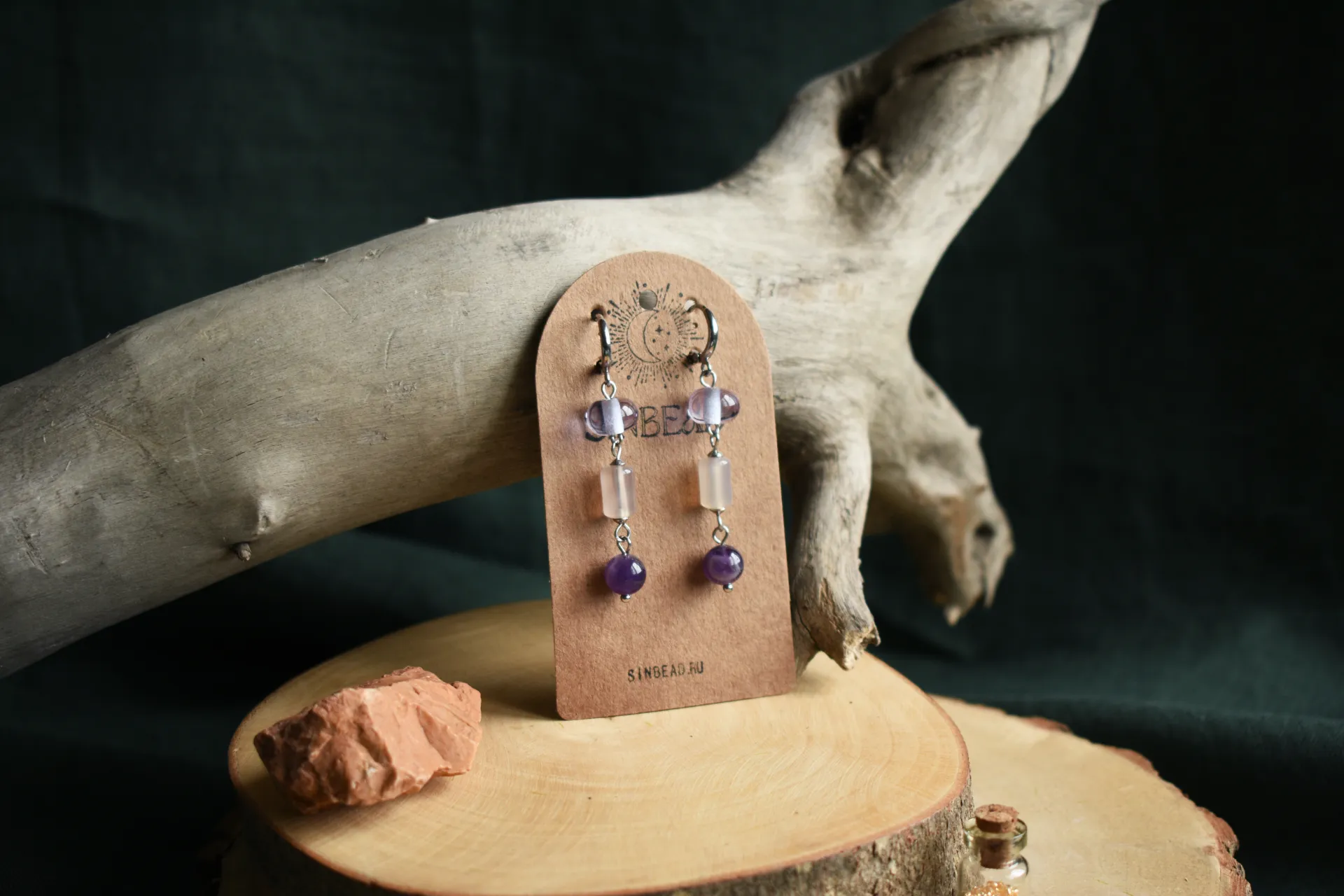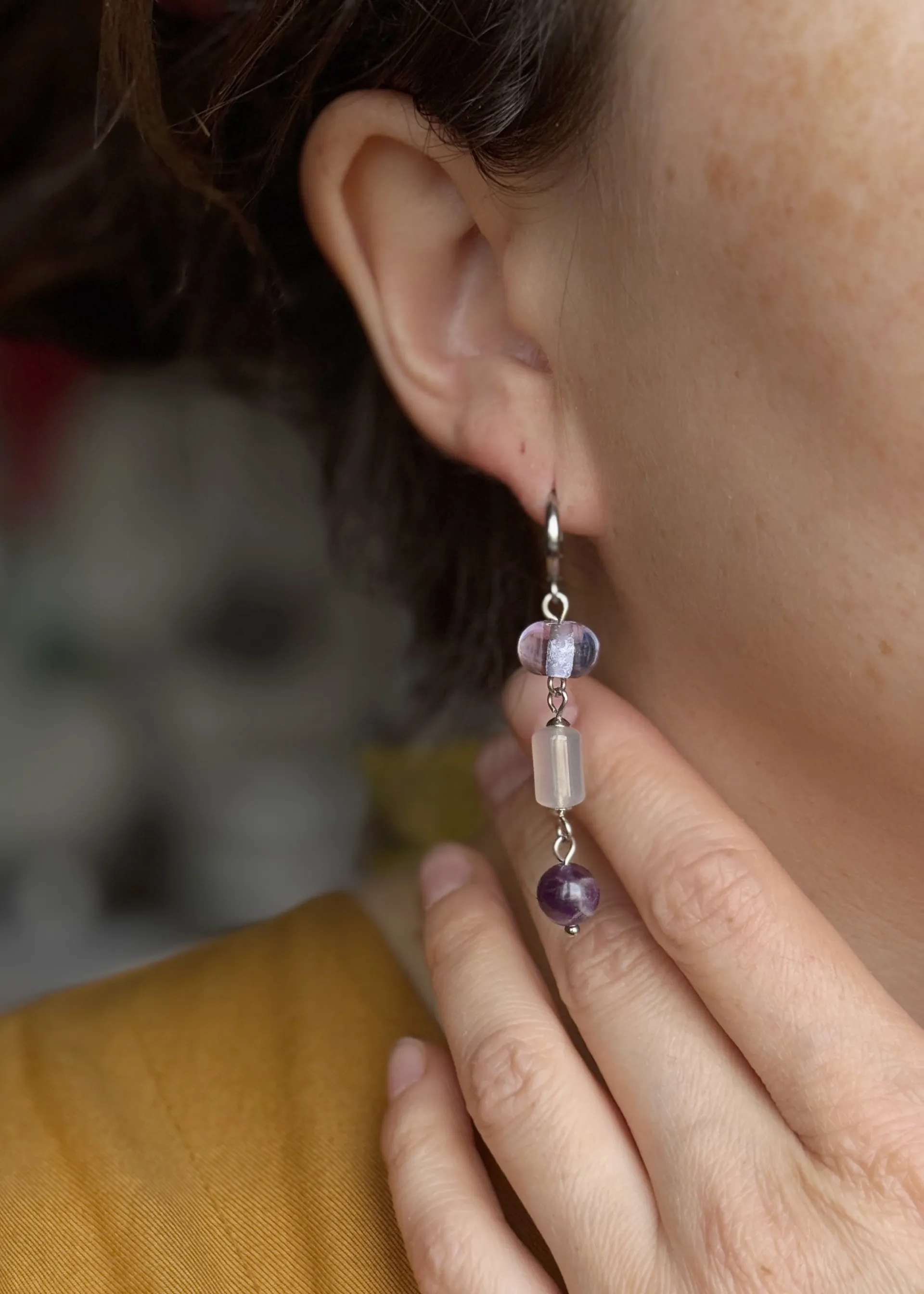Нежные серьги с натуральными камнями и стеклом ручной работы на удобных швензах-колечках.