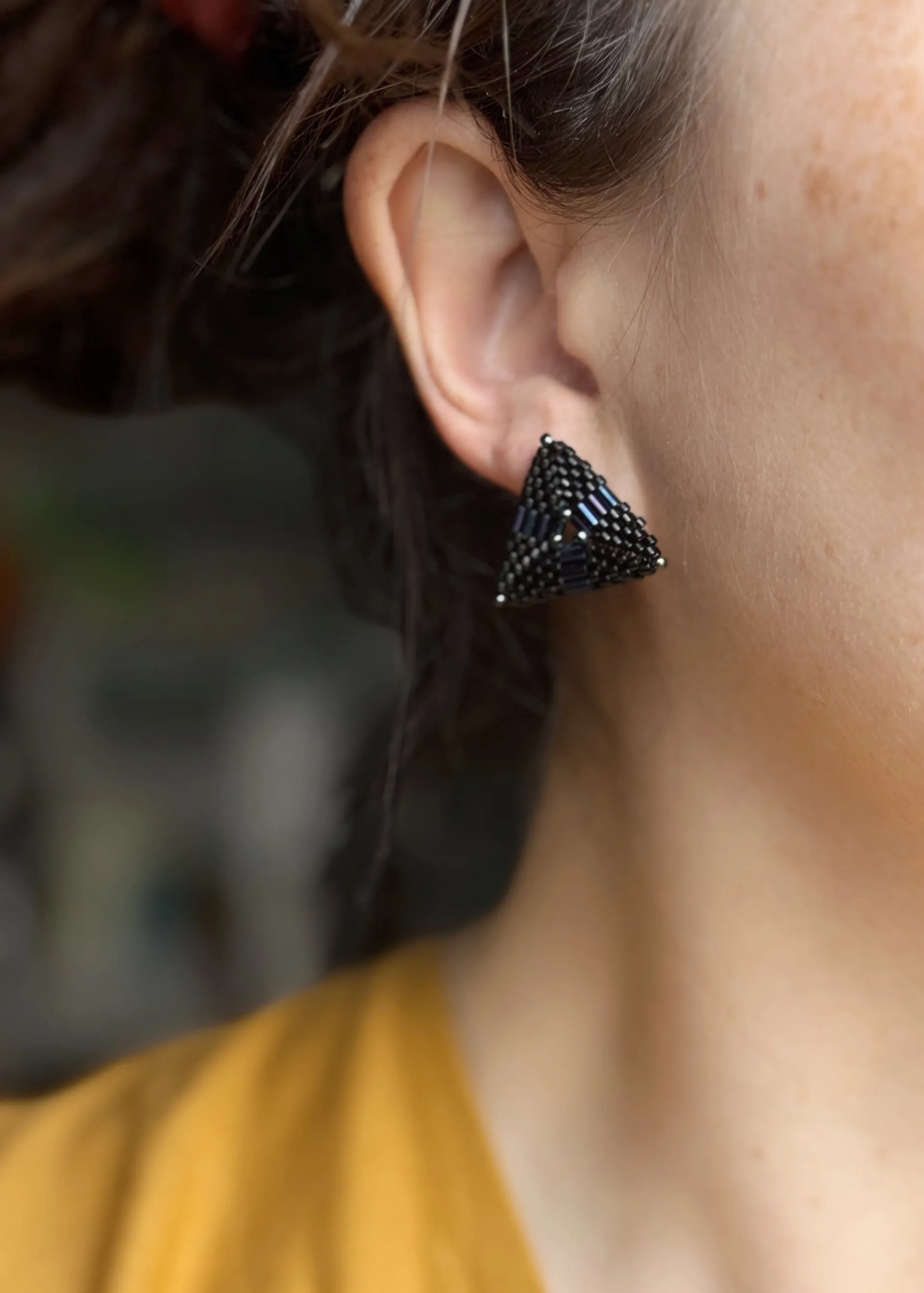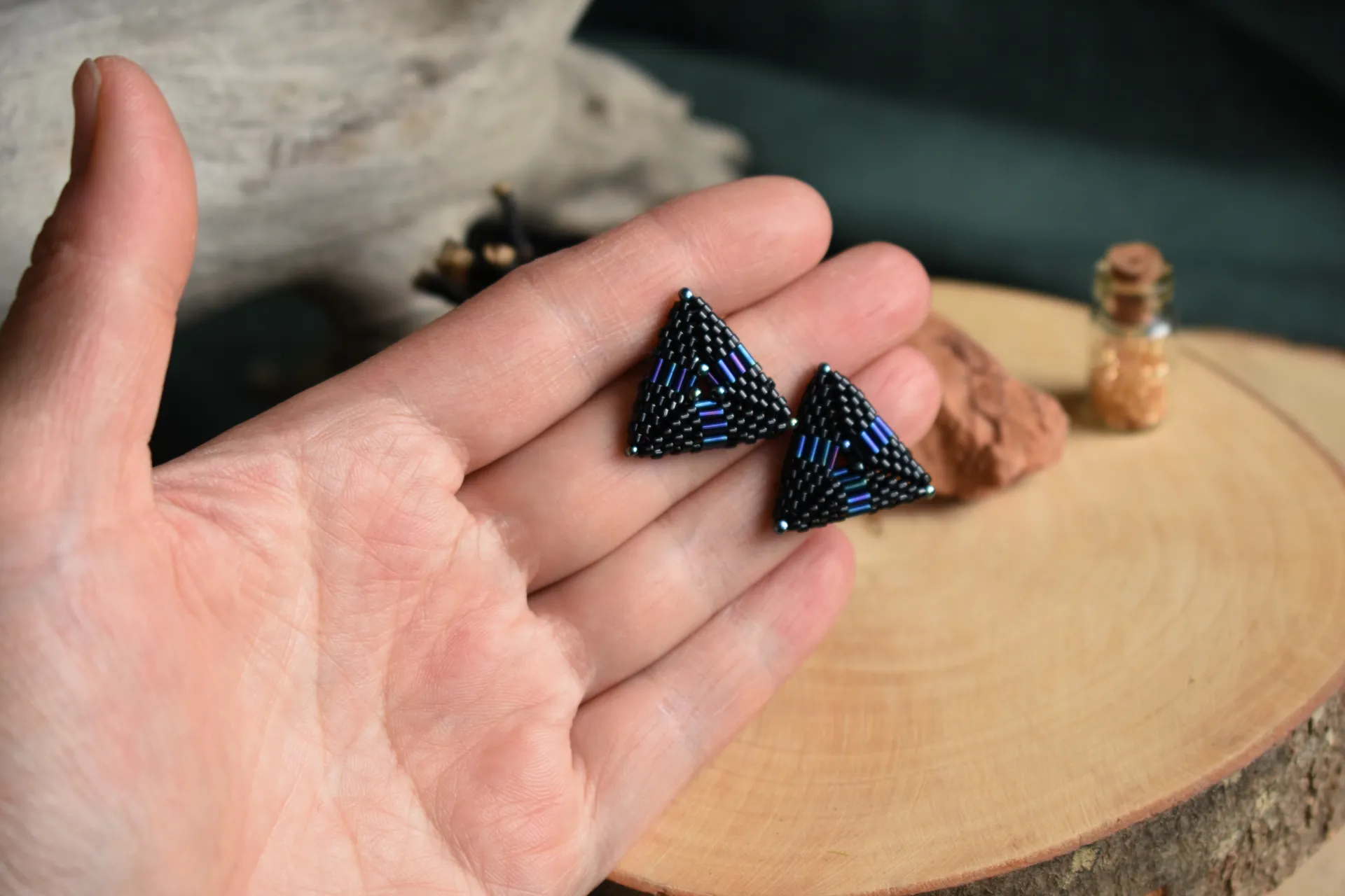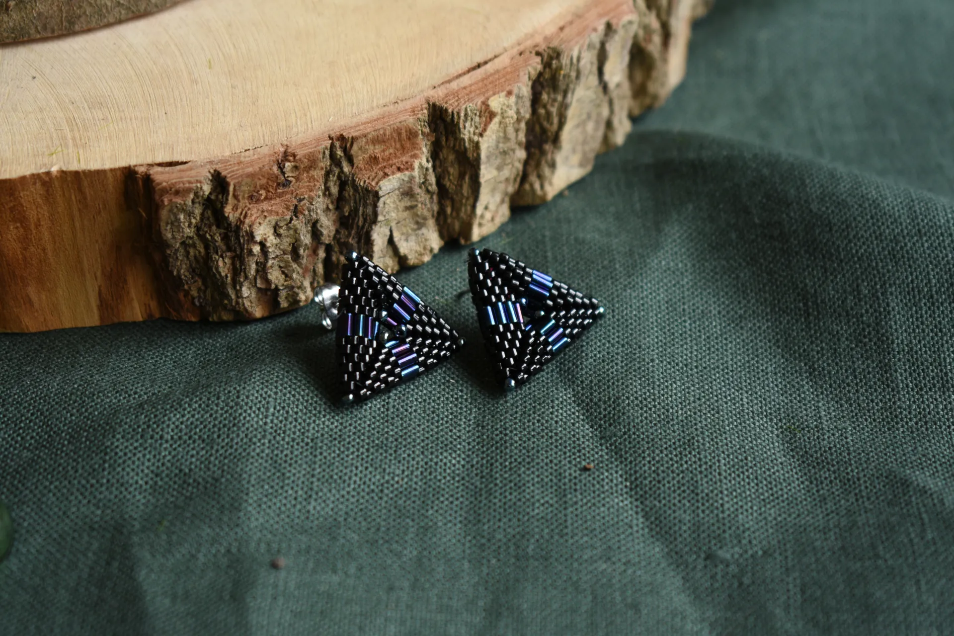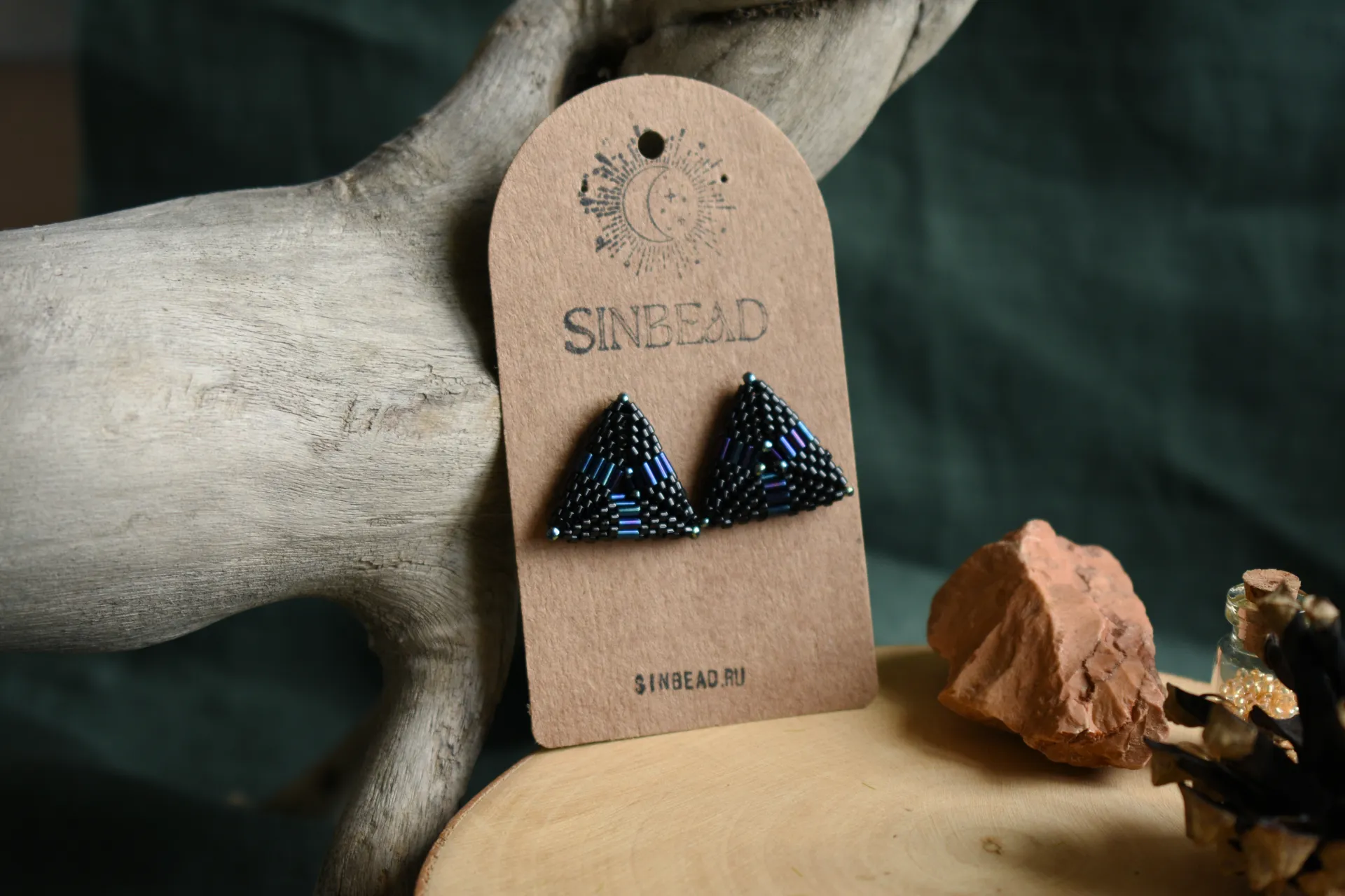 Серьги-гвоздики из черного бисера и темно-синего переливающегося стекляруса. Гвоздик расположен в вершине треугольника.