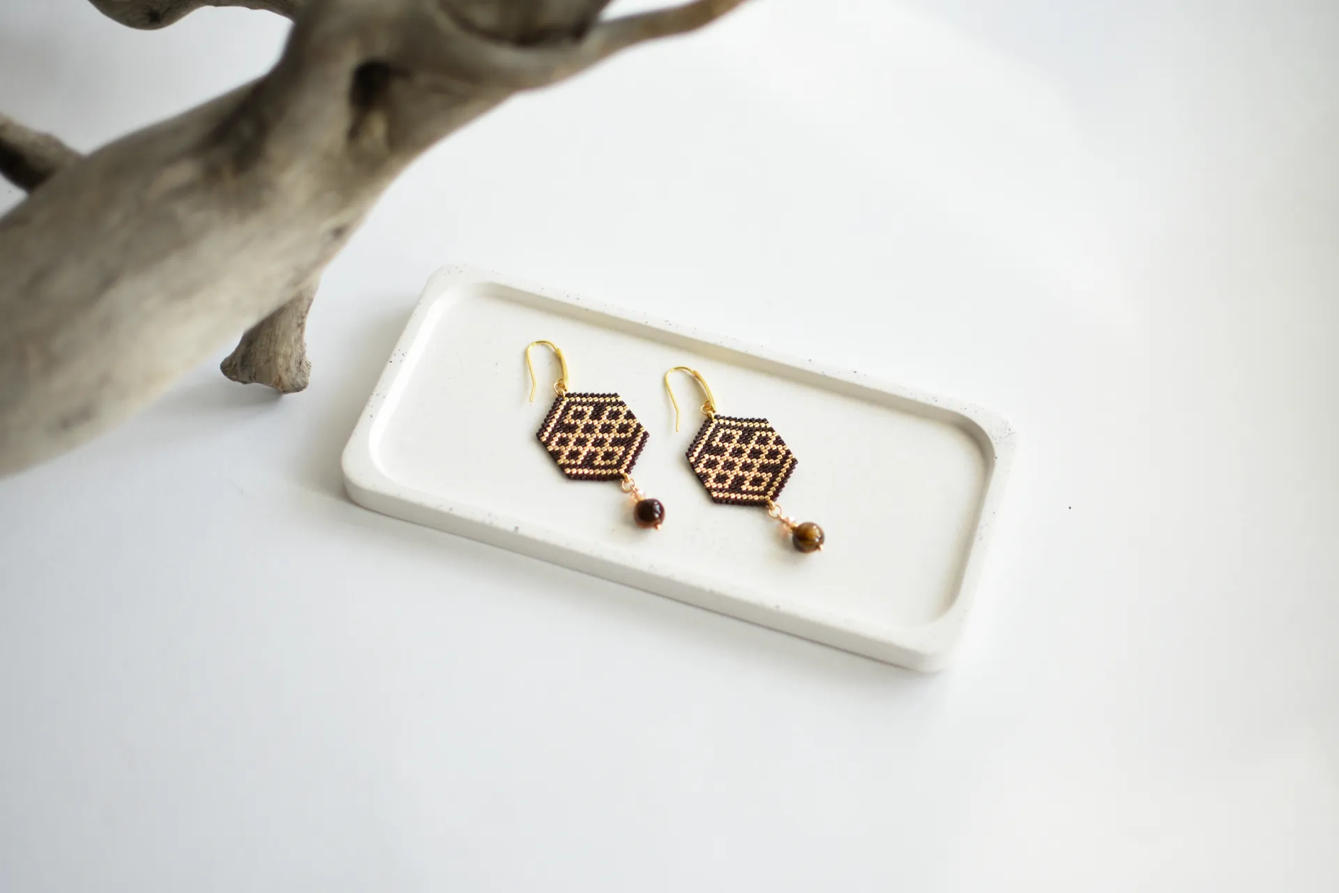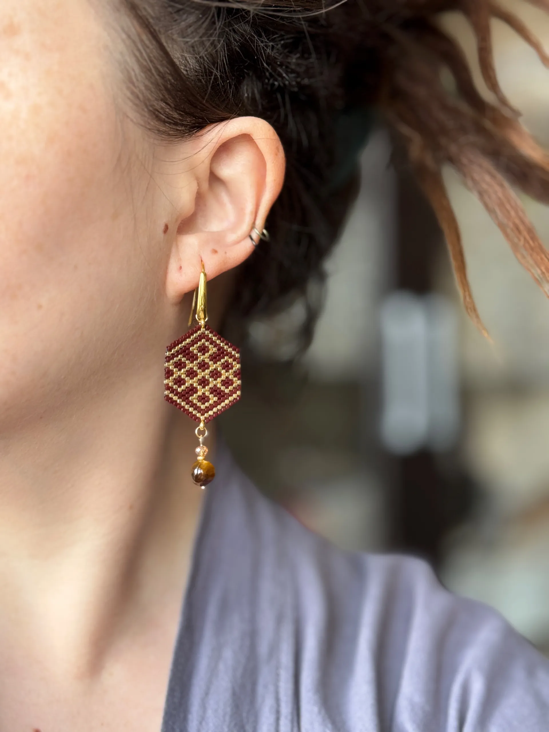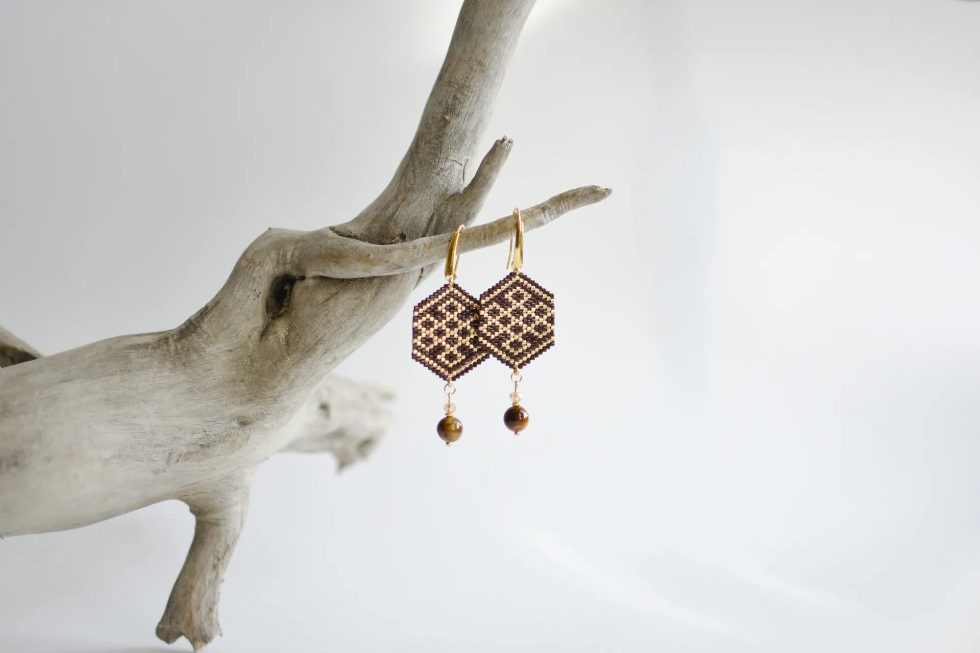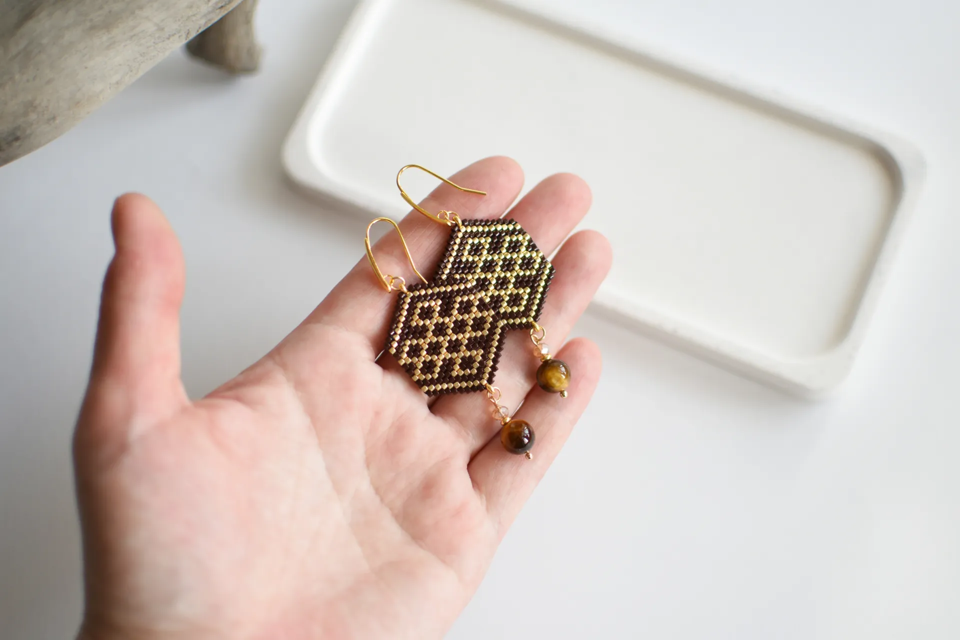 Серьги с "улзы" - узлом бесконечности, символизирующем счастье, благополучие, удачу. Дополнены бусинами тигрового глаза.