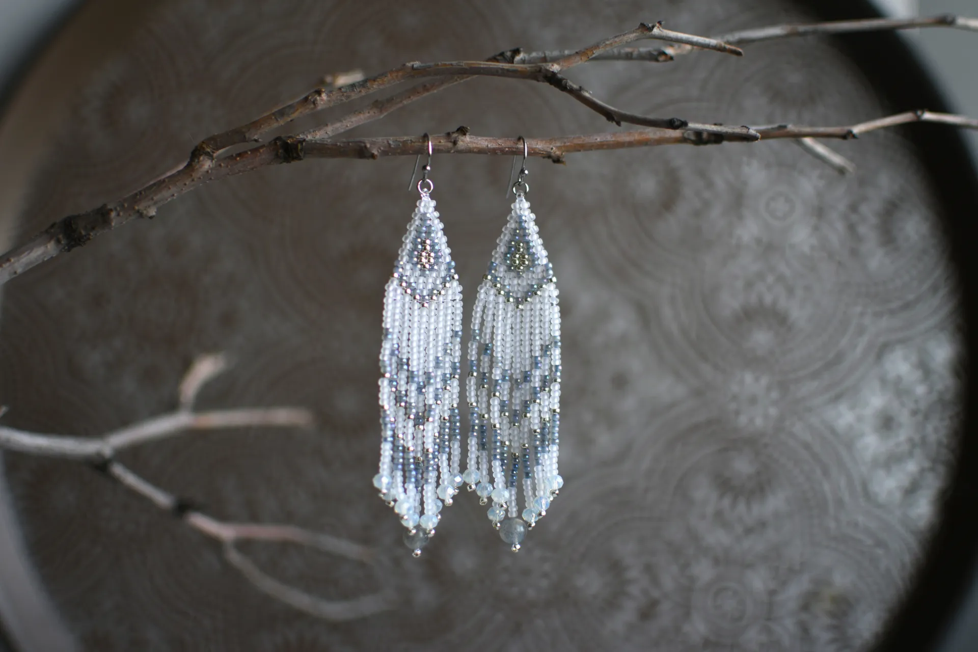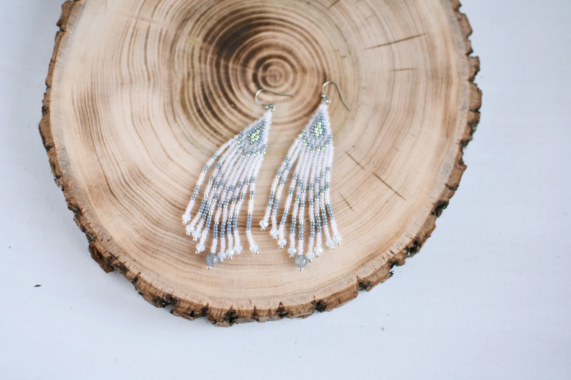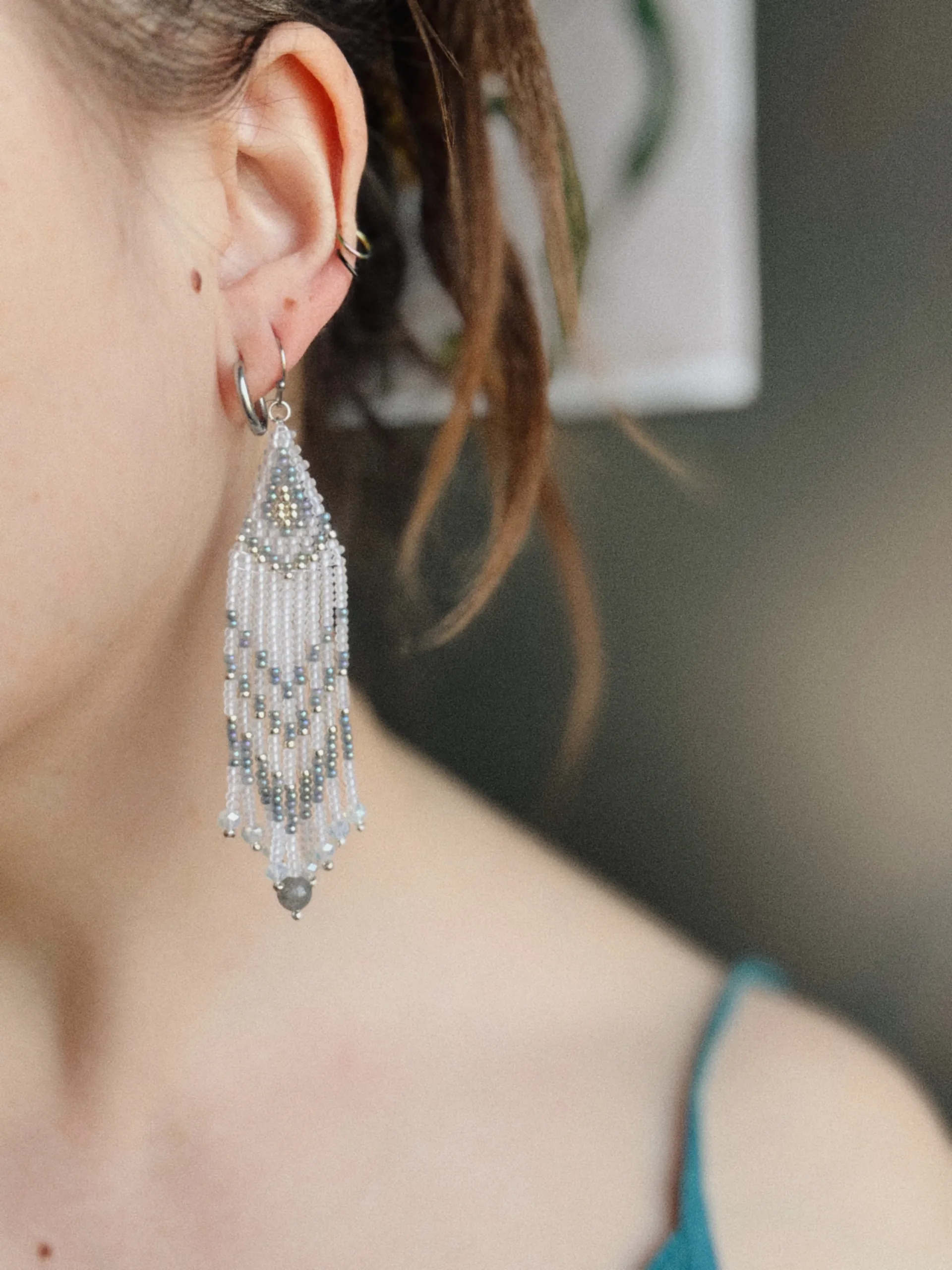 Нежные серьги из полупрозрачного матового и серого бисера с радужным покрытием. Бахрома дополнена стеклянными бусинами и бусиной лабрадора.