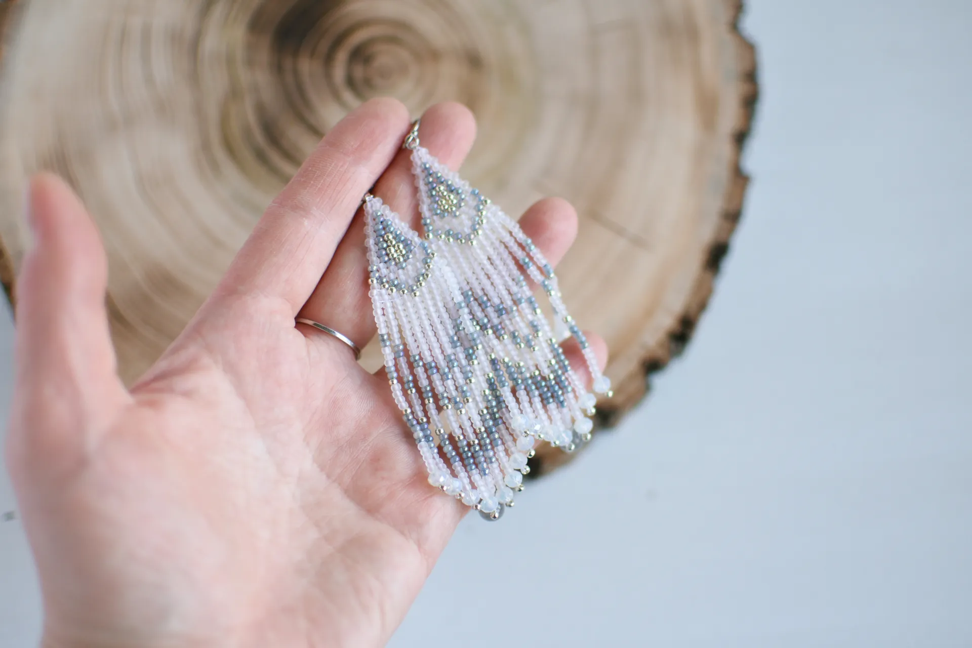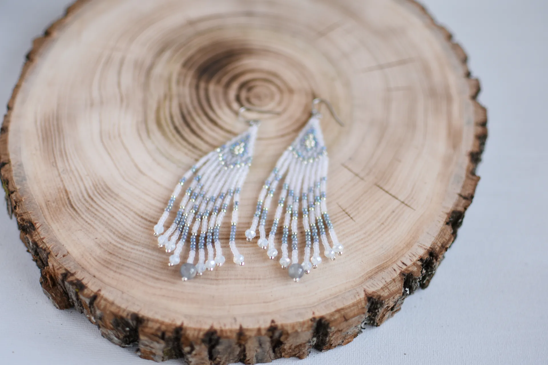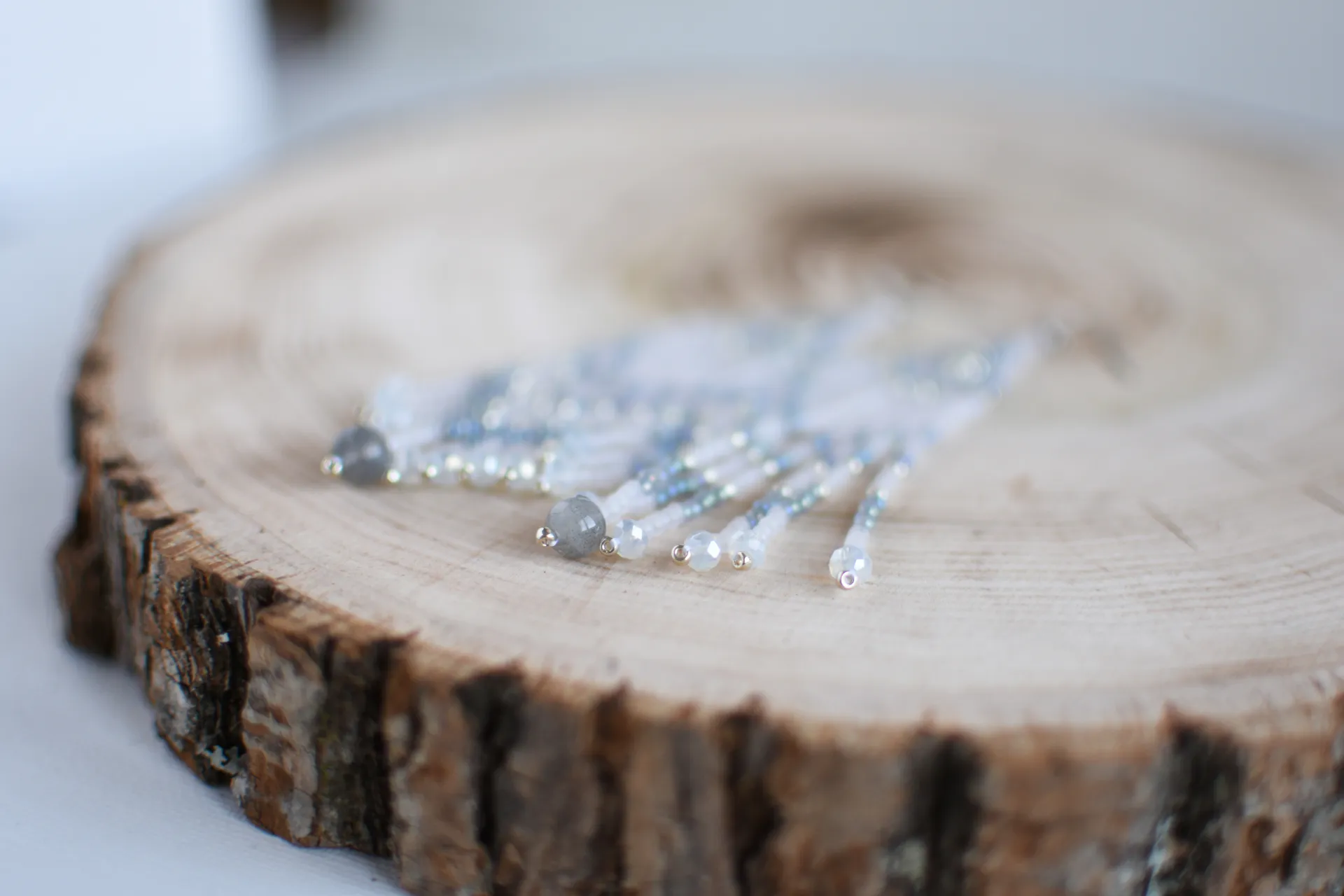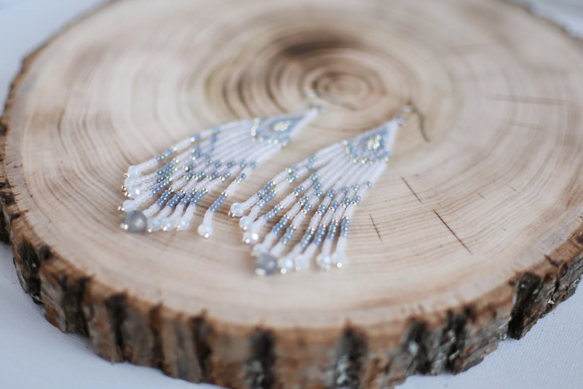 Нежные серьги из полупрозрачного матового и серого бисера с радужным покрытием. Бахрома дополнена стеклянными бусинами и бусиной лабрадора.