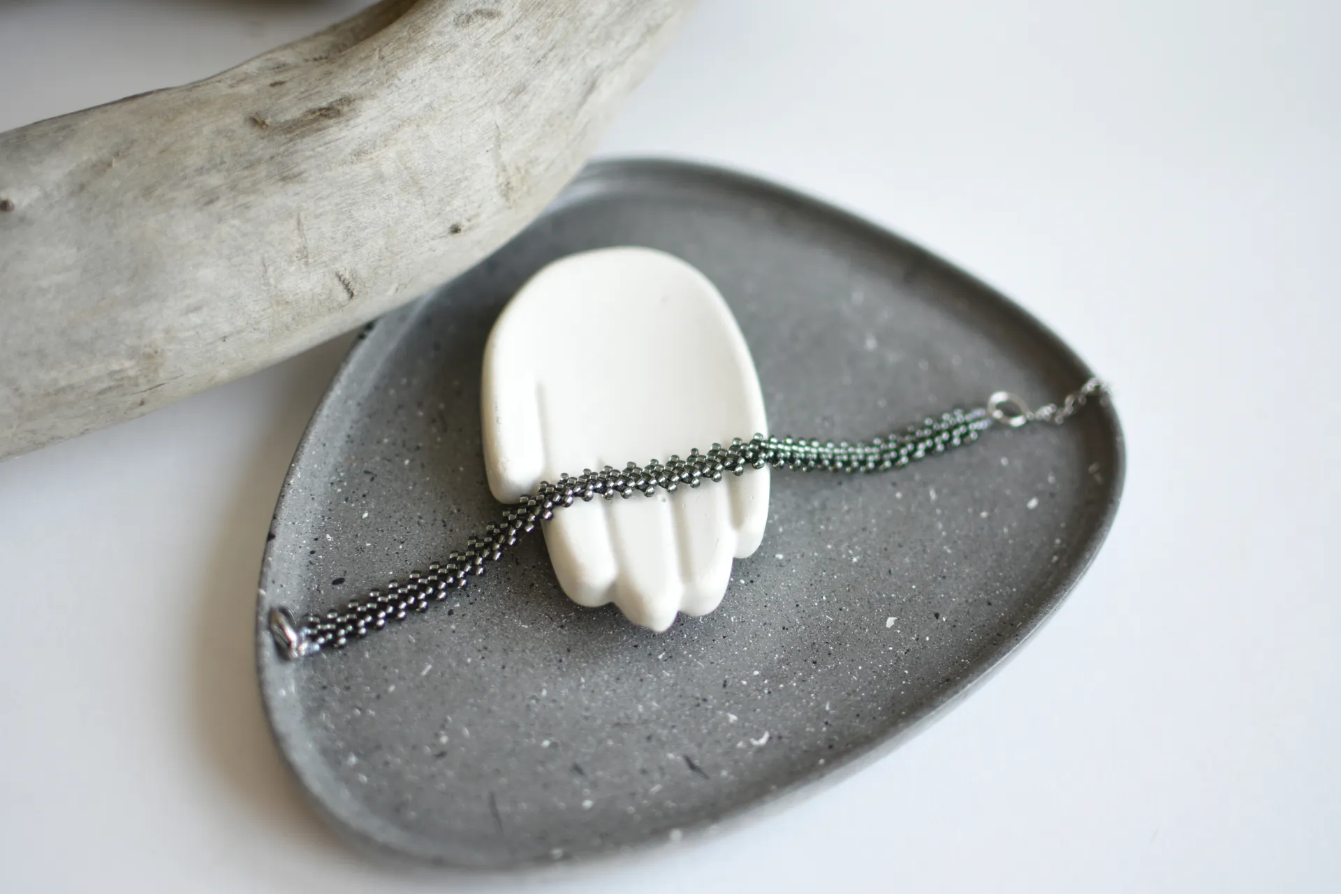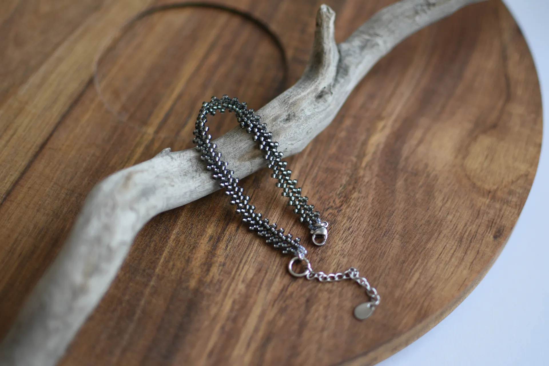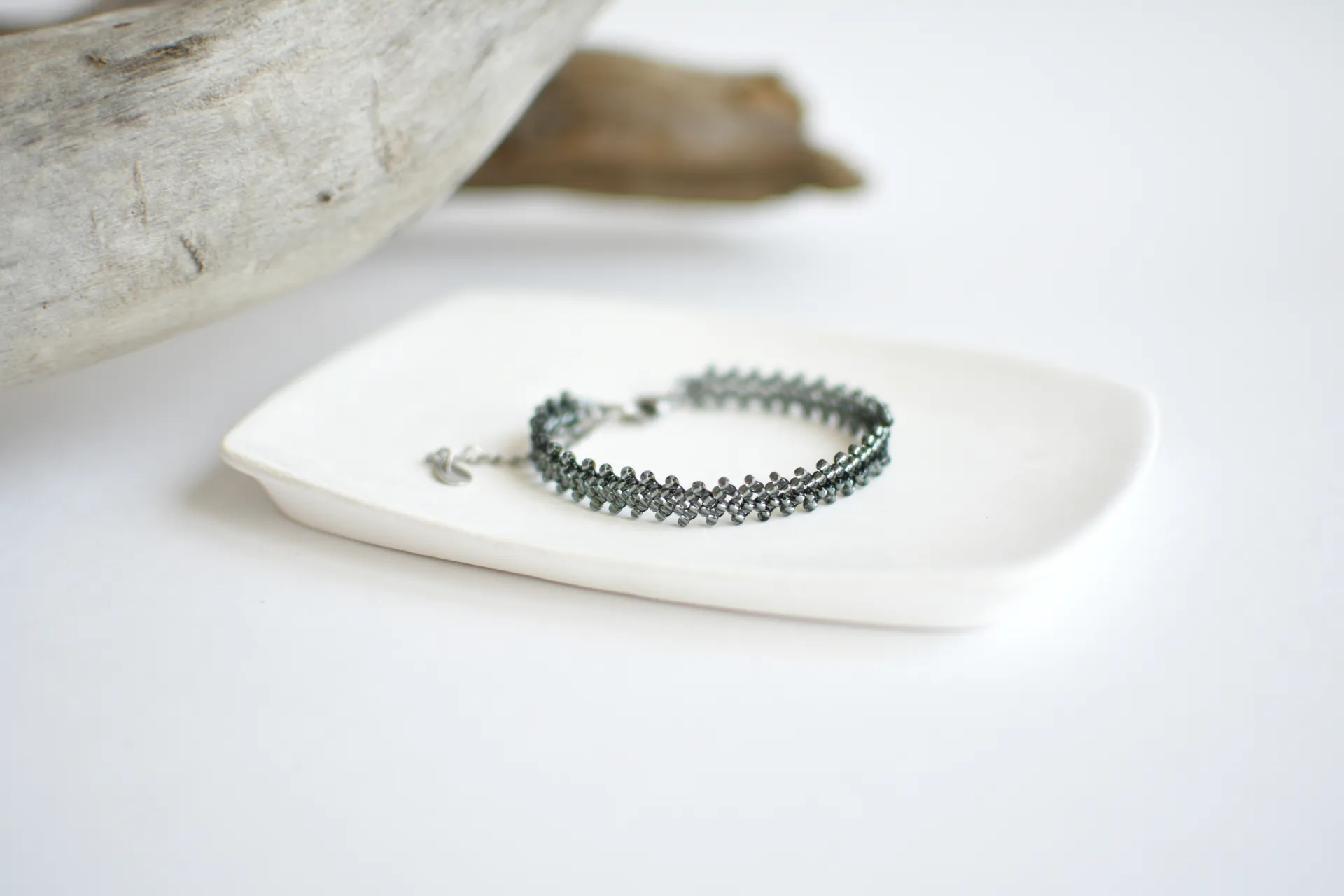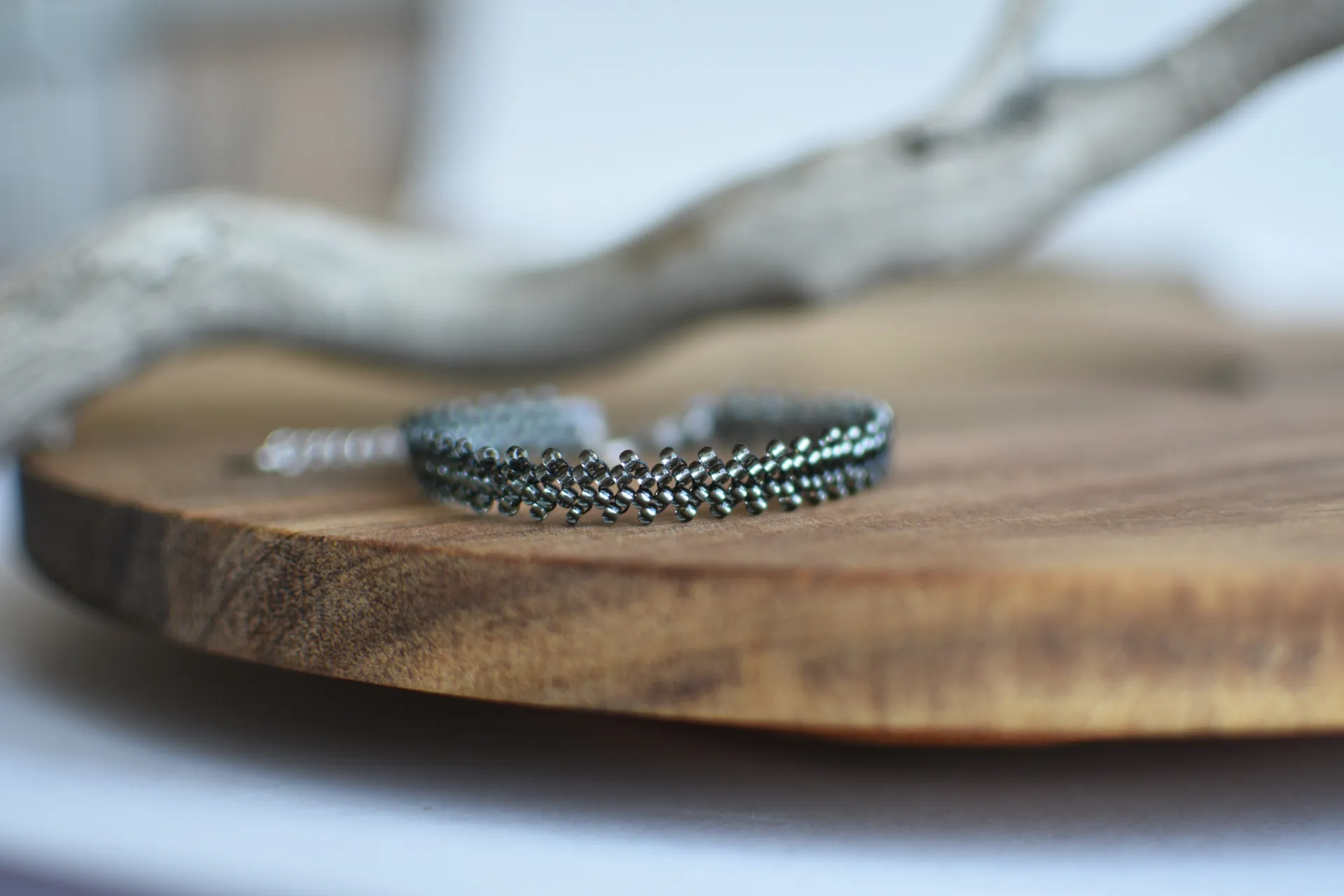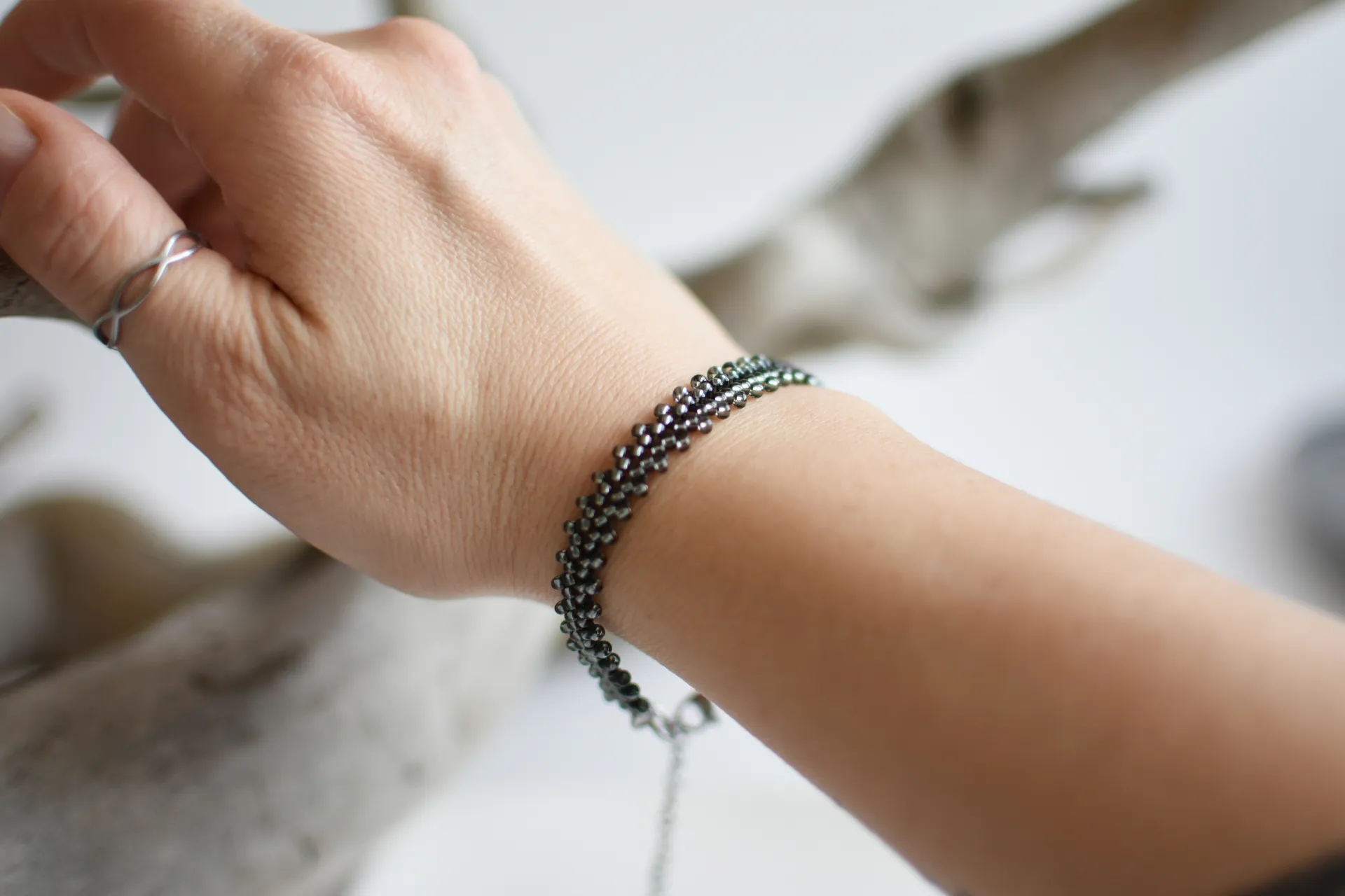 Тонкий плетёный браслет из сверкающего серого бисера.