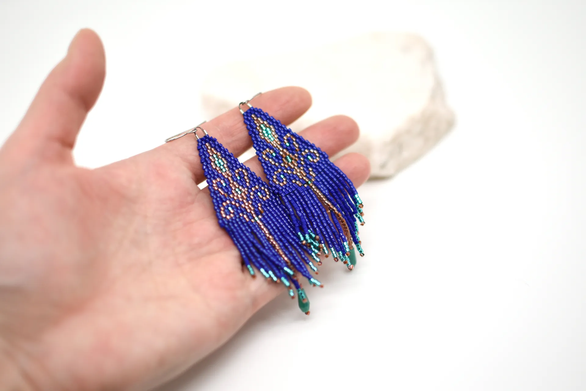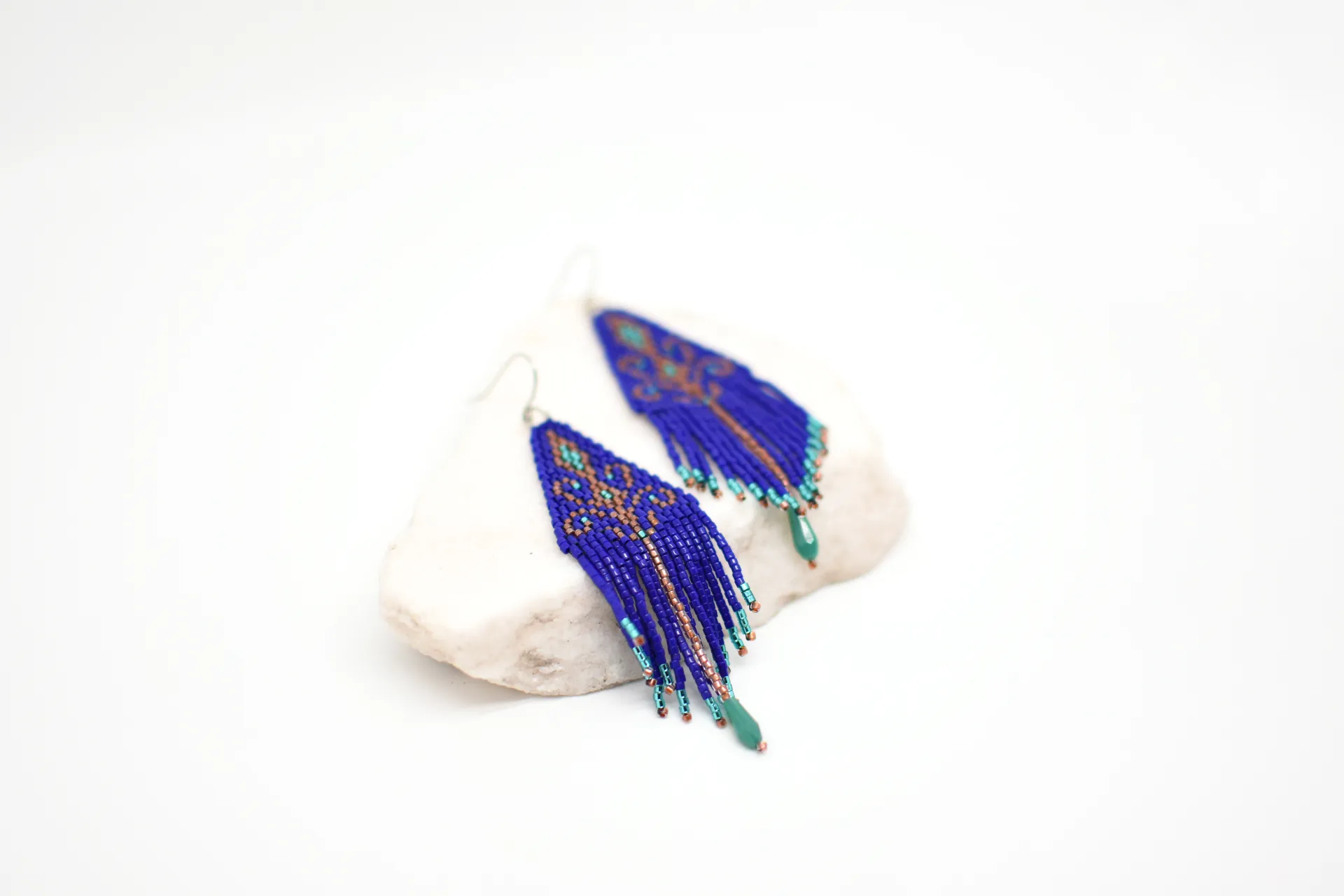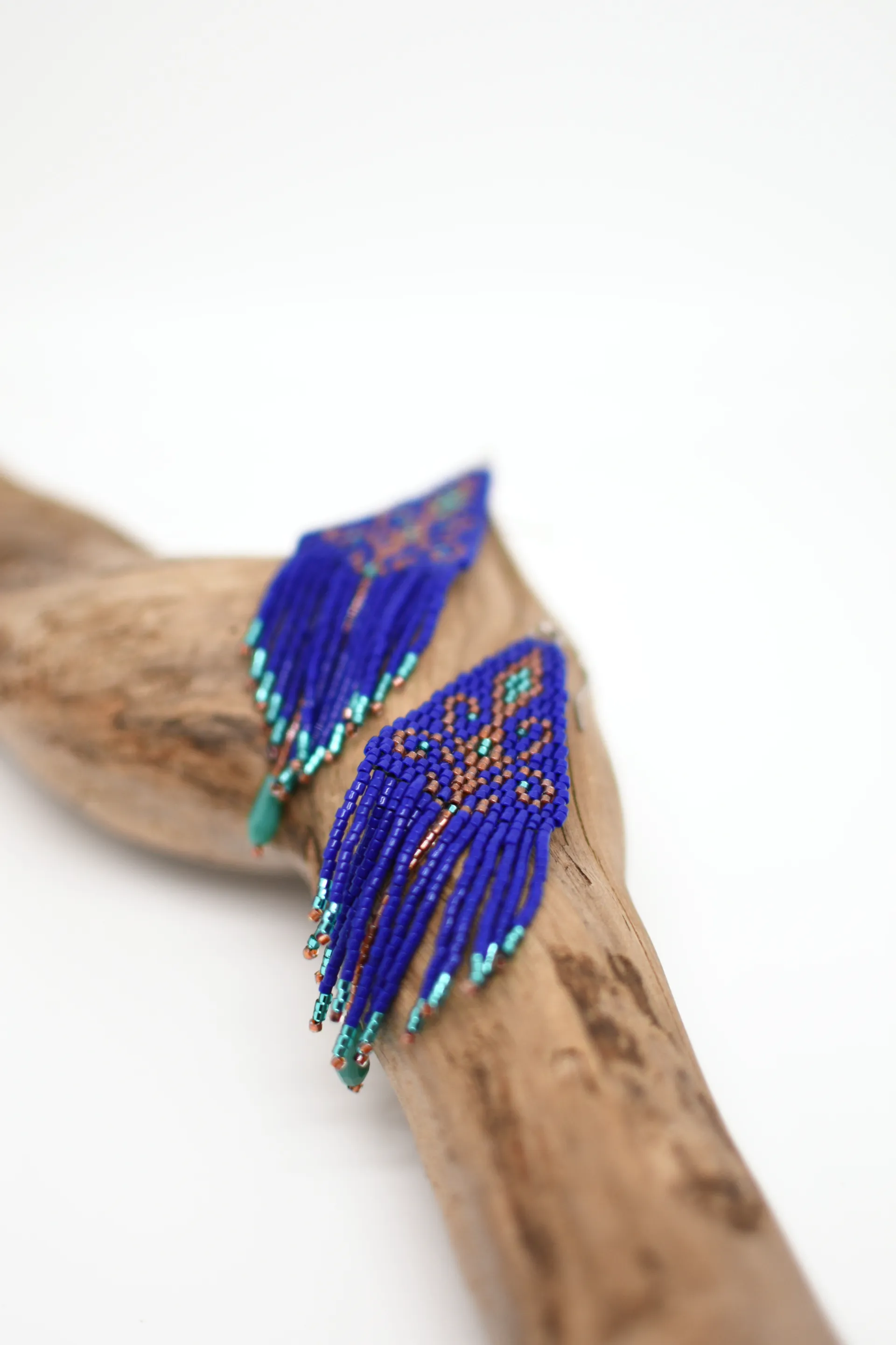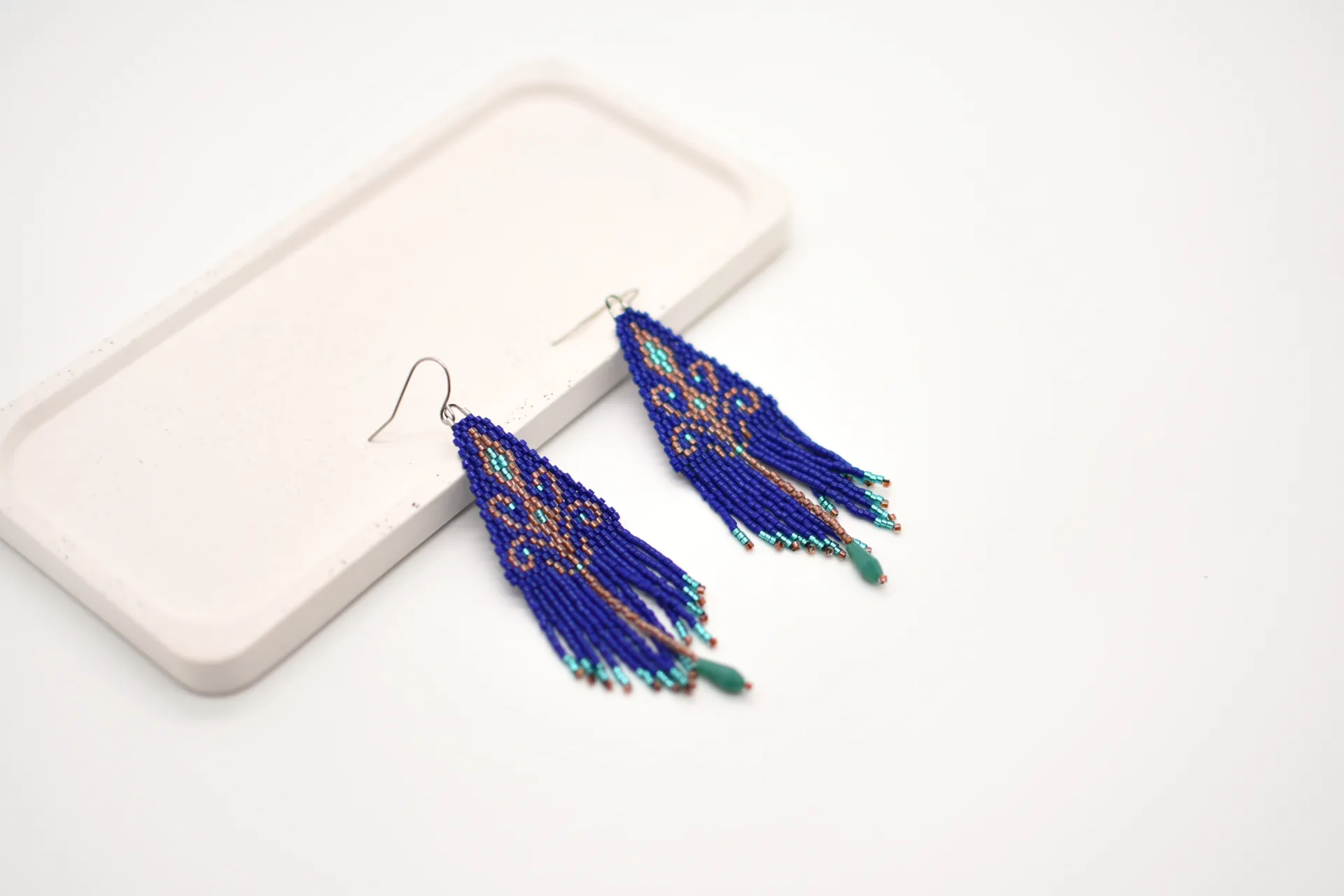 Серьги по авторской схеме в глубоком синем цвете с тонкими деталями и лёгким блеском. Идеальны, чтобы добавить цвет в базовый образ.