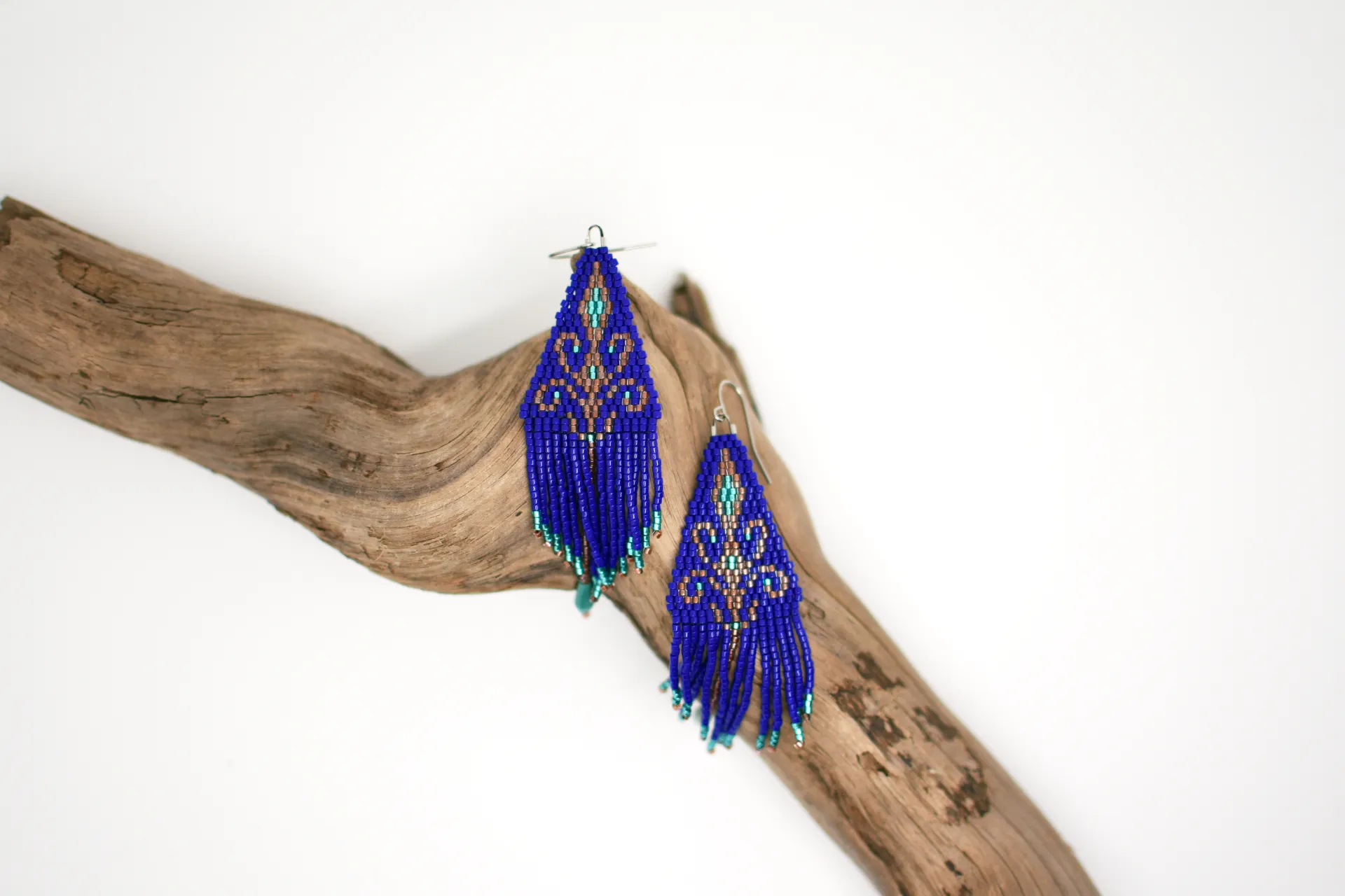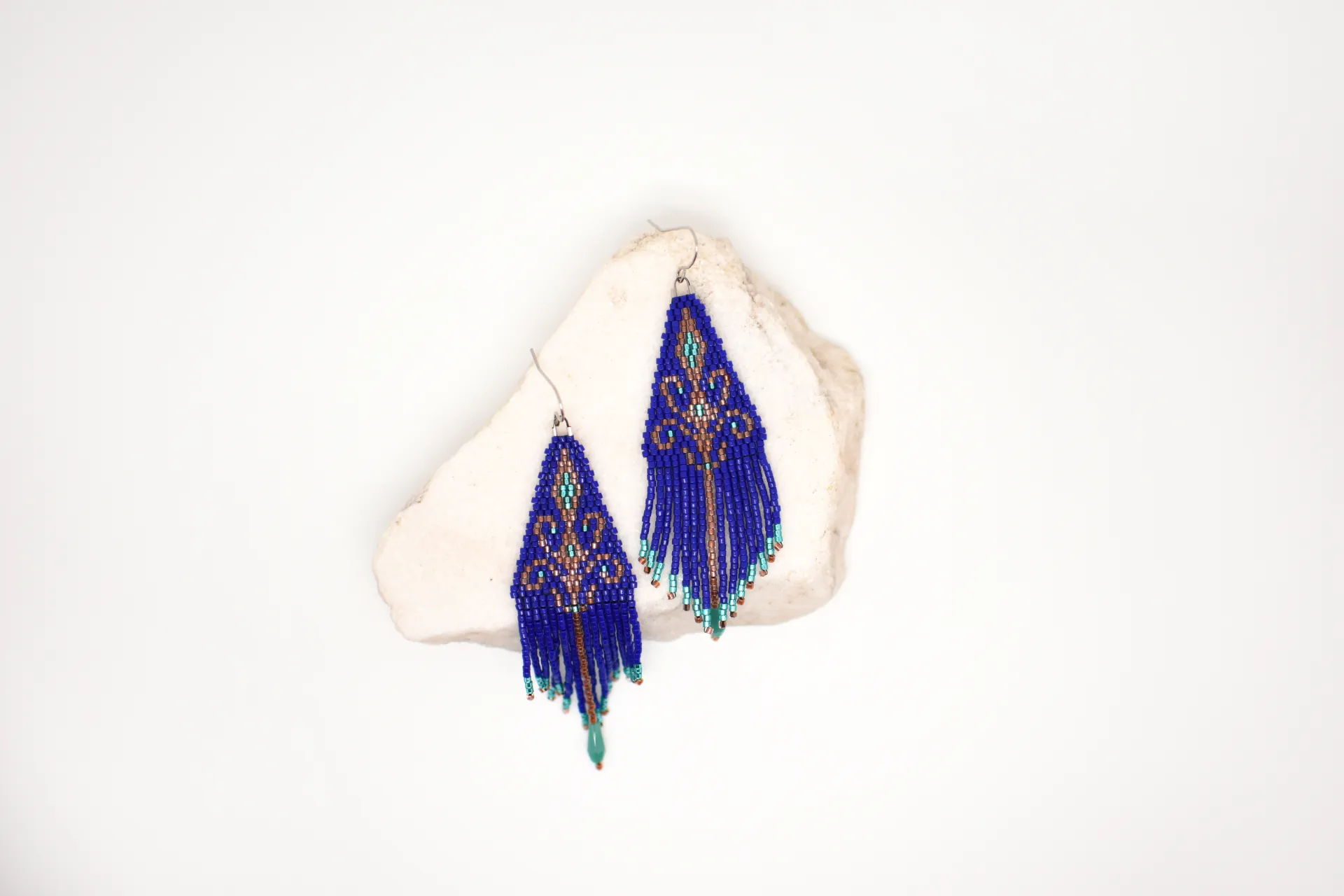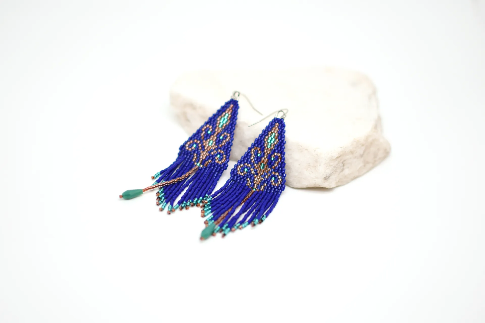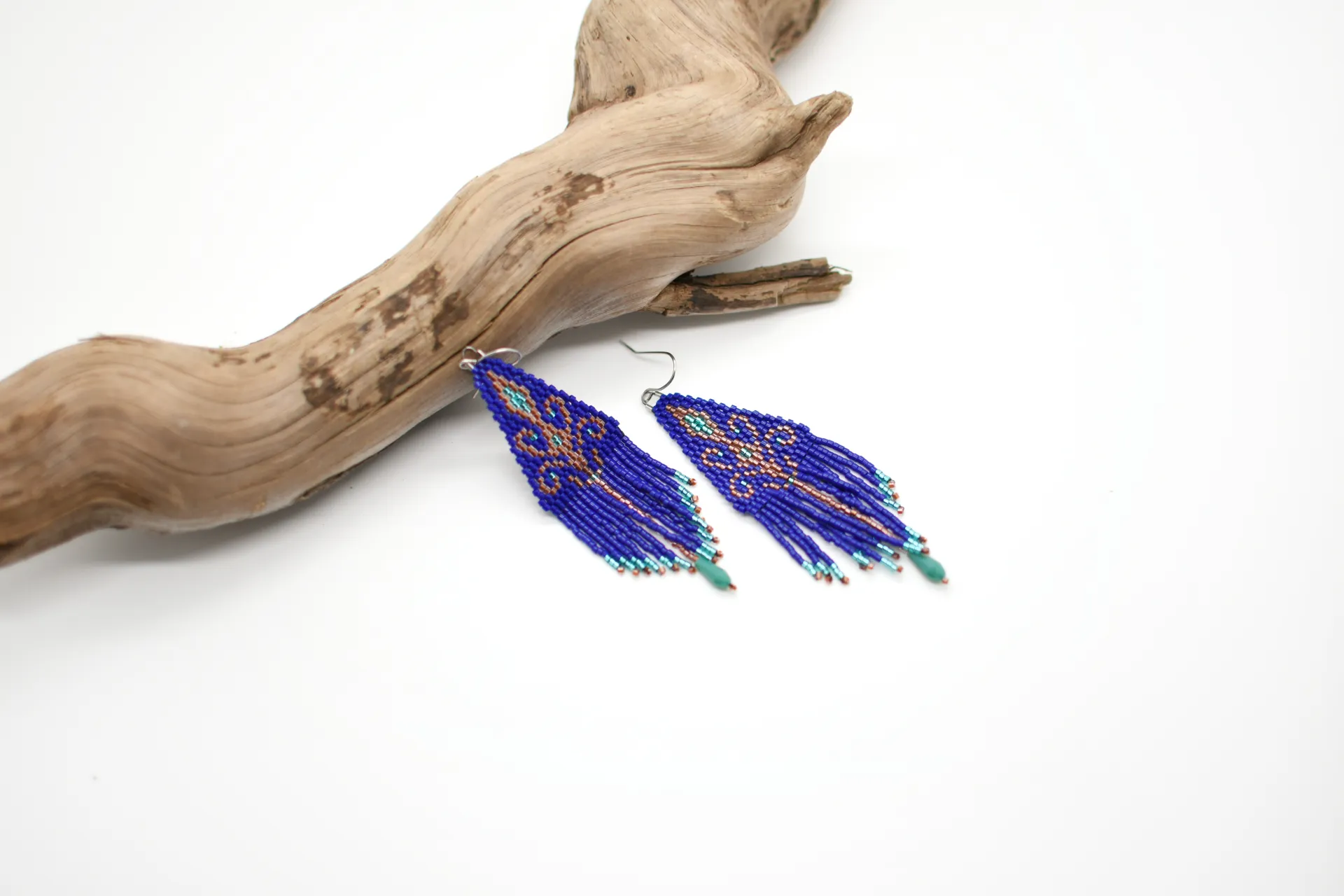 Серьги по авторской схеме в глубоком синем цвете с тонкими деталями и лёгким блеском. Идеальны, чтобы добавить цвет в базовый образ.