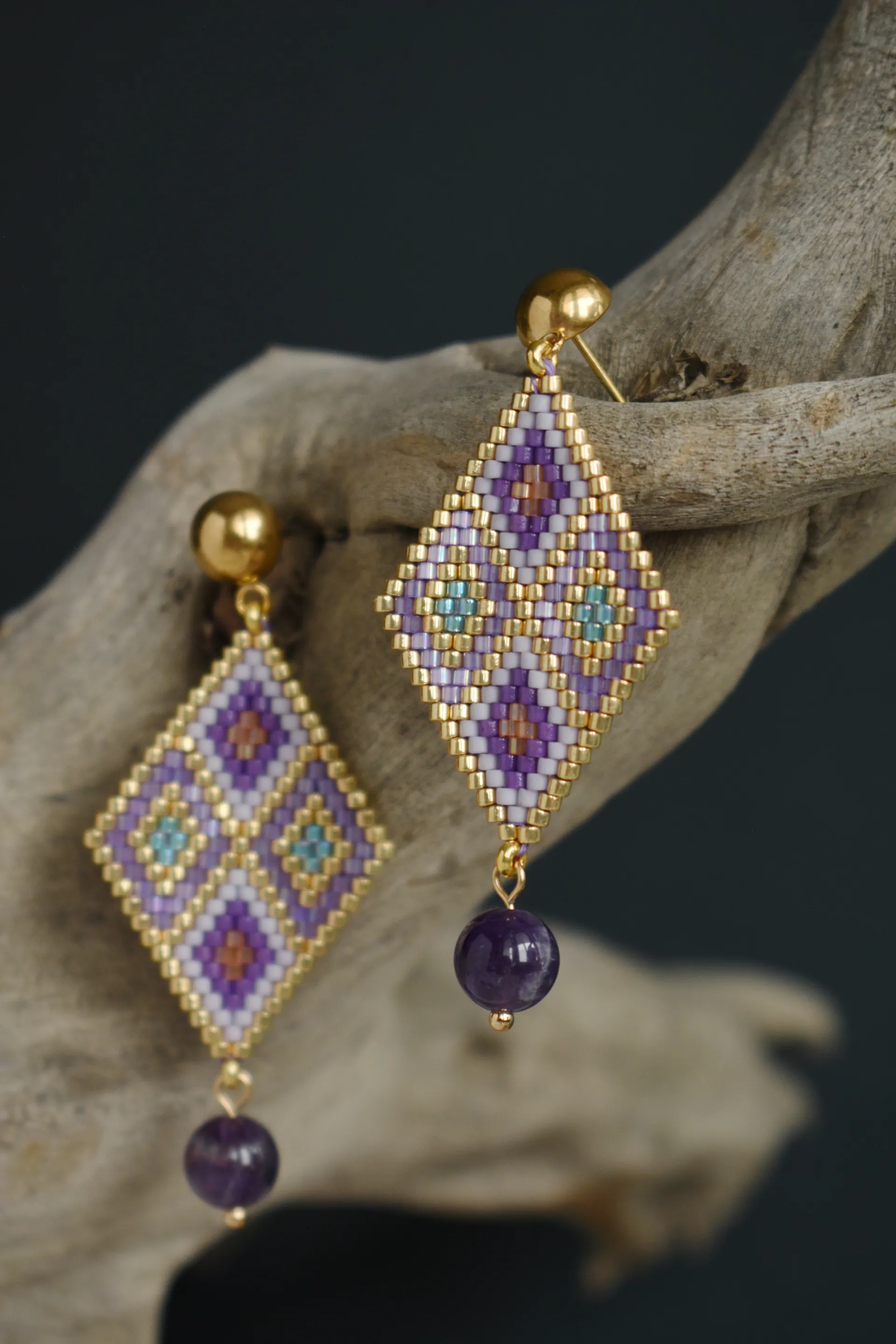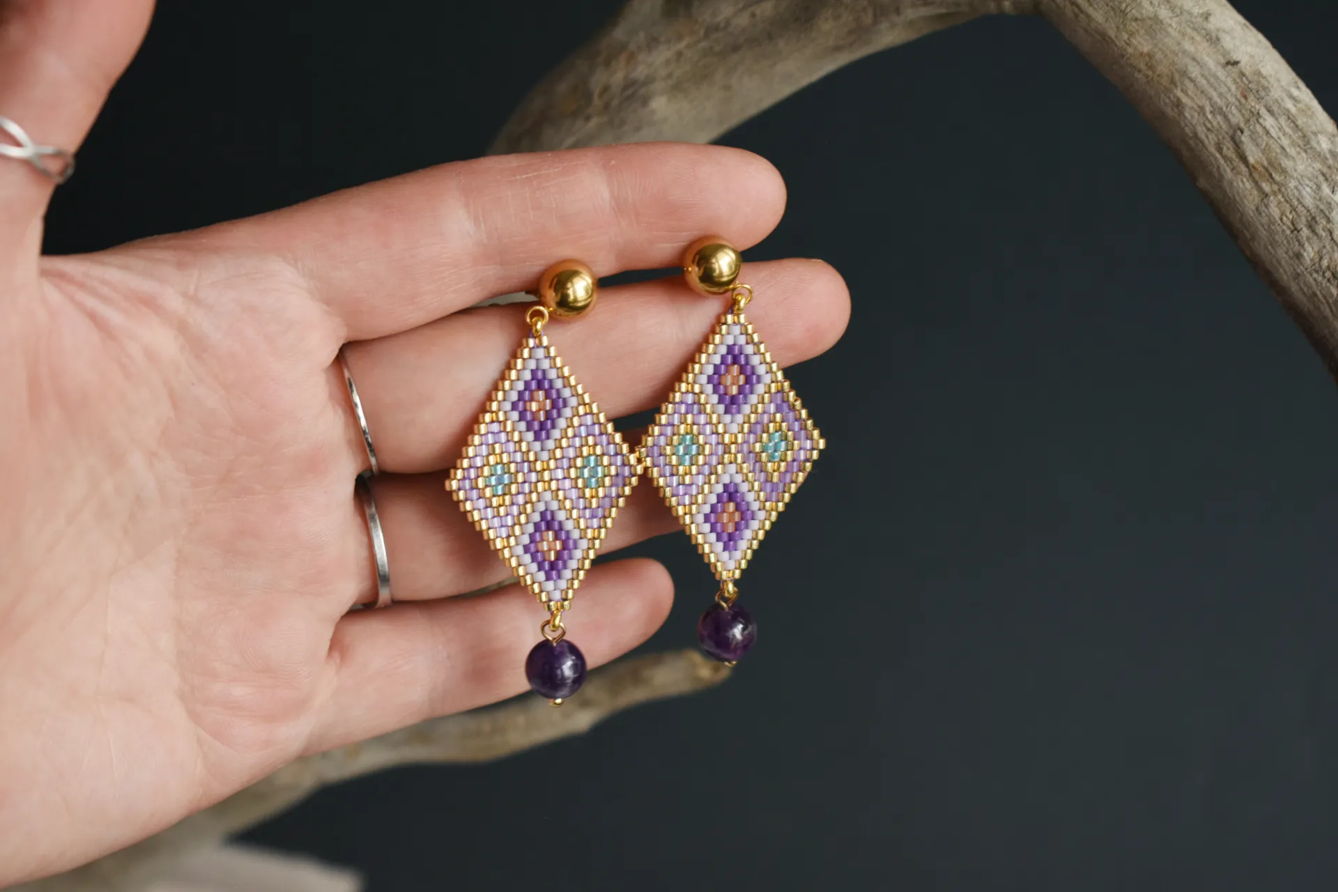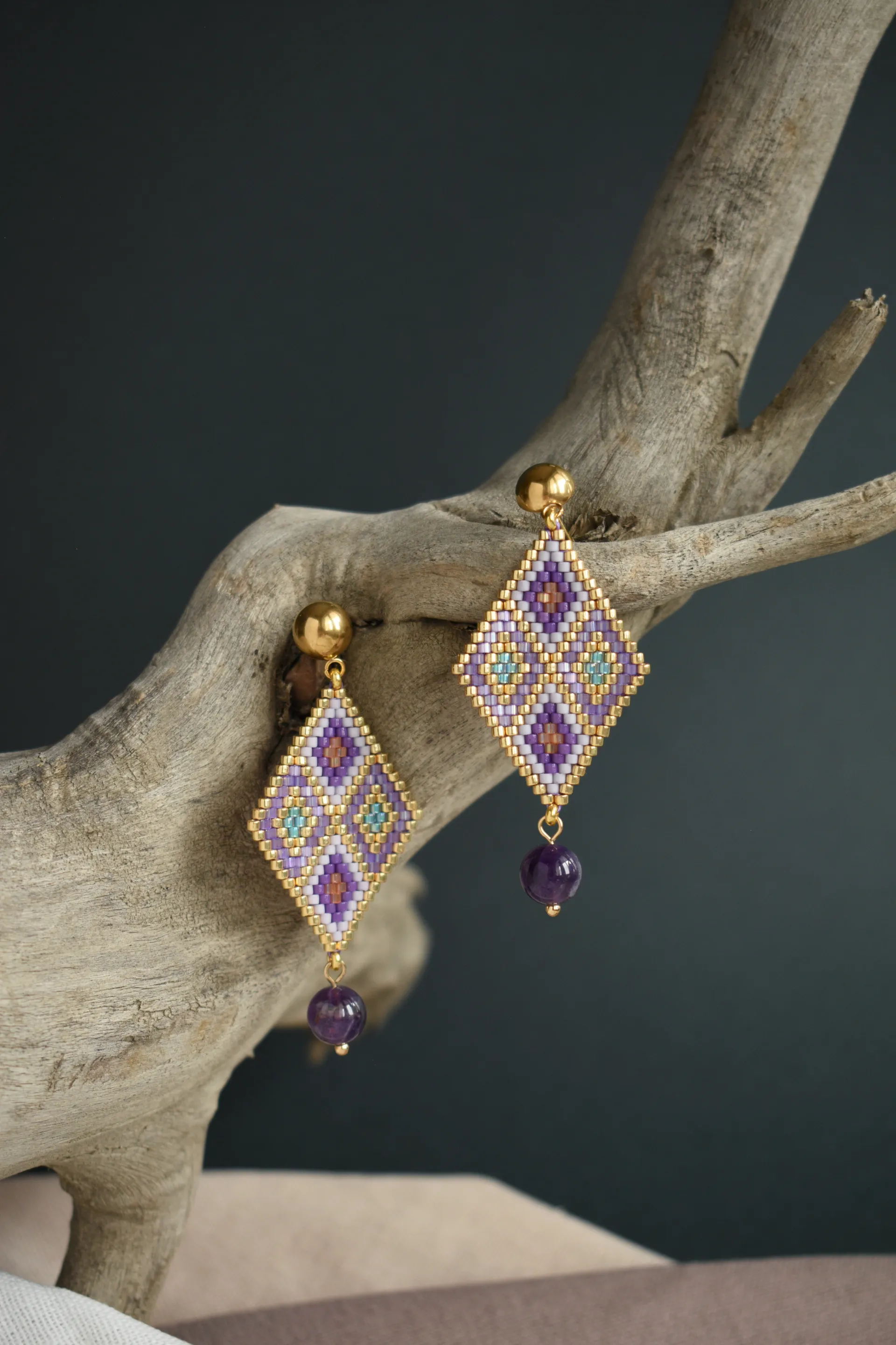 Серьги-гвоздики из сверкающего сиреневого бисера с аметистовыми бусинами - элегантное украшение, которое добавит яркости вашему образу. Легкие и стильные, они идеально подойдут для повседневного ношения или особых случаев.