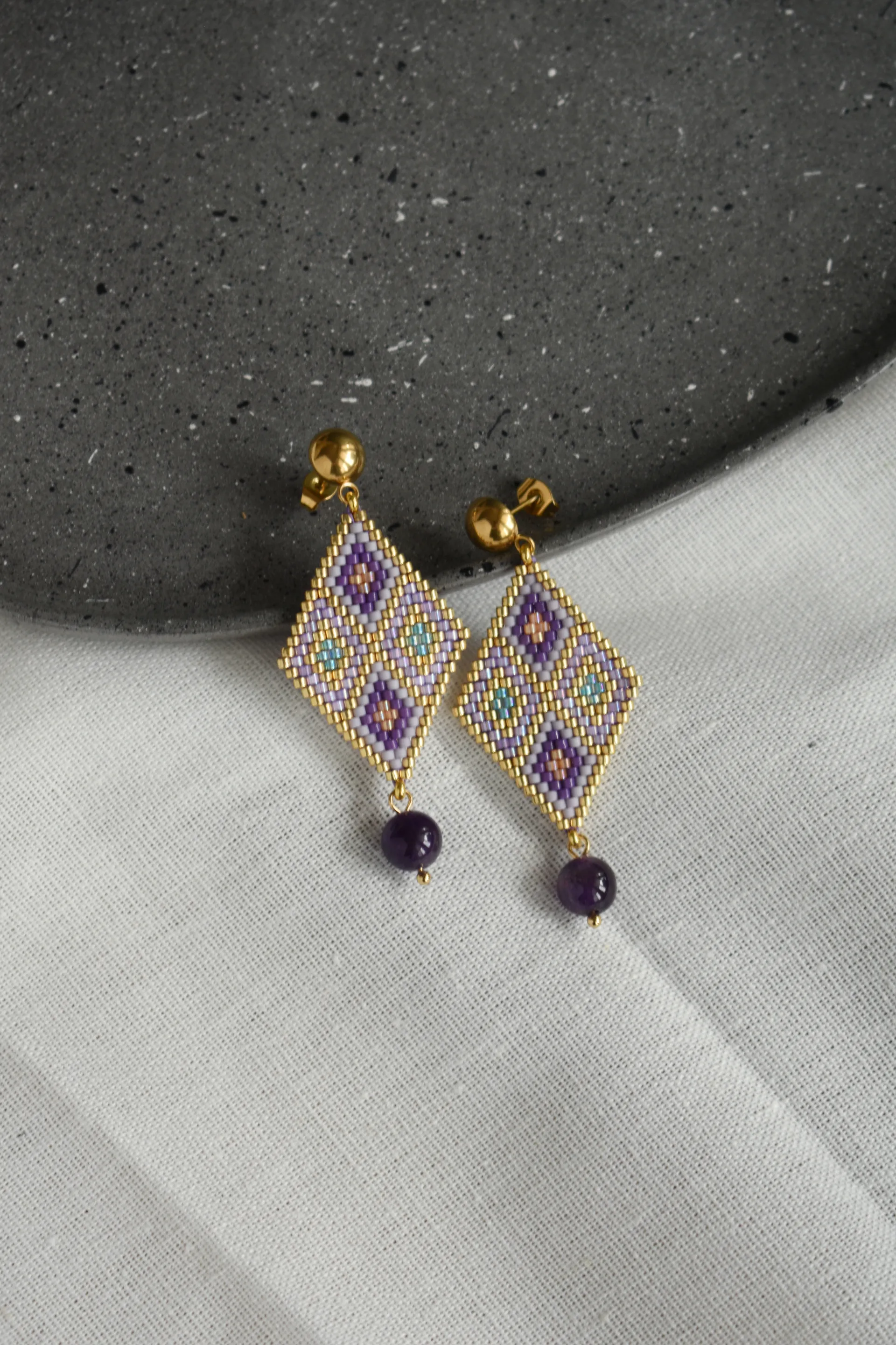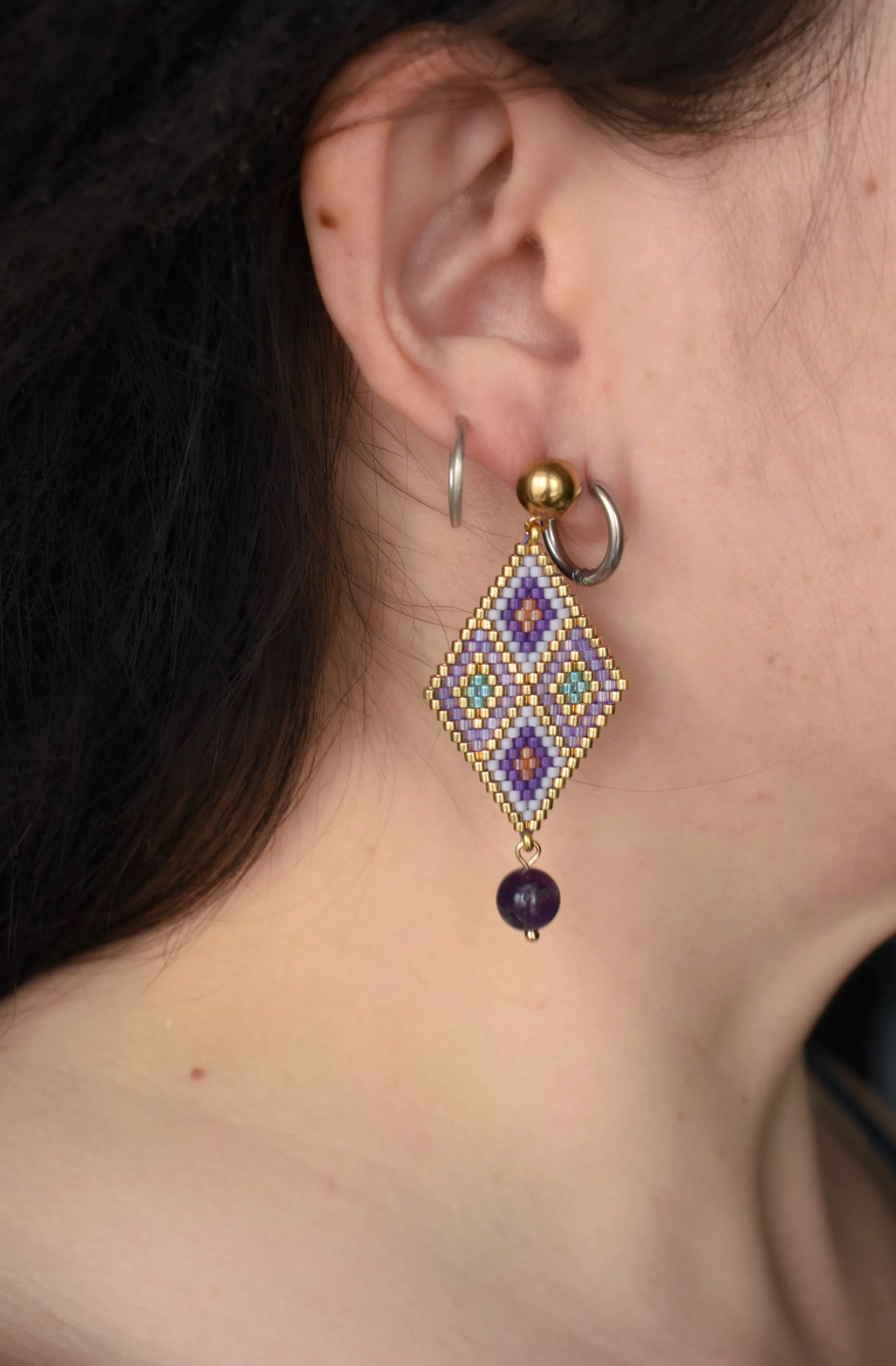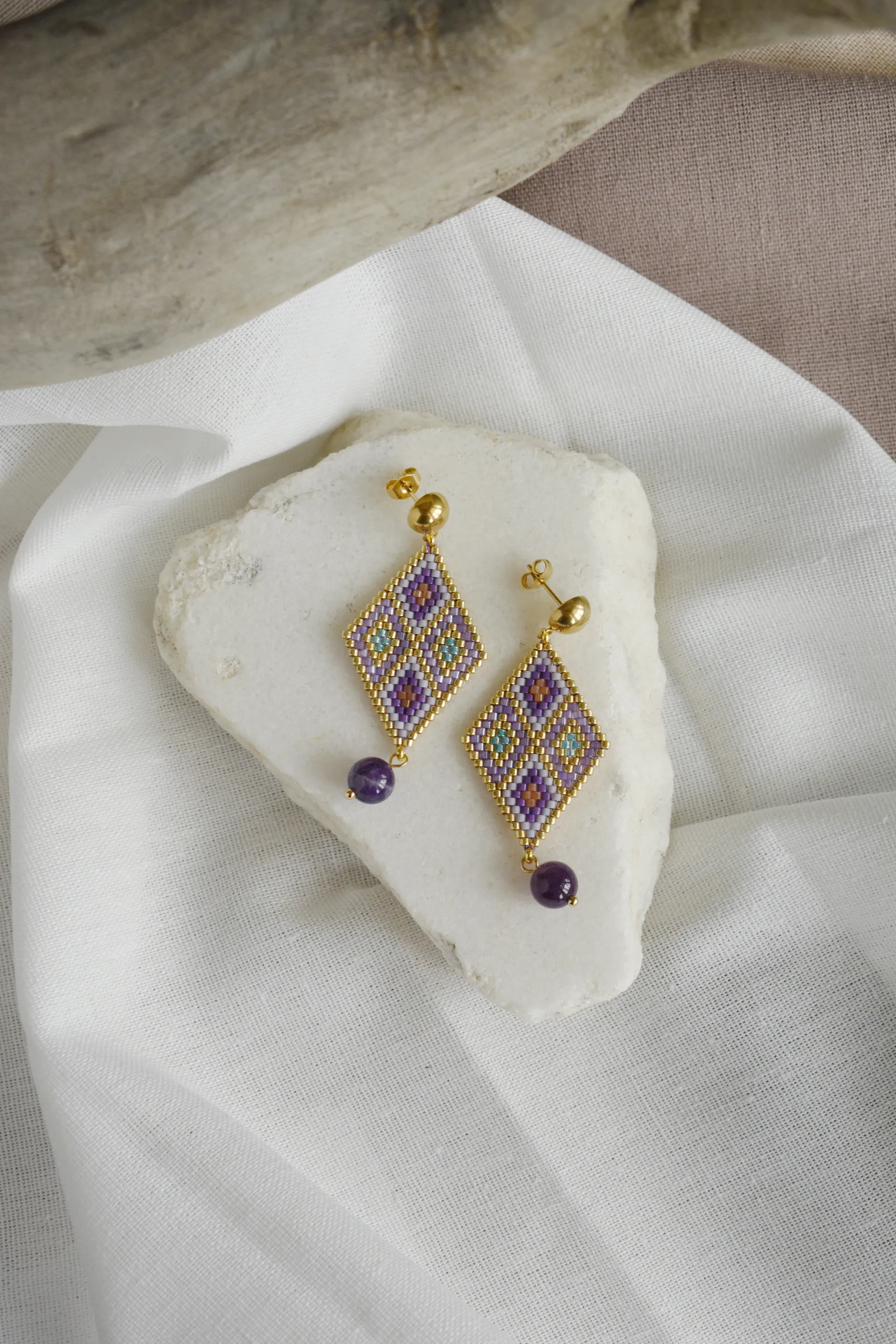 Серьги-гвоздики из сверкающего сиреневого бисера с аметистовыми бусинами - элегантное украшение, которое добавит яркости вашему образу. Легкие и стильные, они идеально подойдут для повседневного ношения или особых случаев.