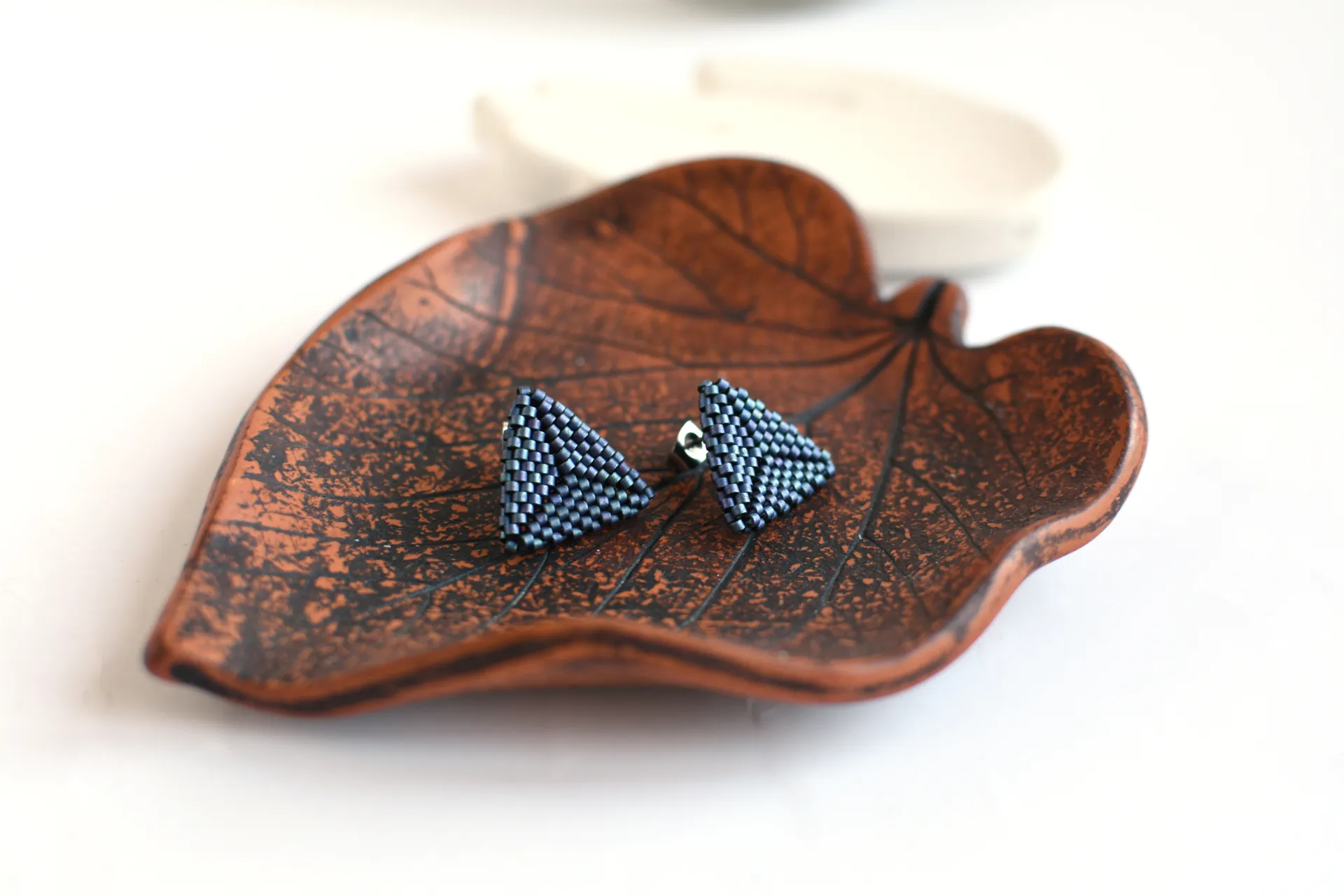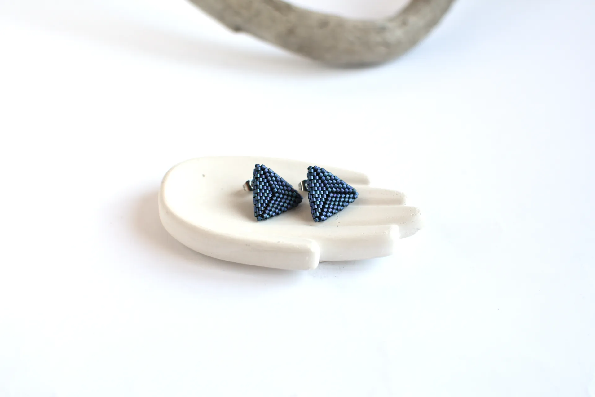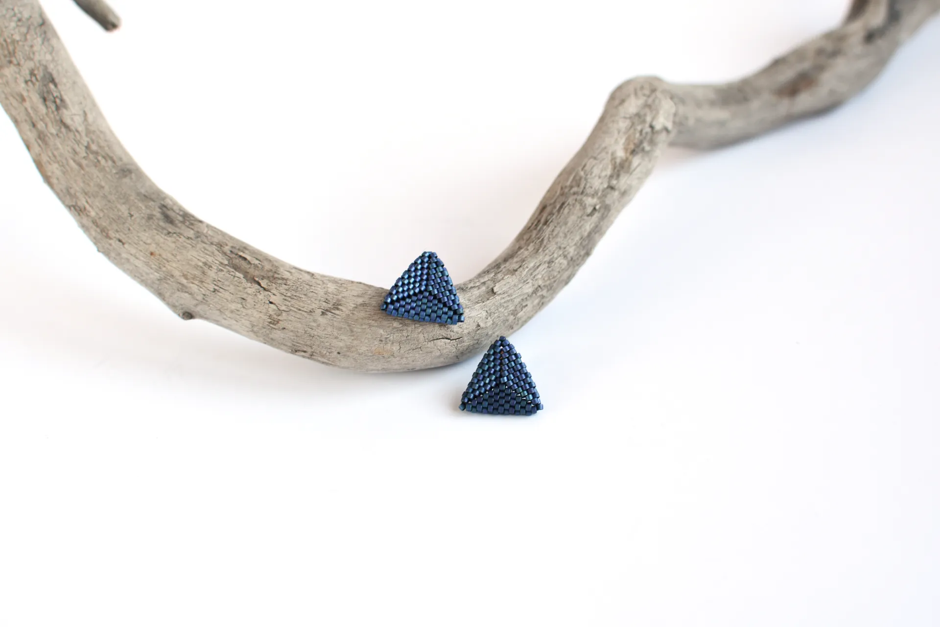 Треугольные пуссеты с гвоздиком в вершине треугольника. Выполнены из матового синего бисера.