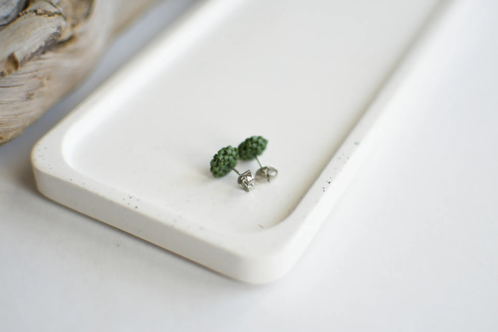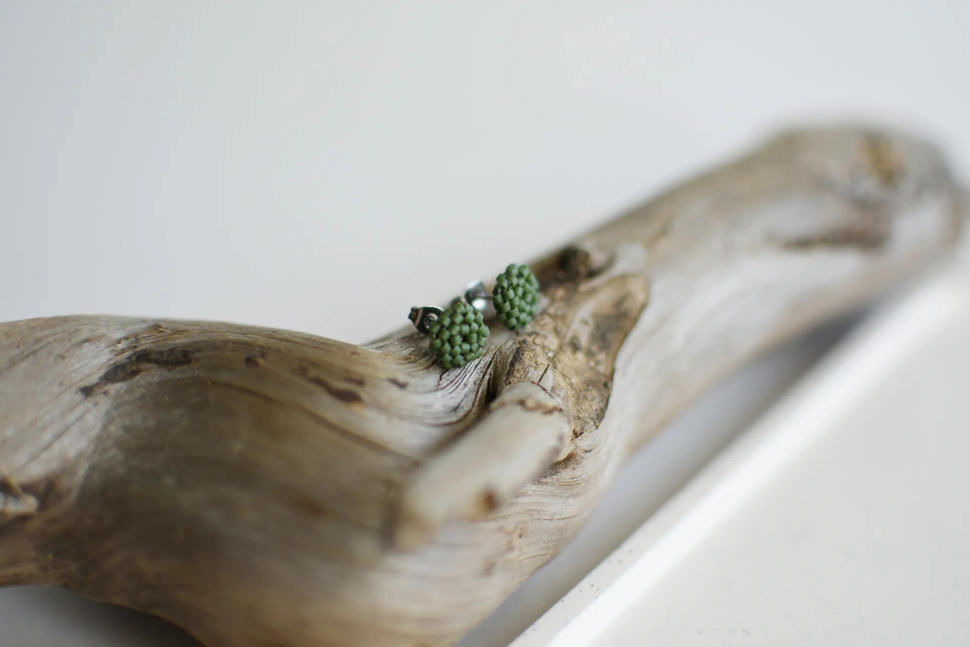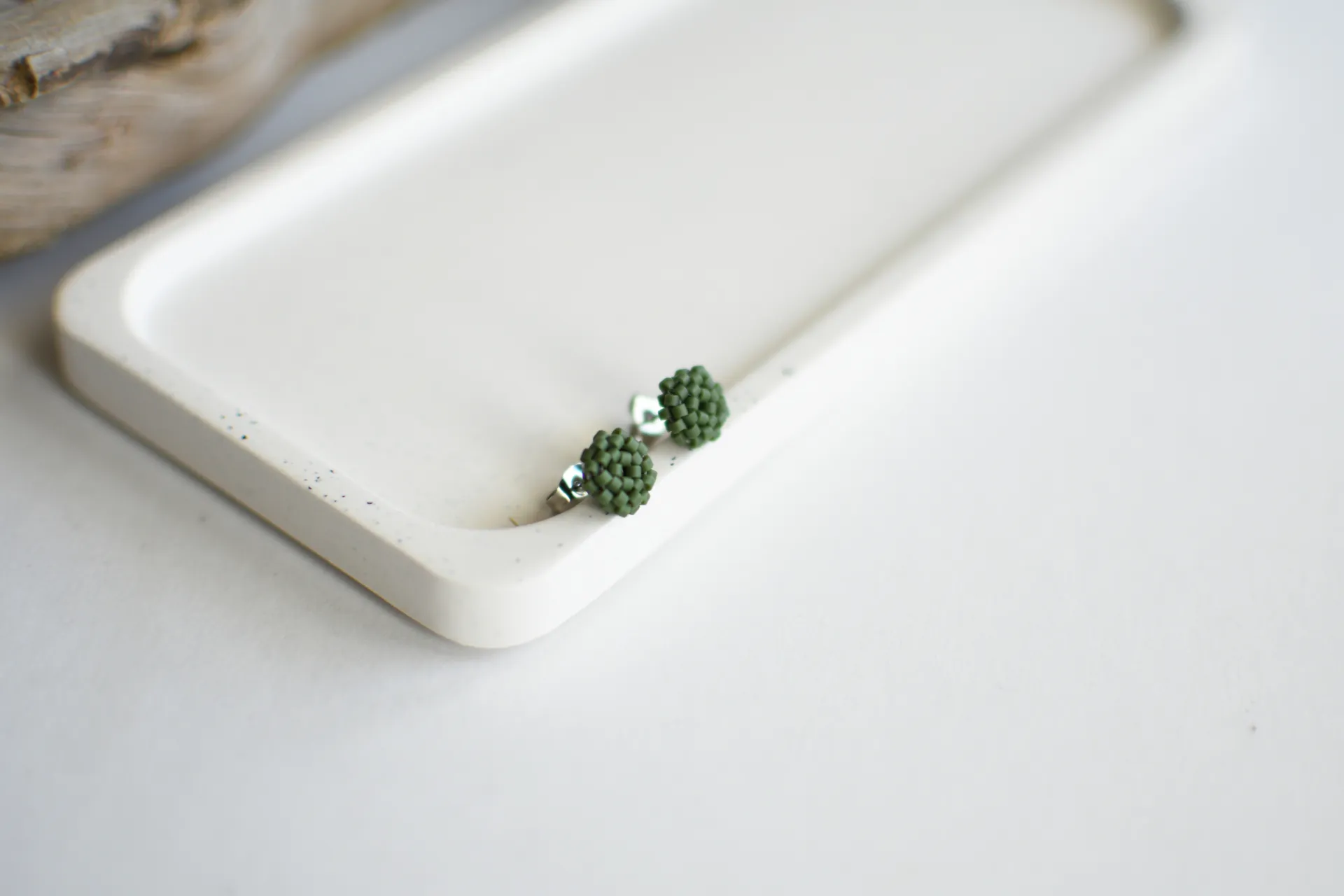 Миниатюрные сеьги пуссеты из матового бисера болотного зелёного цвета.