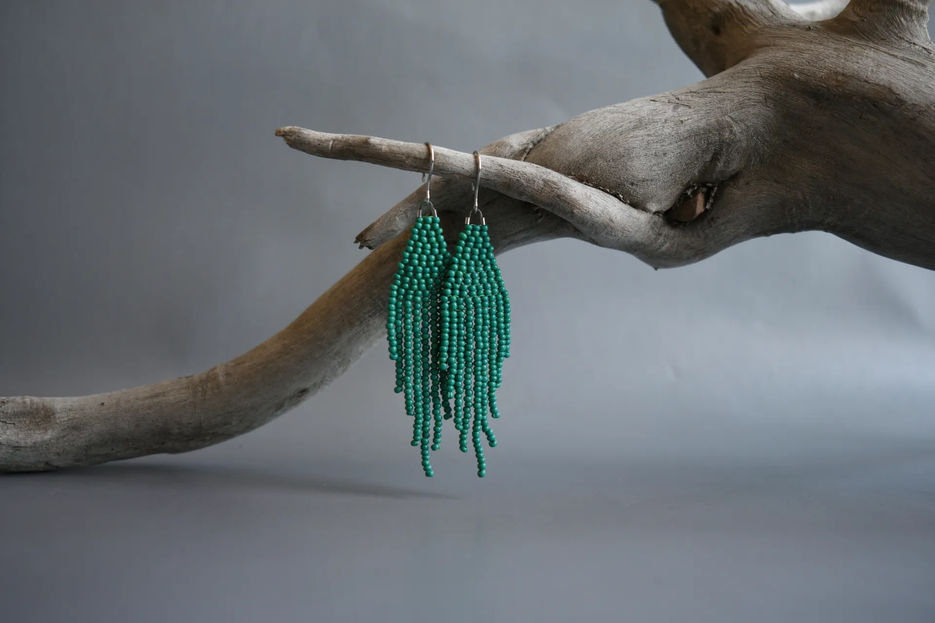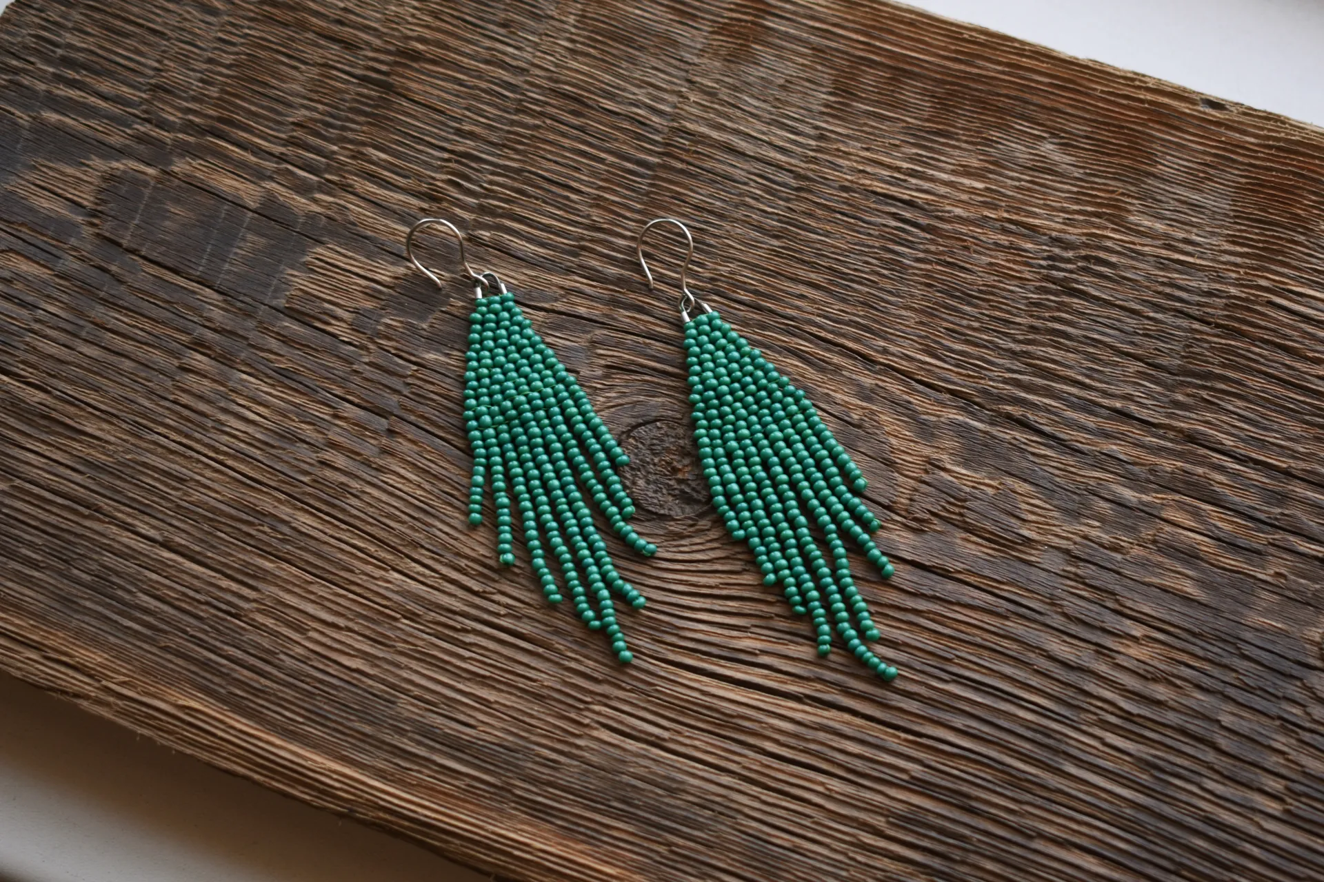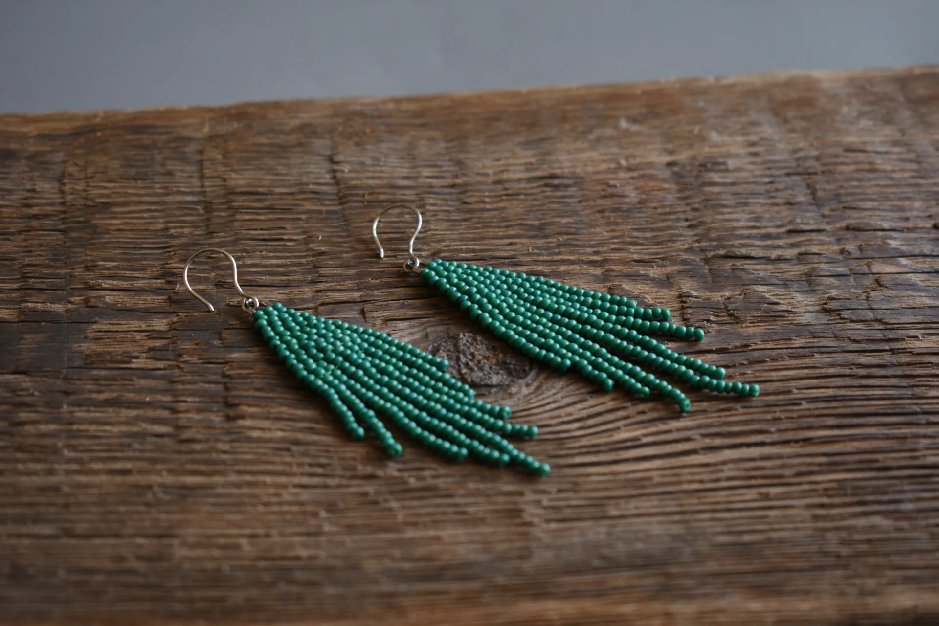 Серьги-кисти из бисера малахитового цвета.