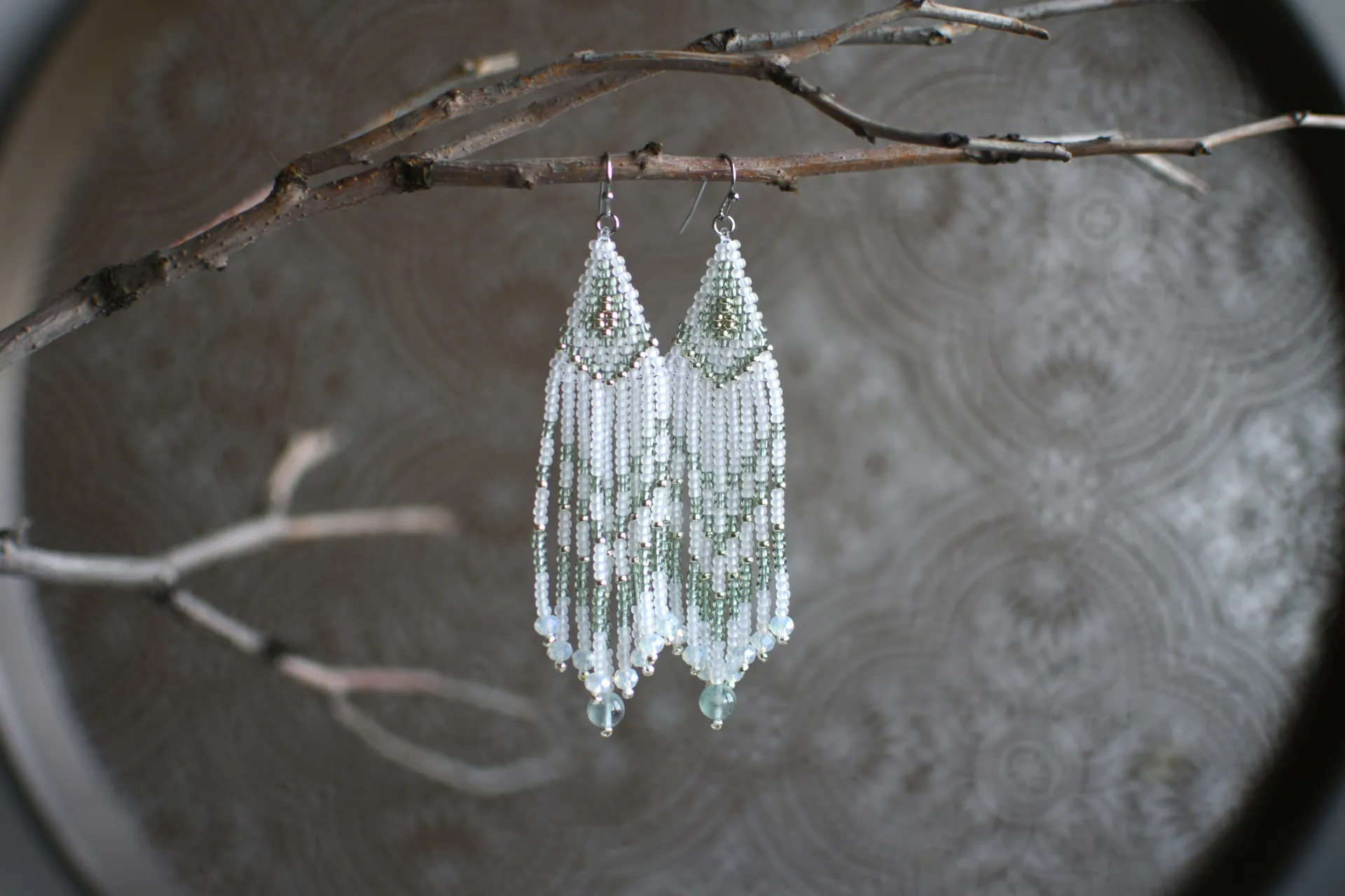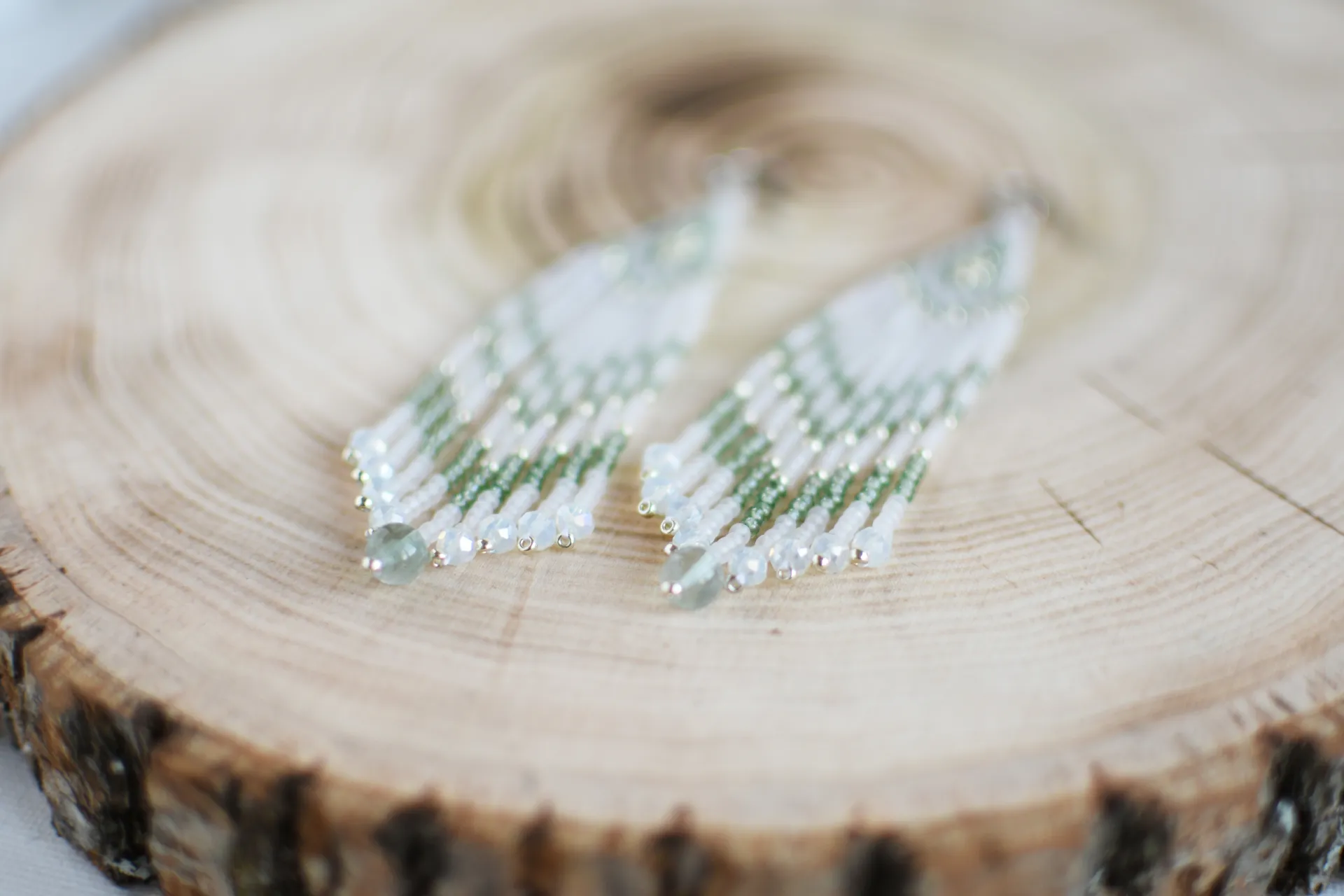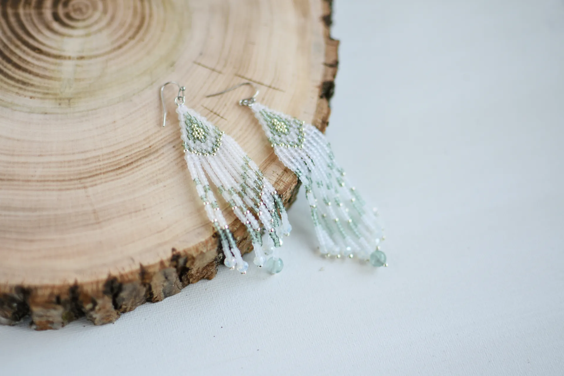 Нежные серьги из полупрозрачного матового и прозрачного хвойного бисера. Бахрома дополнена стеклянными бусинами и бусиной флюорита.