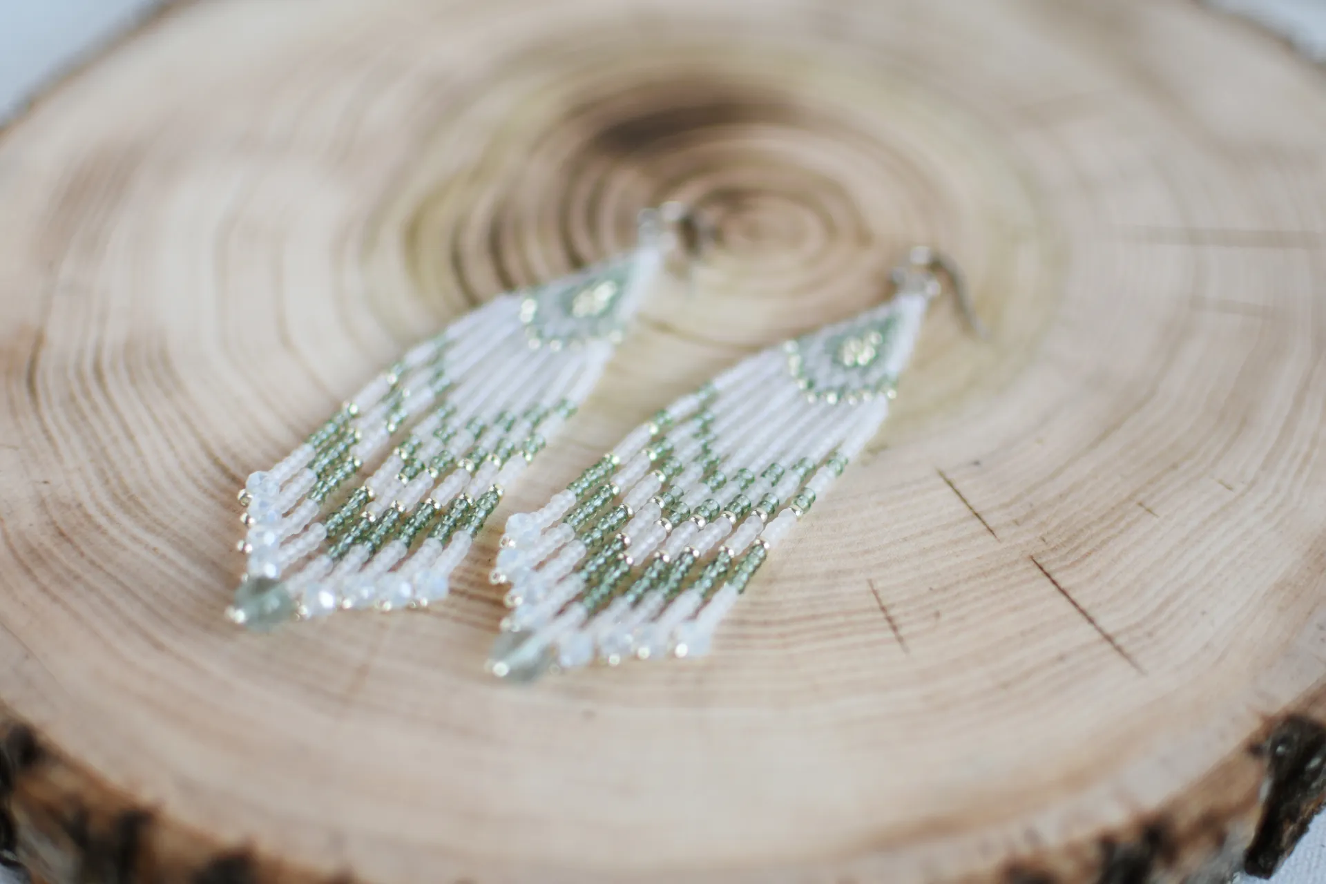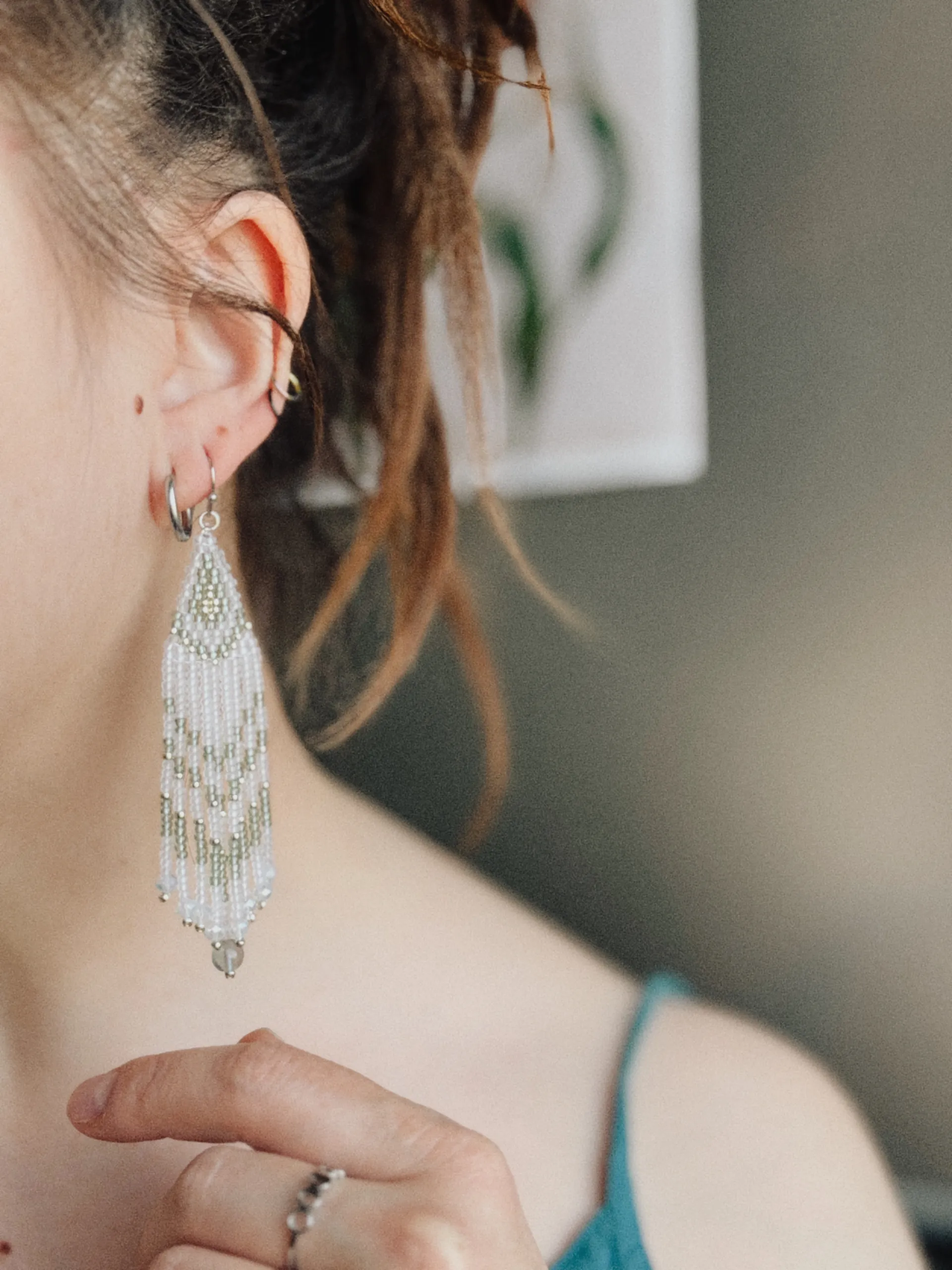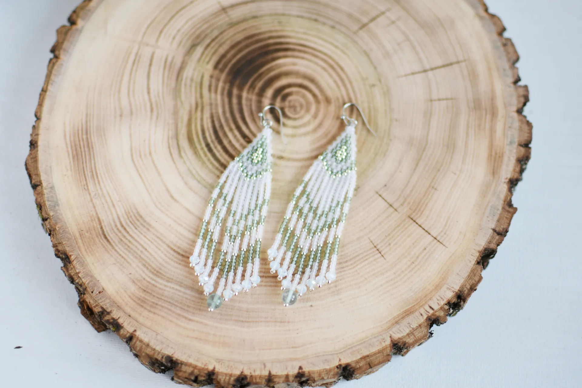 Нежные серьги из полупрозрачного матового и прозрачного хвойного бисера. Бахрома дополнена стеклянными бусинами и бусиной флюорита.
