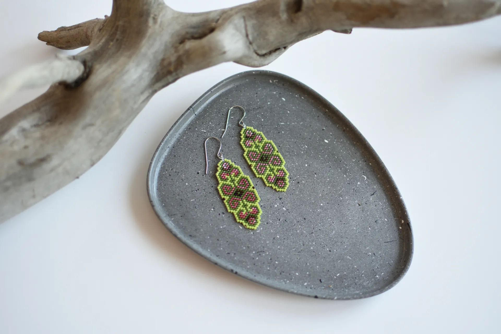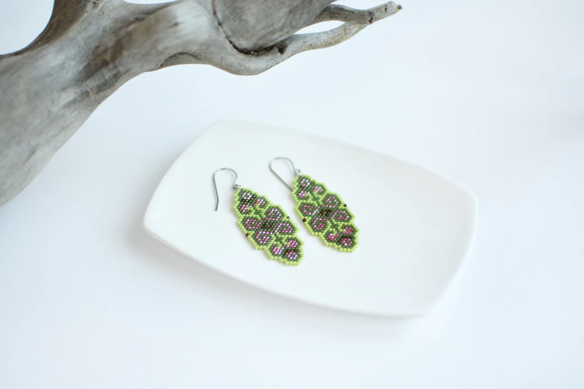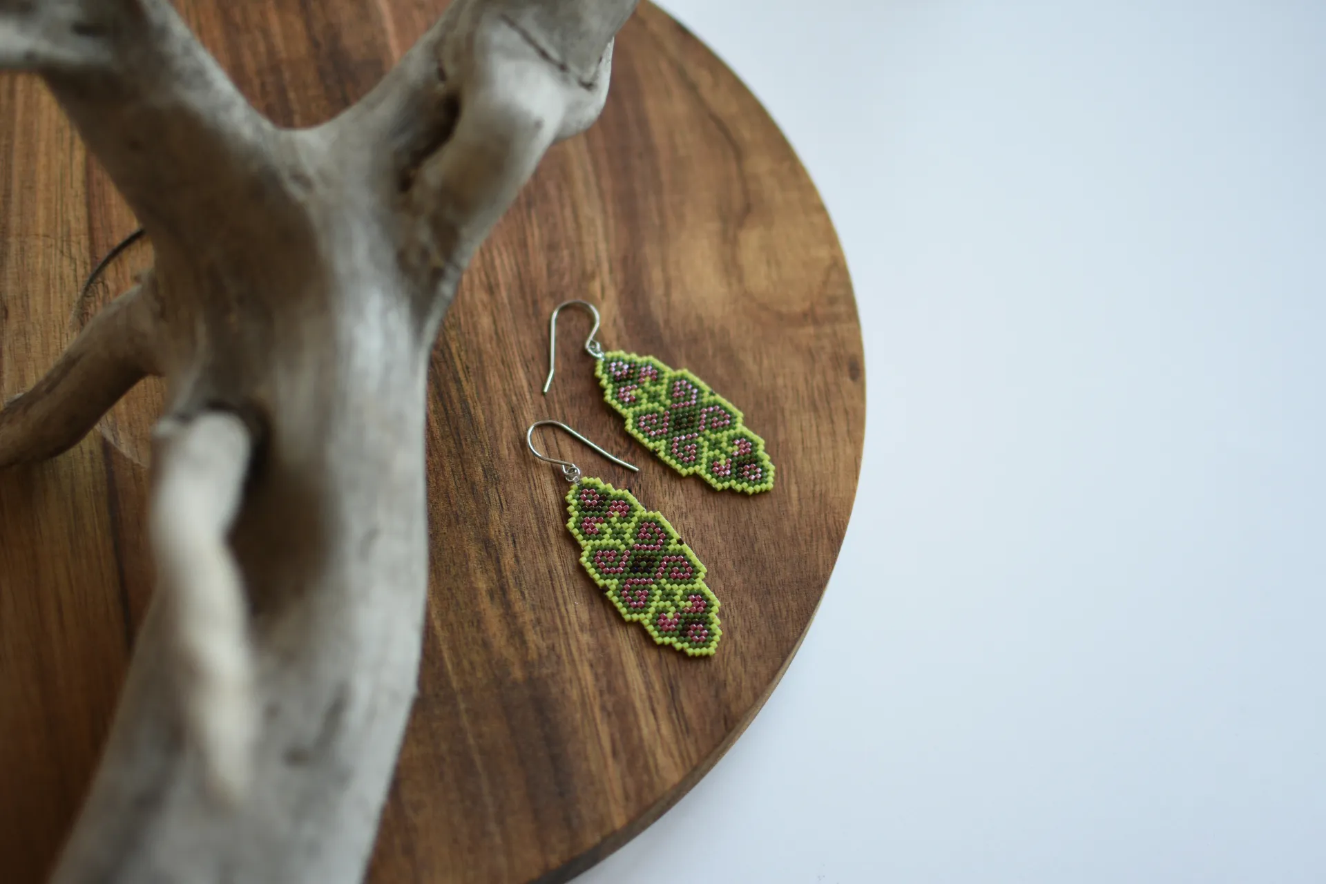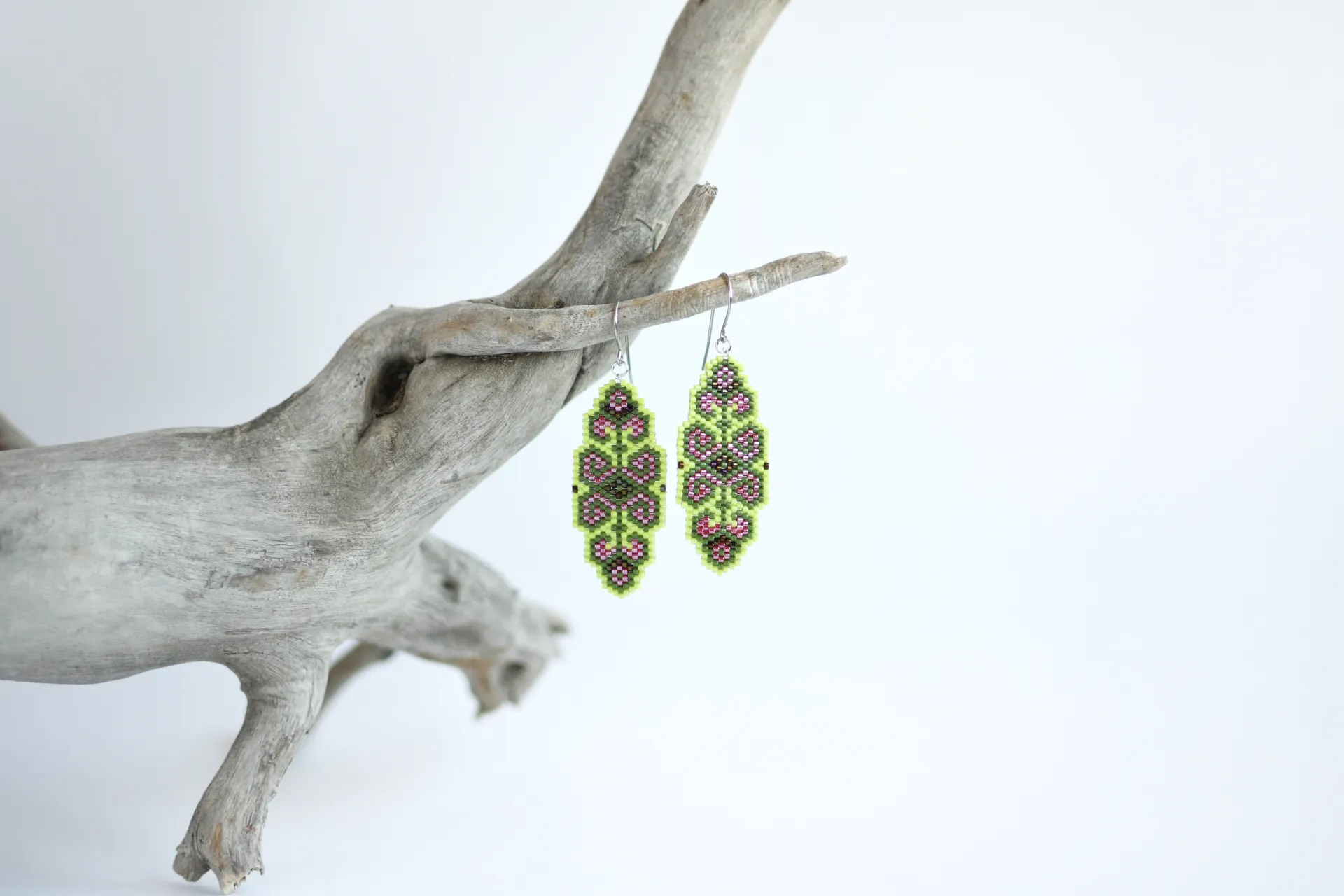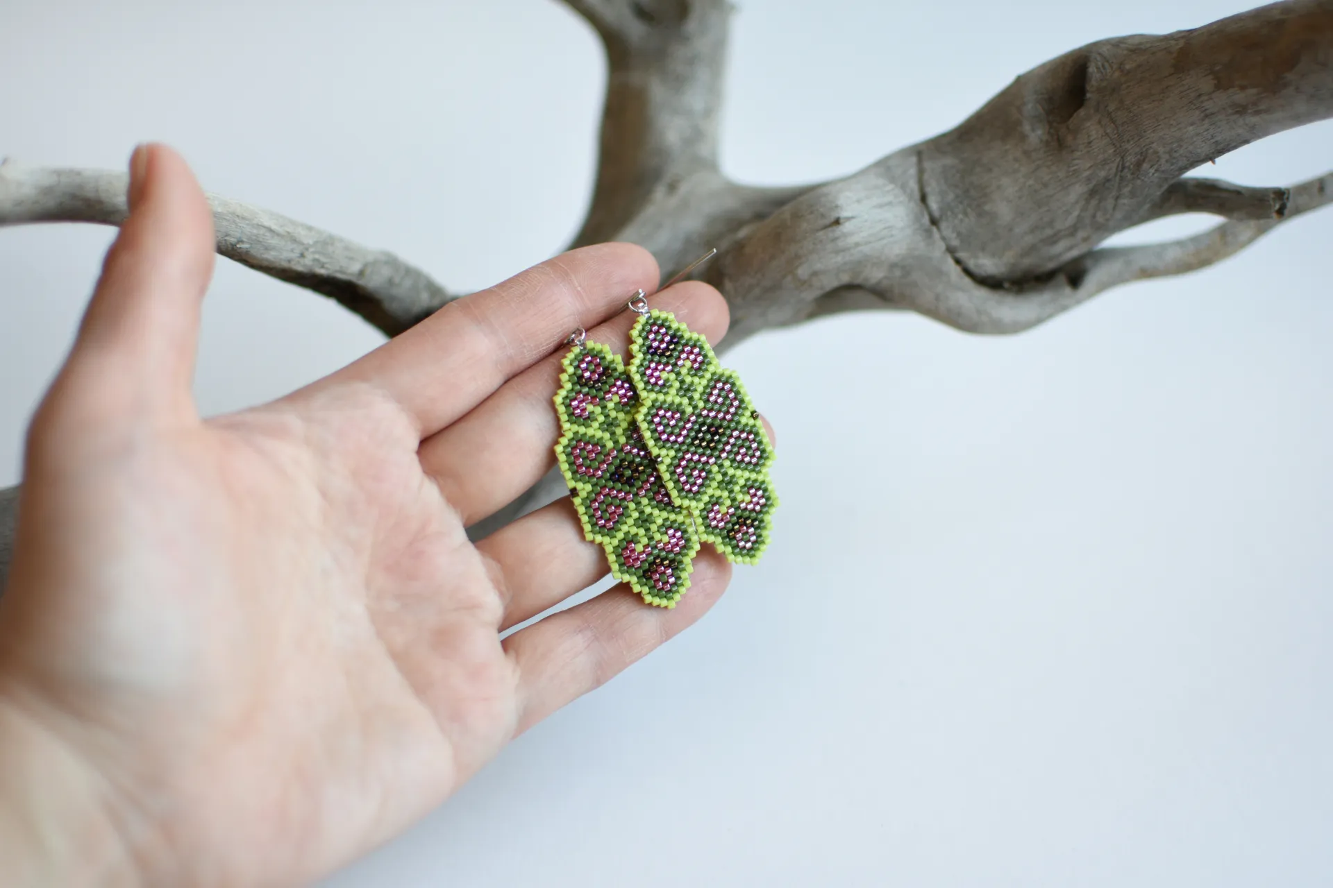 Яркие светло-зелёные серьги с алым орнаментом в восточном стиле.