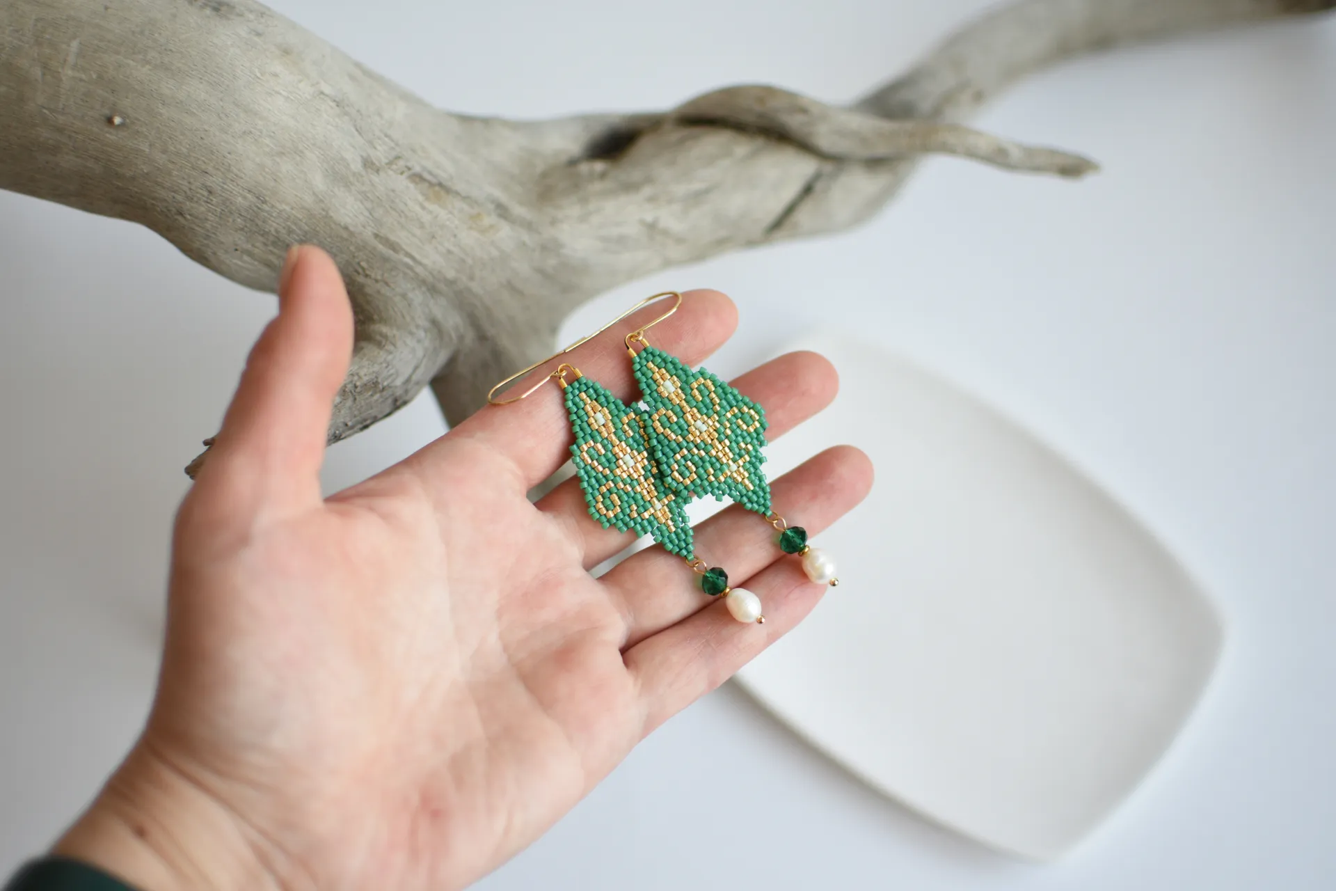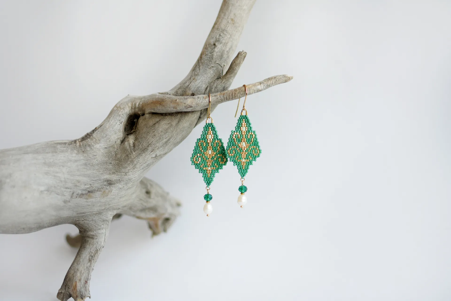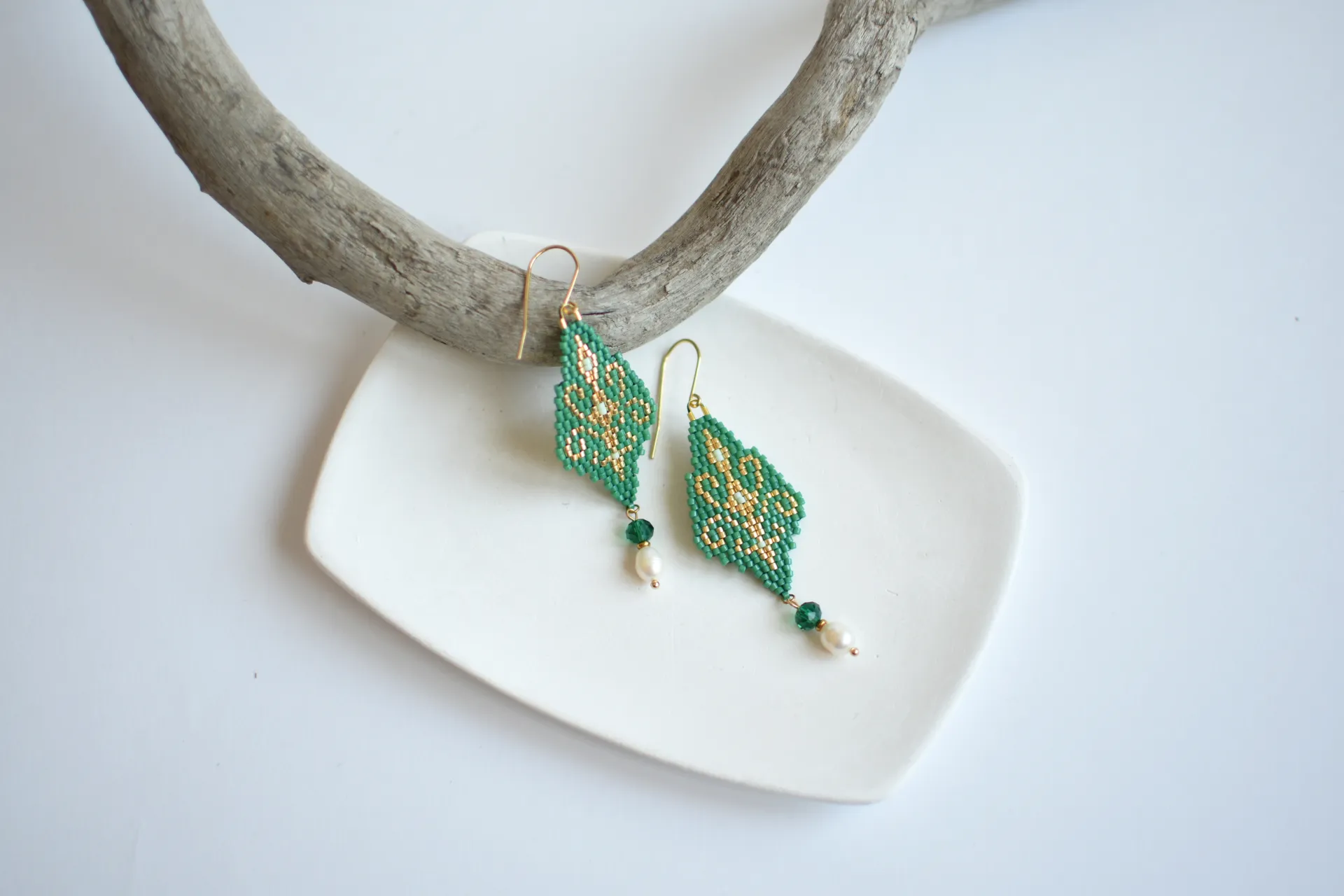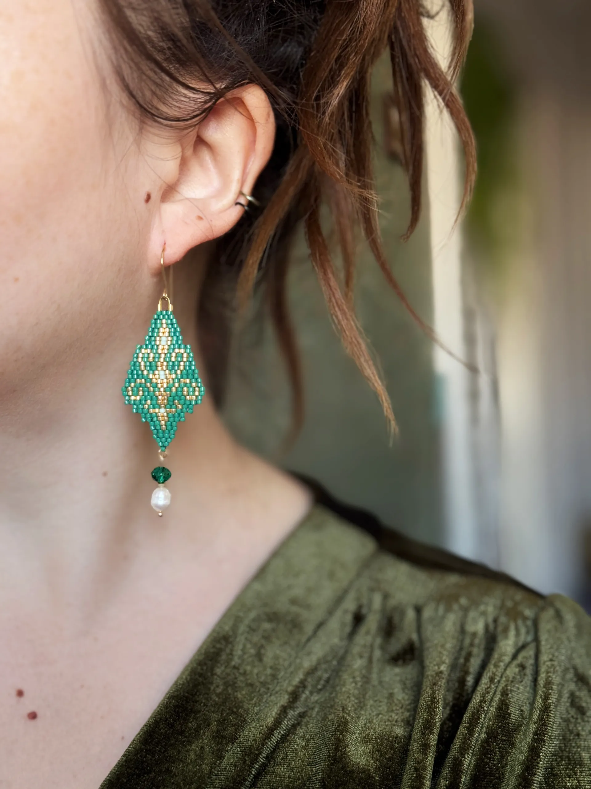 Утончённые серьги с восточным орнаментом из бисера малахитового цвета. Слетены по авторской схеме.
