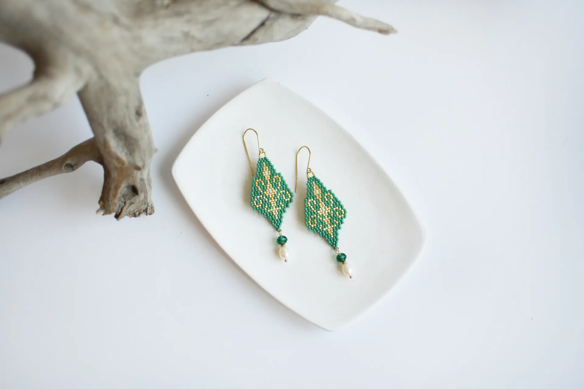 Белые серьги с восточным узором по авторской схеме.